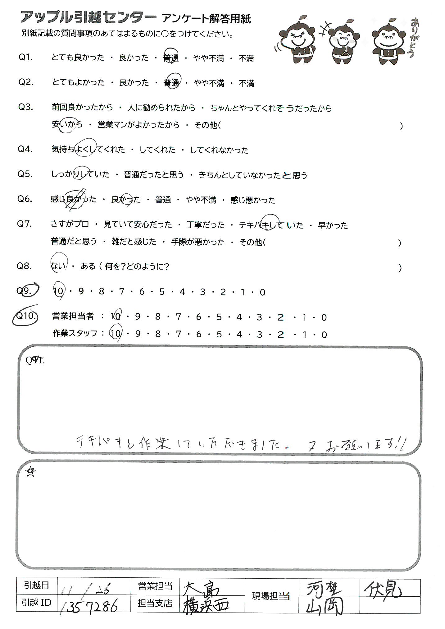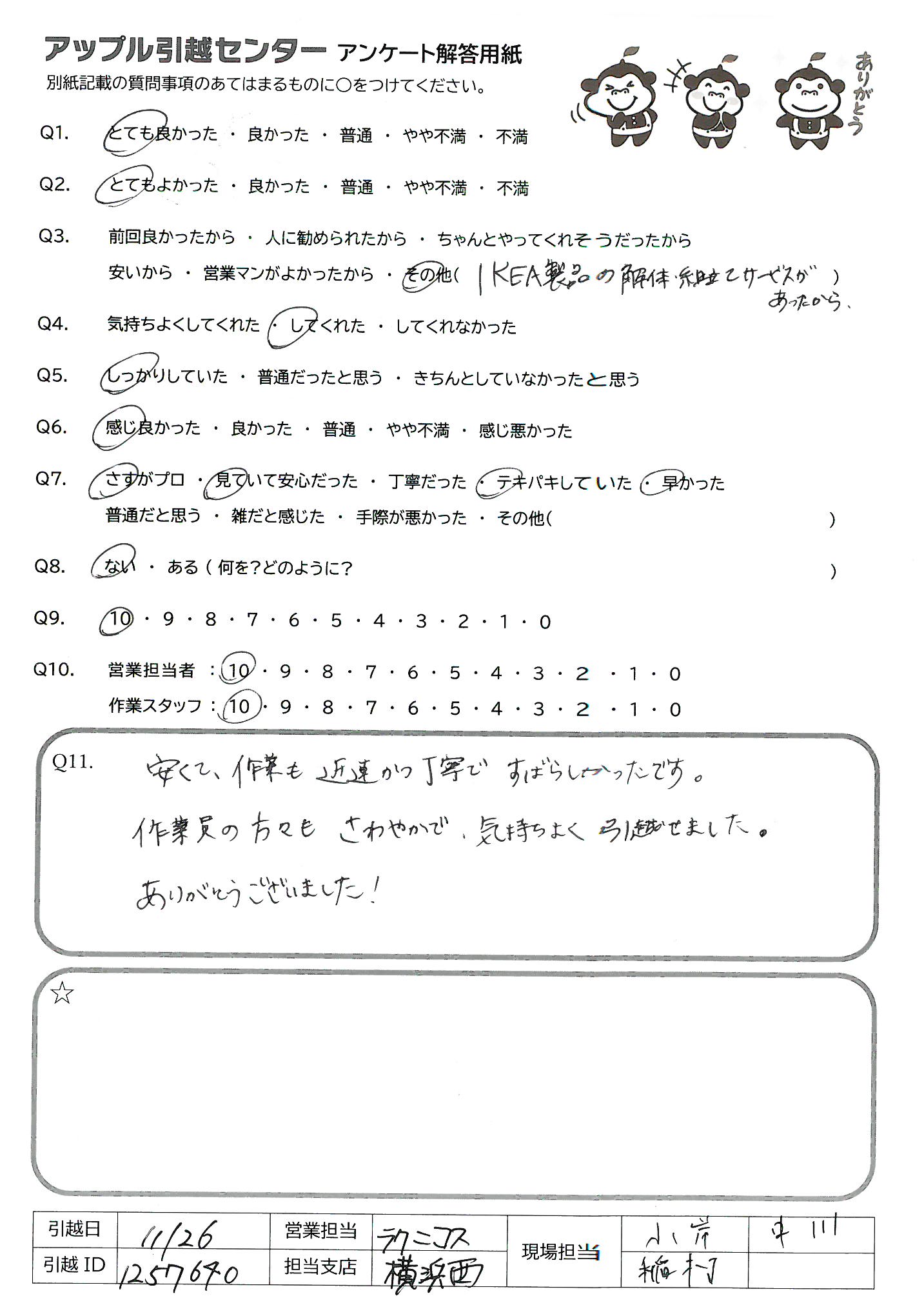 引越し日:2021年11月26日 エリア:神奈川県横浜市港北区