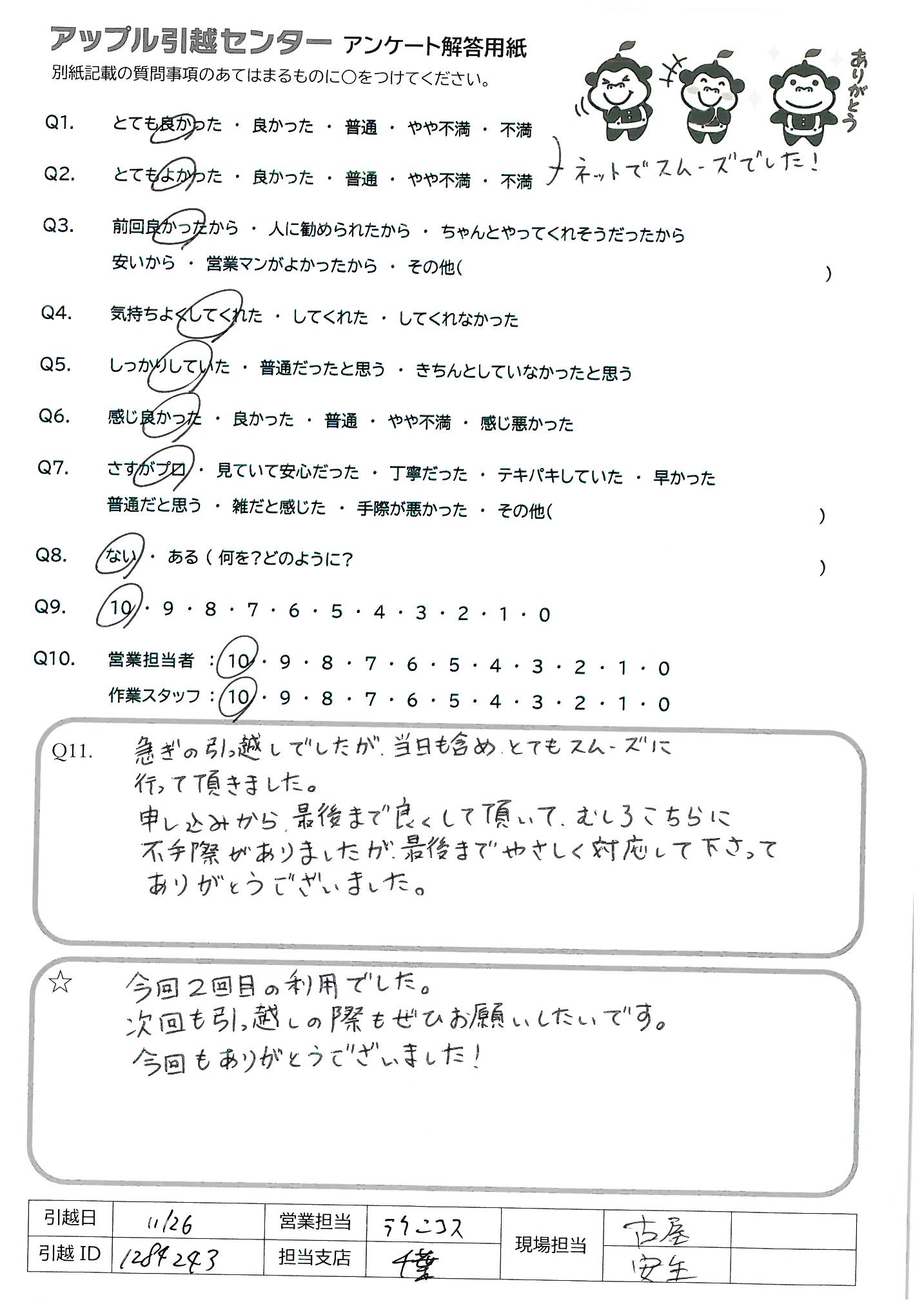 A.今回2回目の利用でした。 次回も引っ越しの際もぜひお願いしたいです。 今回もありがとうございました!