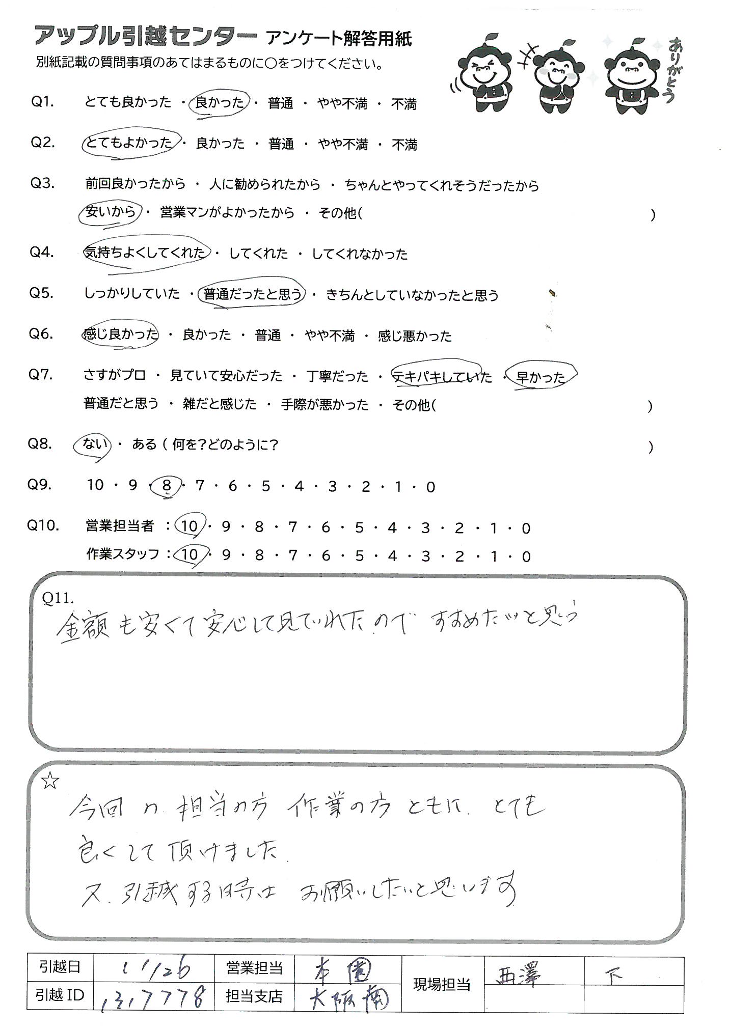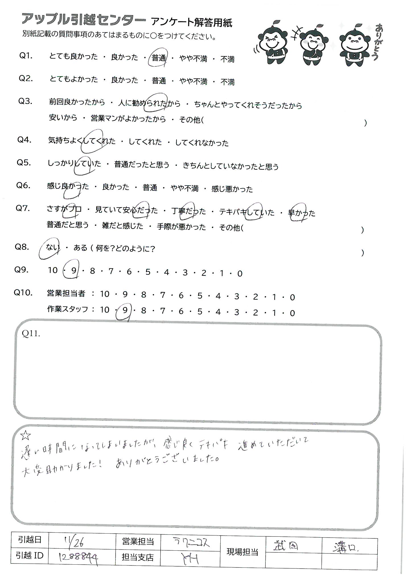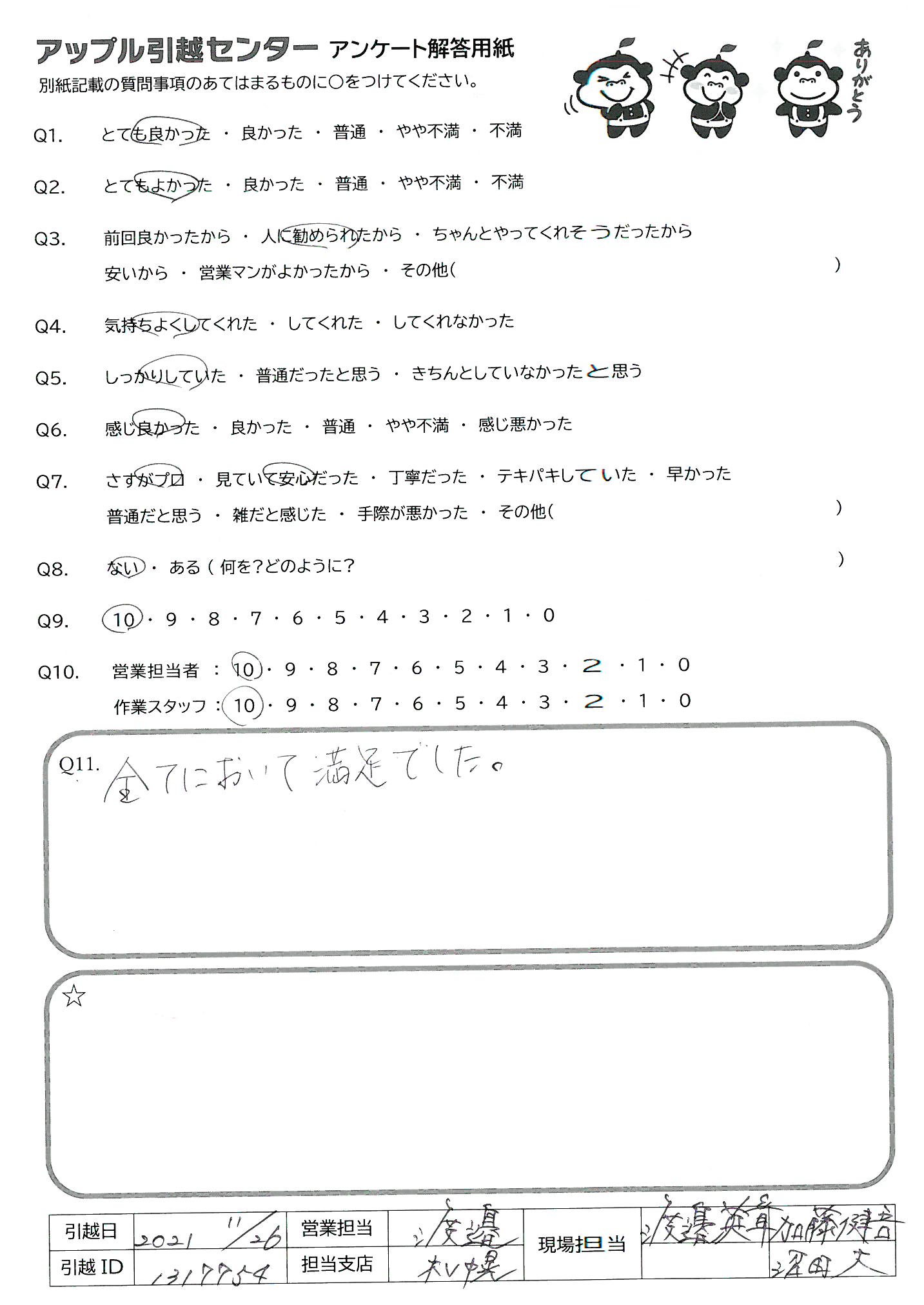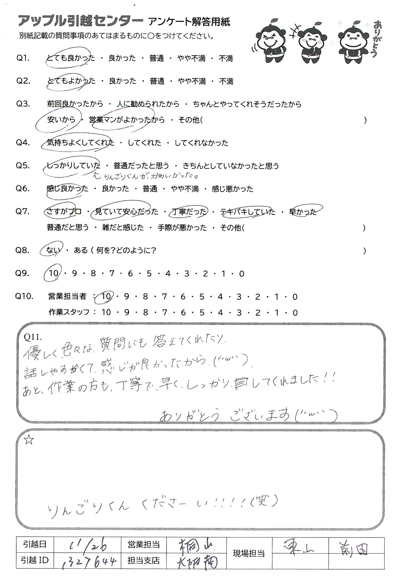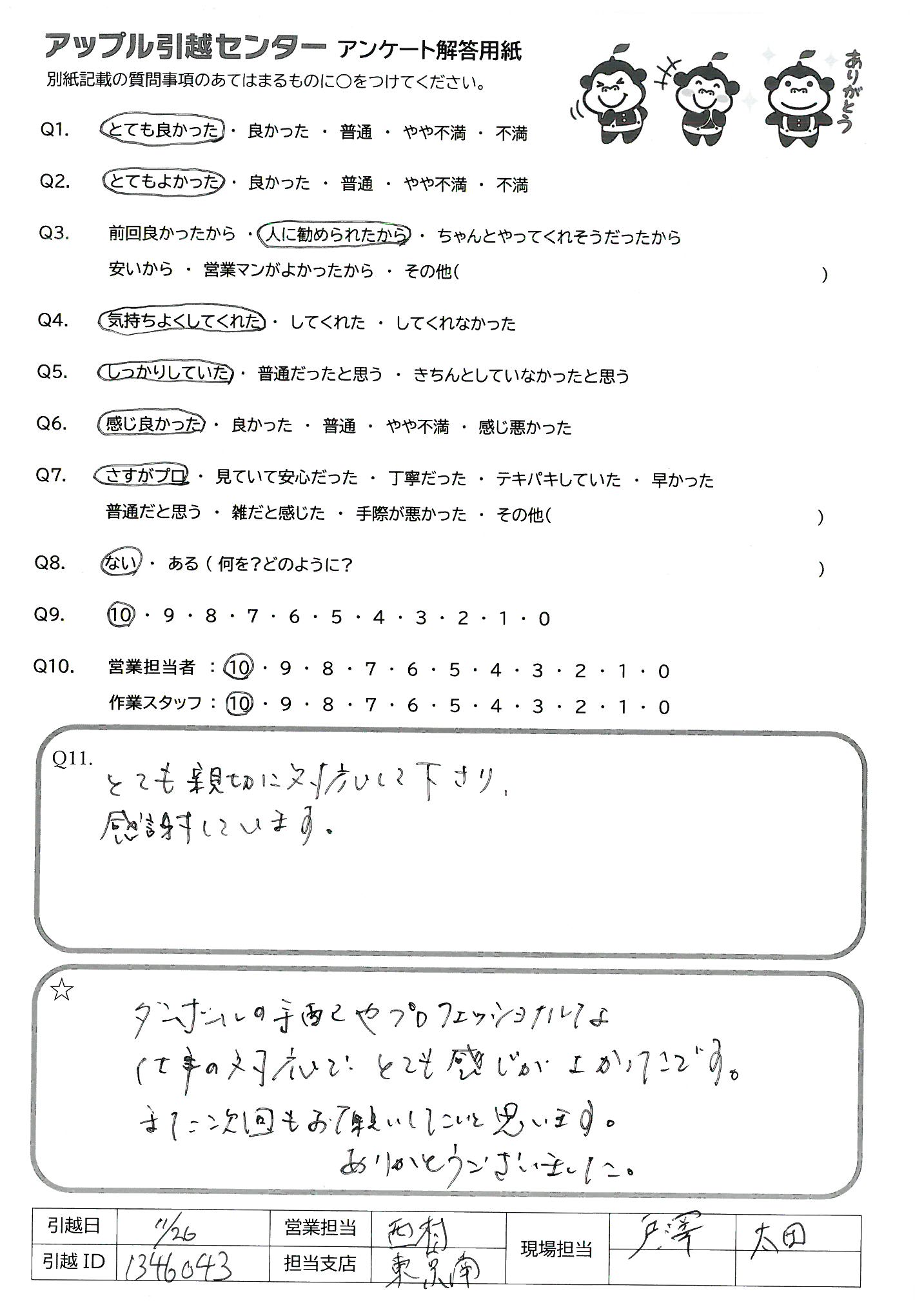 A.今回の担当の方作業の方ともにとても良くして頂けました。 又、引越する時はお願いしたいと思います。