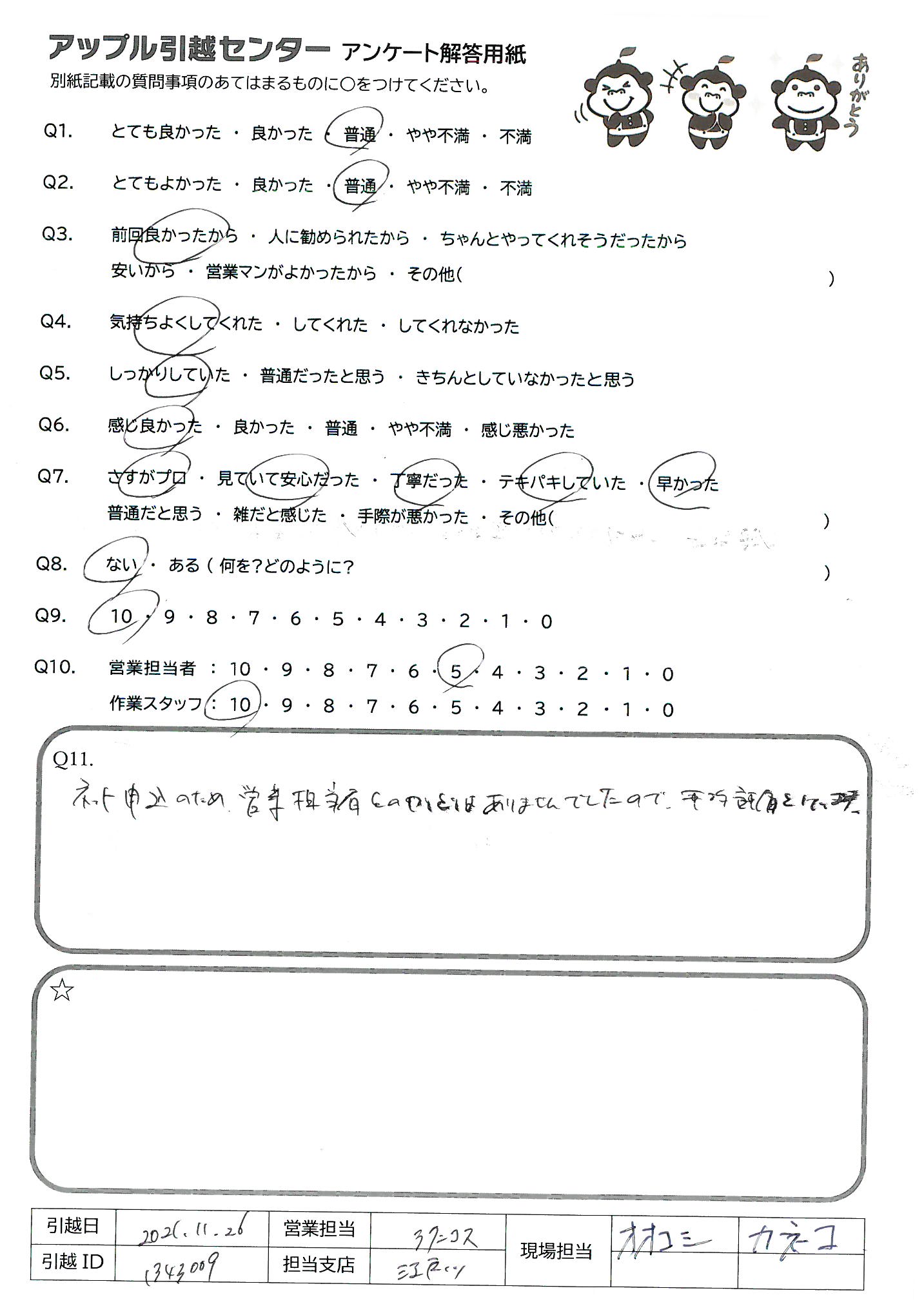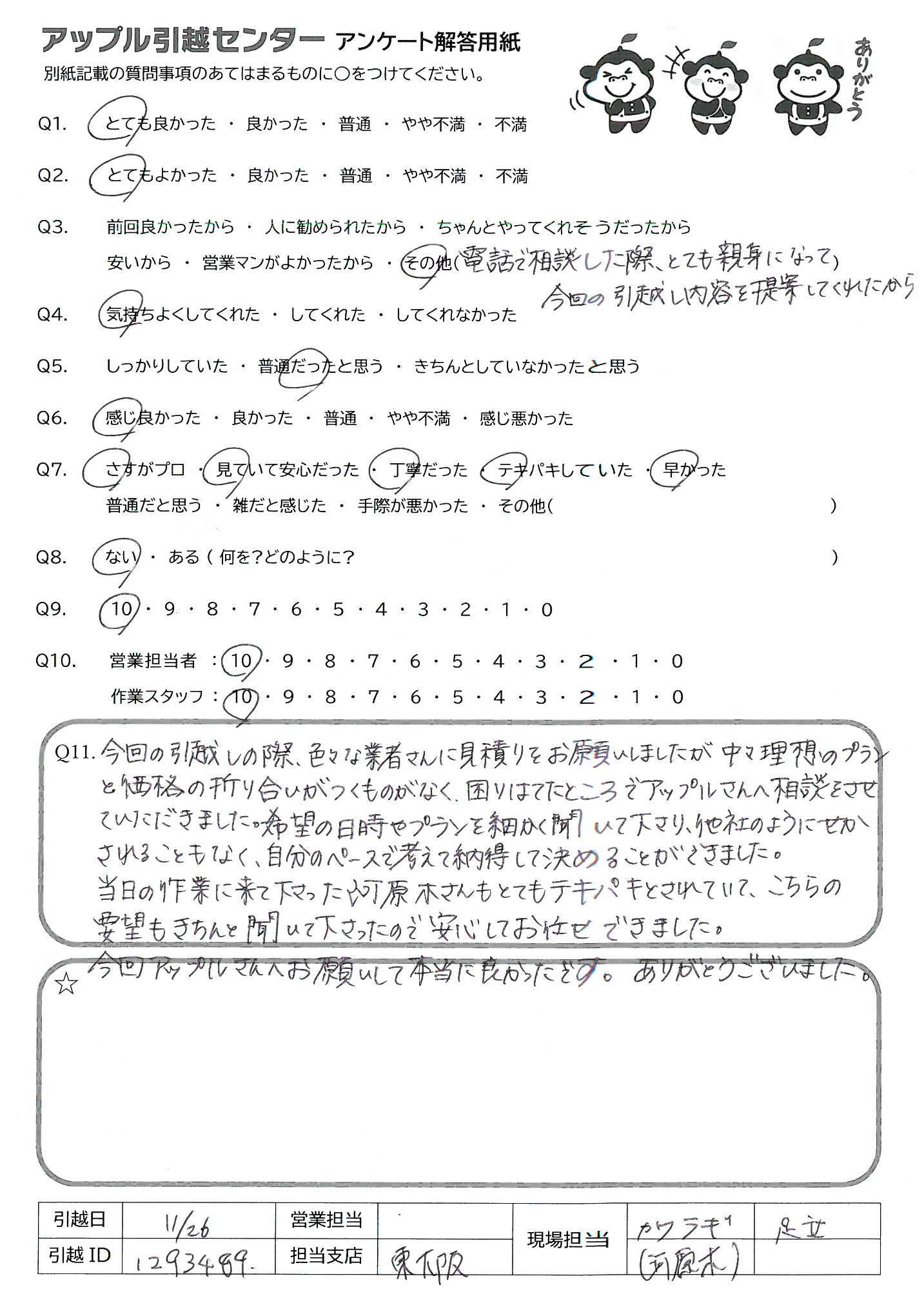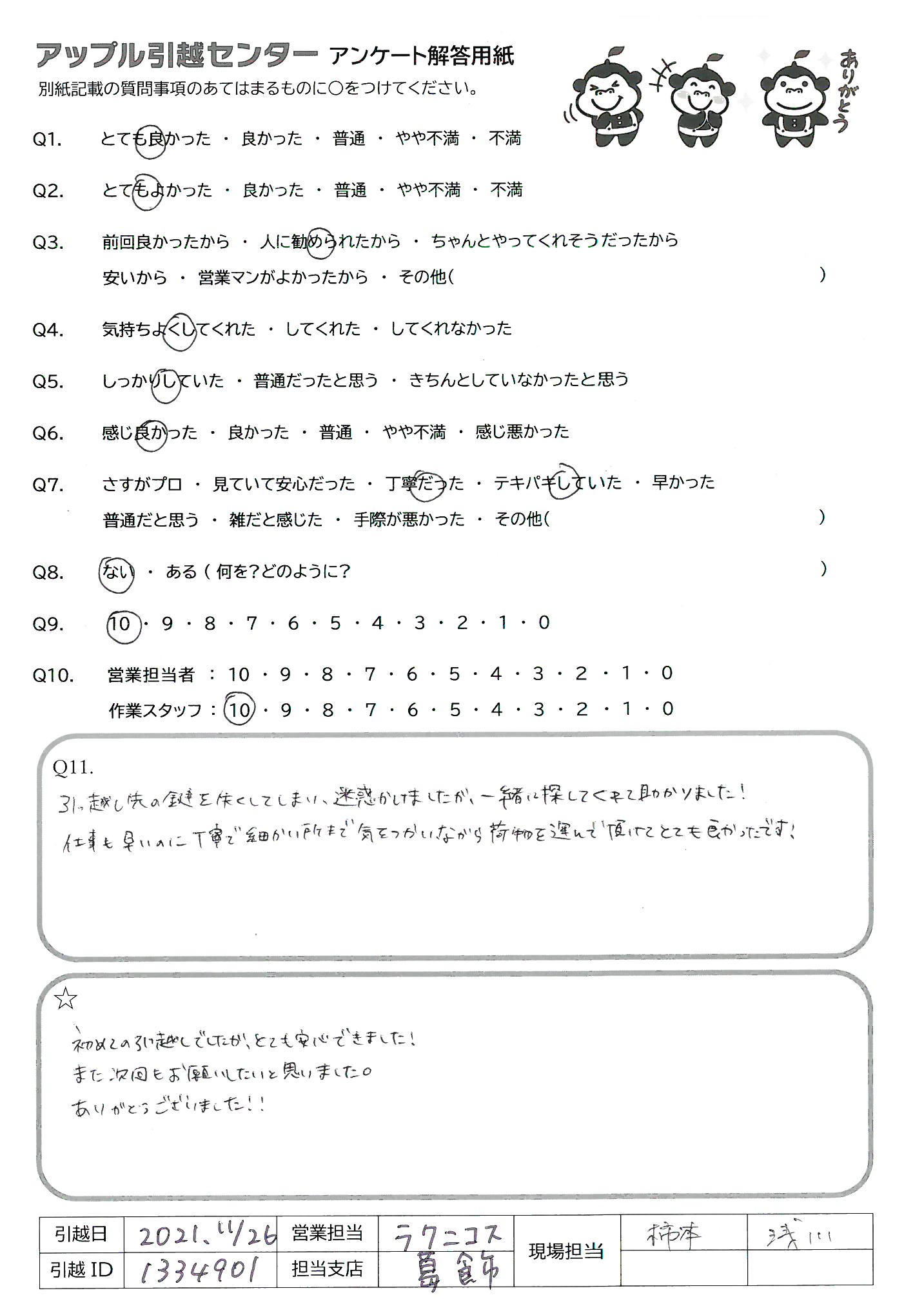 A.初めての引っ越しでしたが、とても安心できました! また、次回もお願いしたいと思いました。 ありがとうございました!!