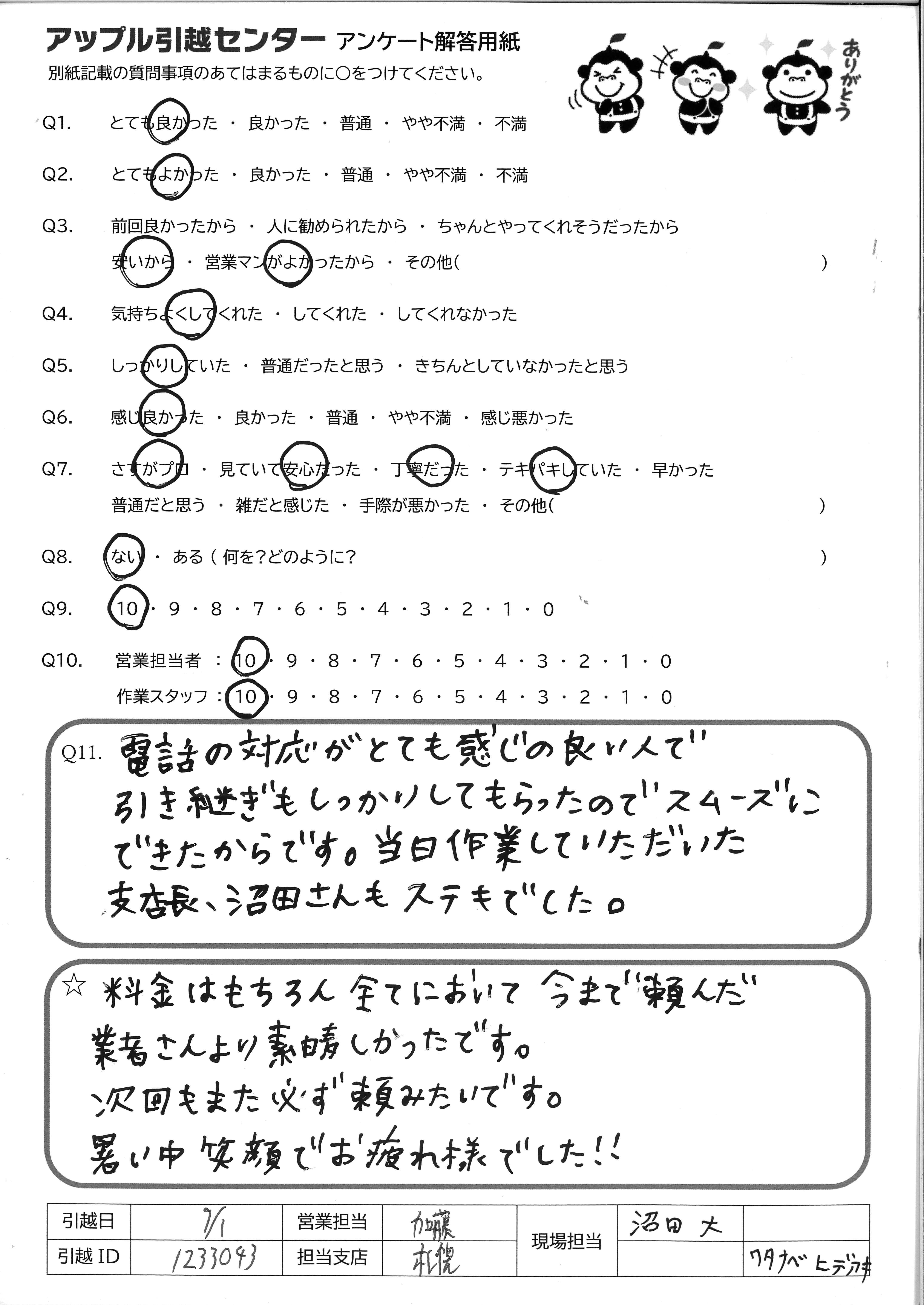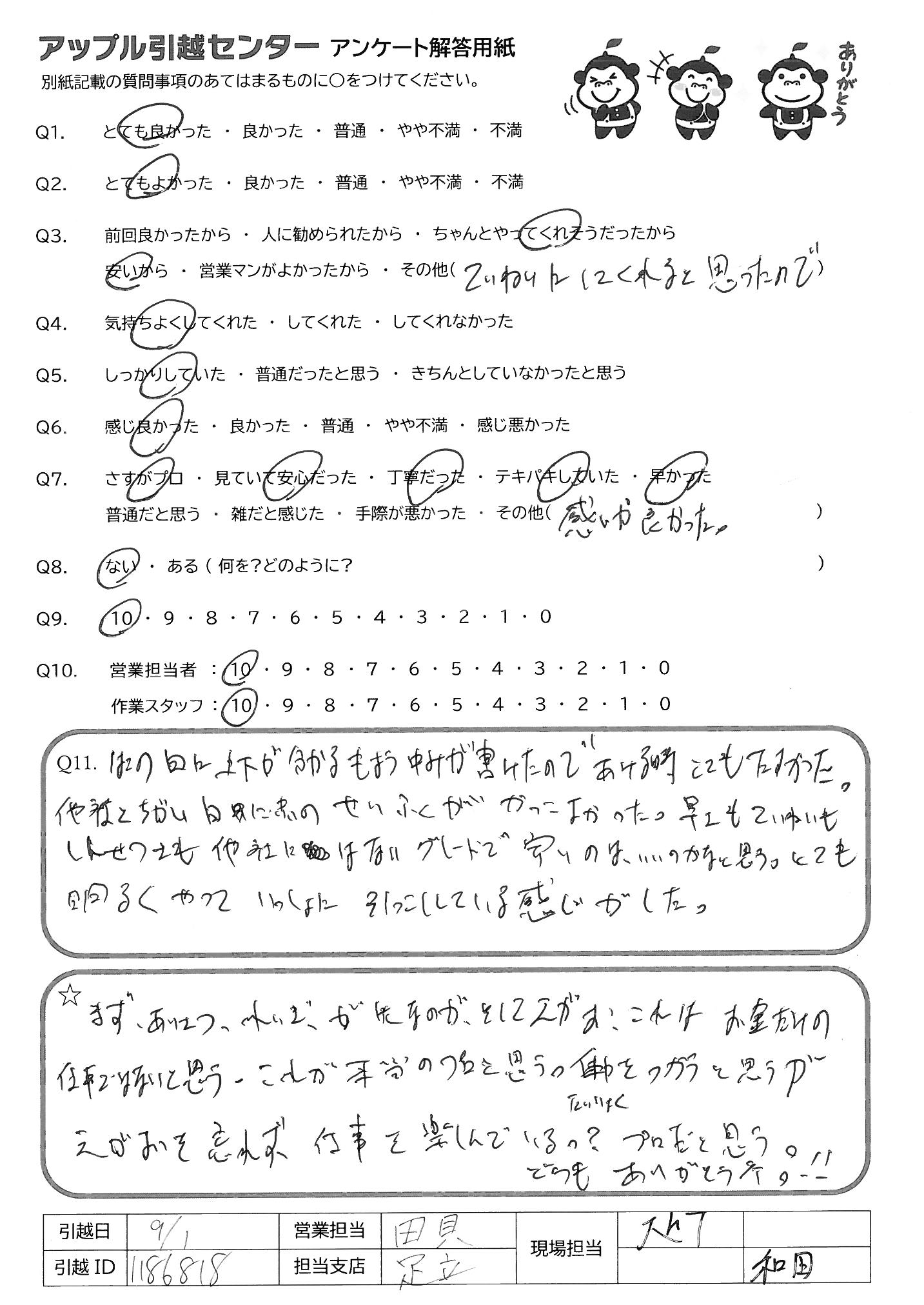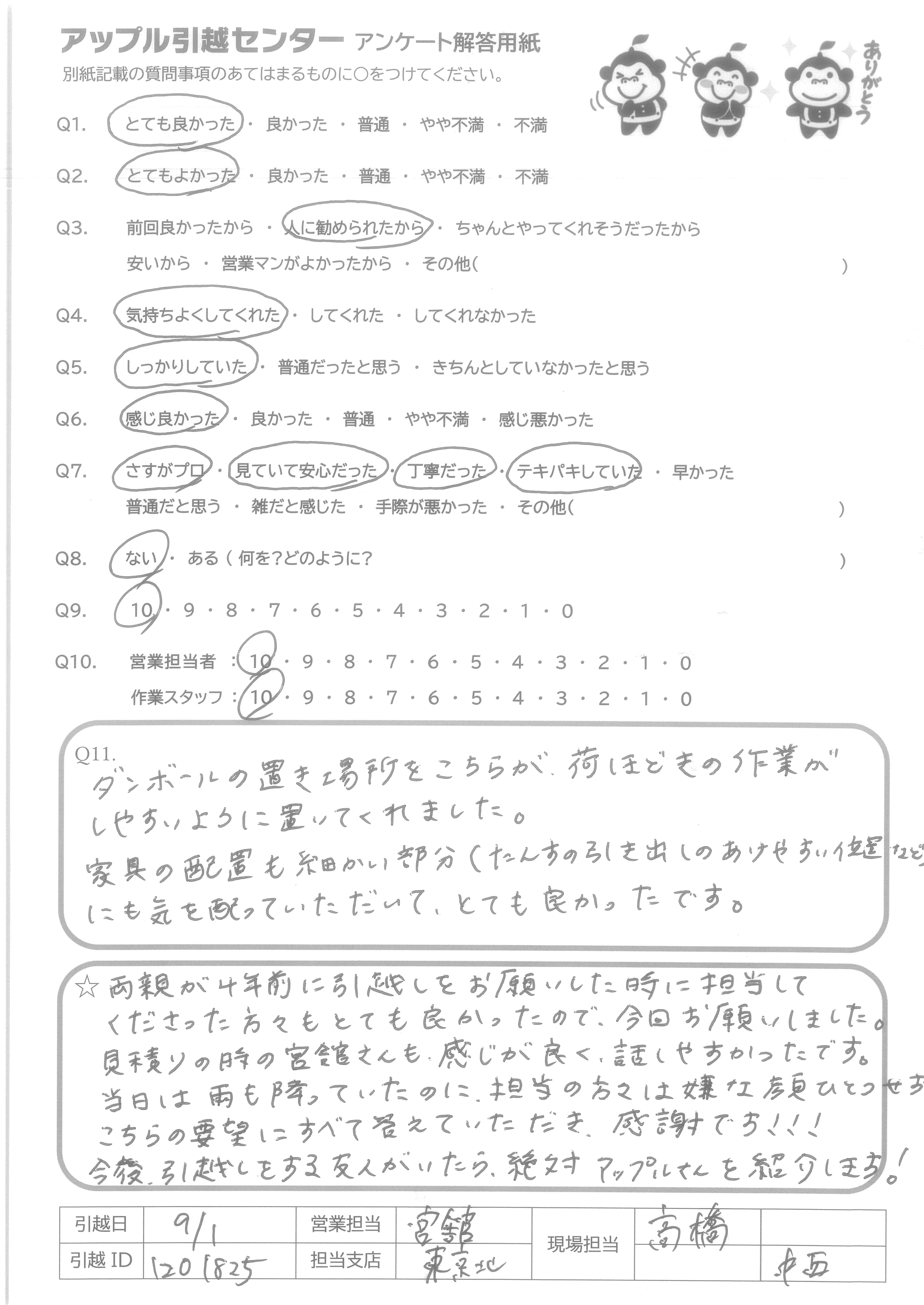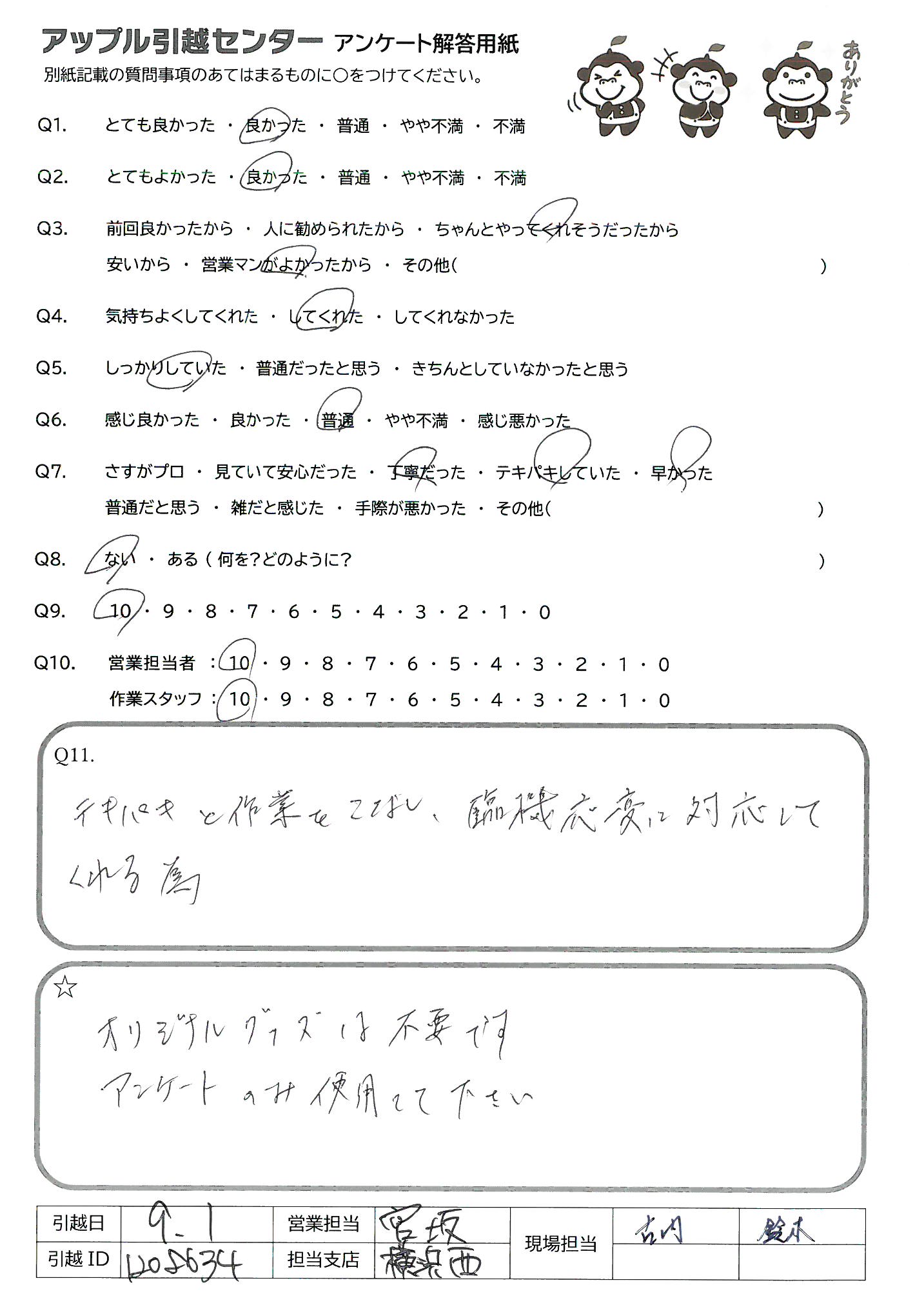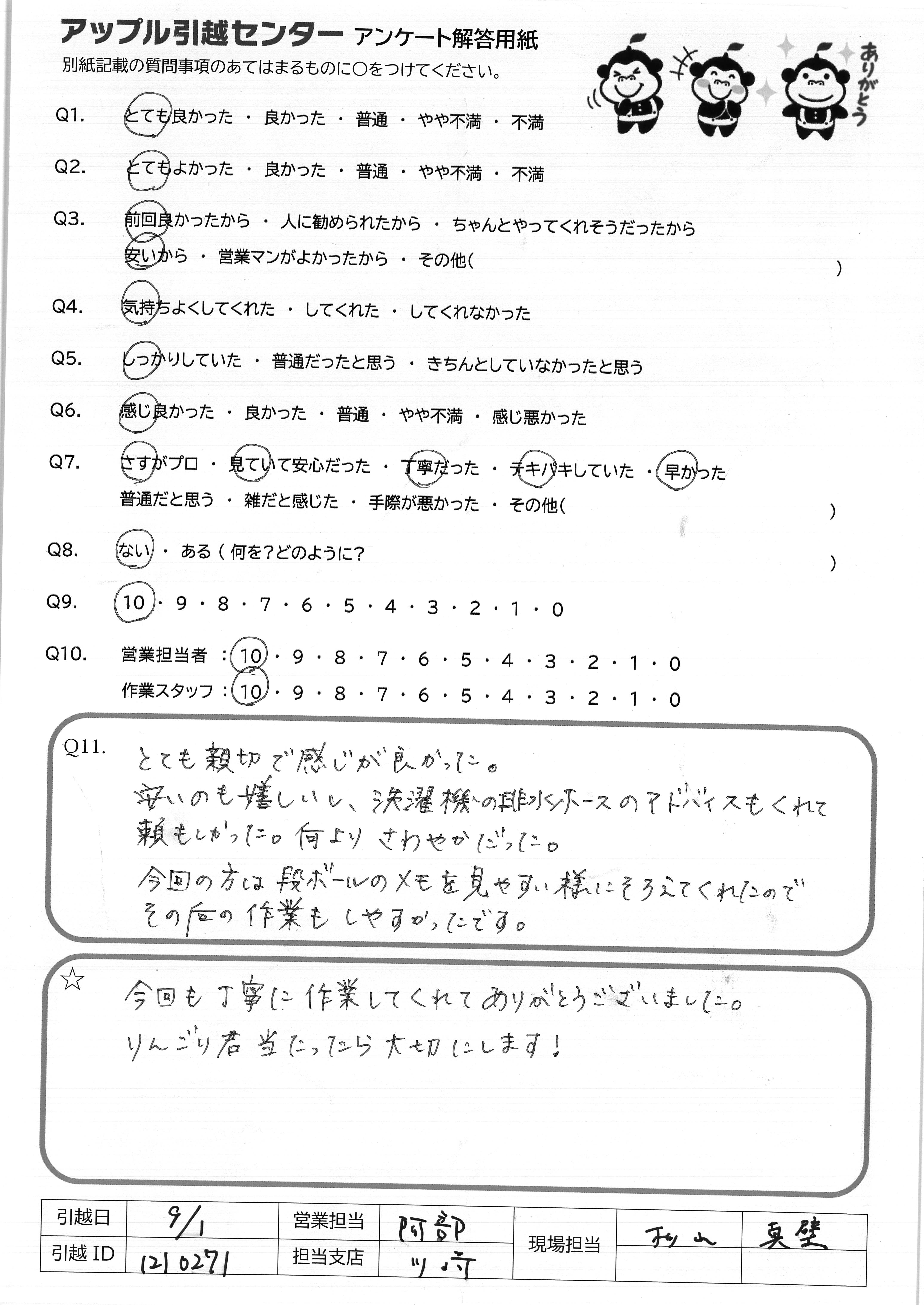 A.両親が4年前に引越しをお願いした時に担当してくださった方々もとても良かったので、今回お願いしました。 見積りの時の宮館さんも感じが良く、話しやすかったです。 当日は雨も降っていたのに担当の方々は嫌な顔ひとつせずこちらの要望にすべて答えていただき、感謝です!!! 今後、引越しをする友人がいたら、絶対アップルさんを紹介します!