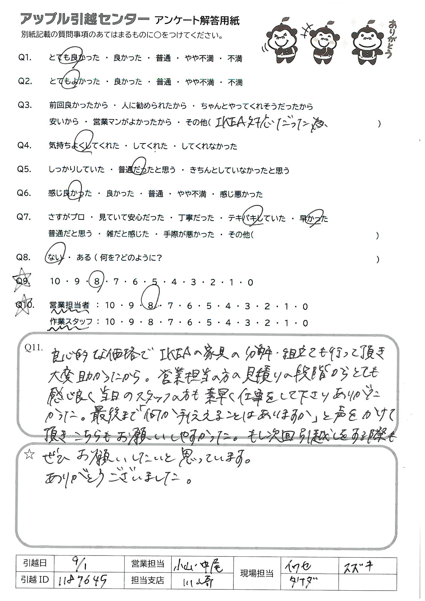 A.良心的な価格でIKEA家具の分解・組立て行って頂き大変助かったから。営業担当の方の見積りの段階からとても感じ良く当日のスタッフの方も素早く仕事をして下さりありがたかった。最後まで「何か手伝えることはありますか」と声をかけて頂きこちらもお願いしやすかった。もし次回引越しをする際も