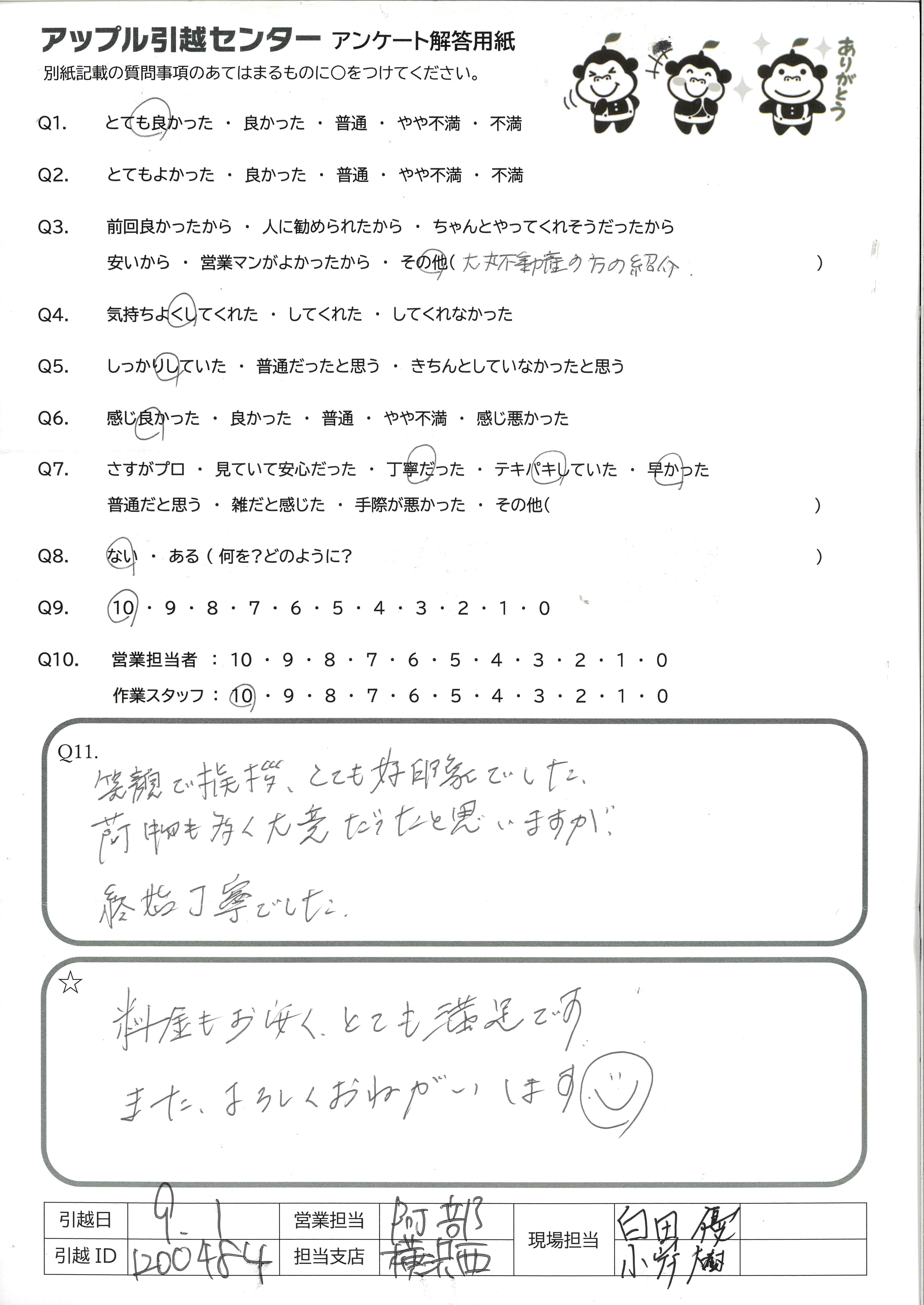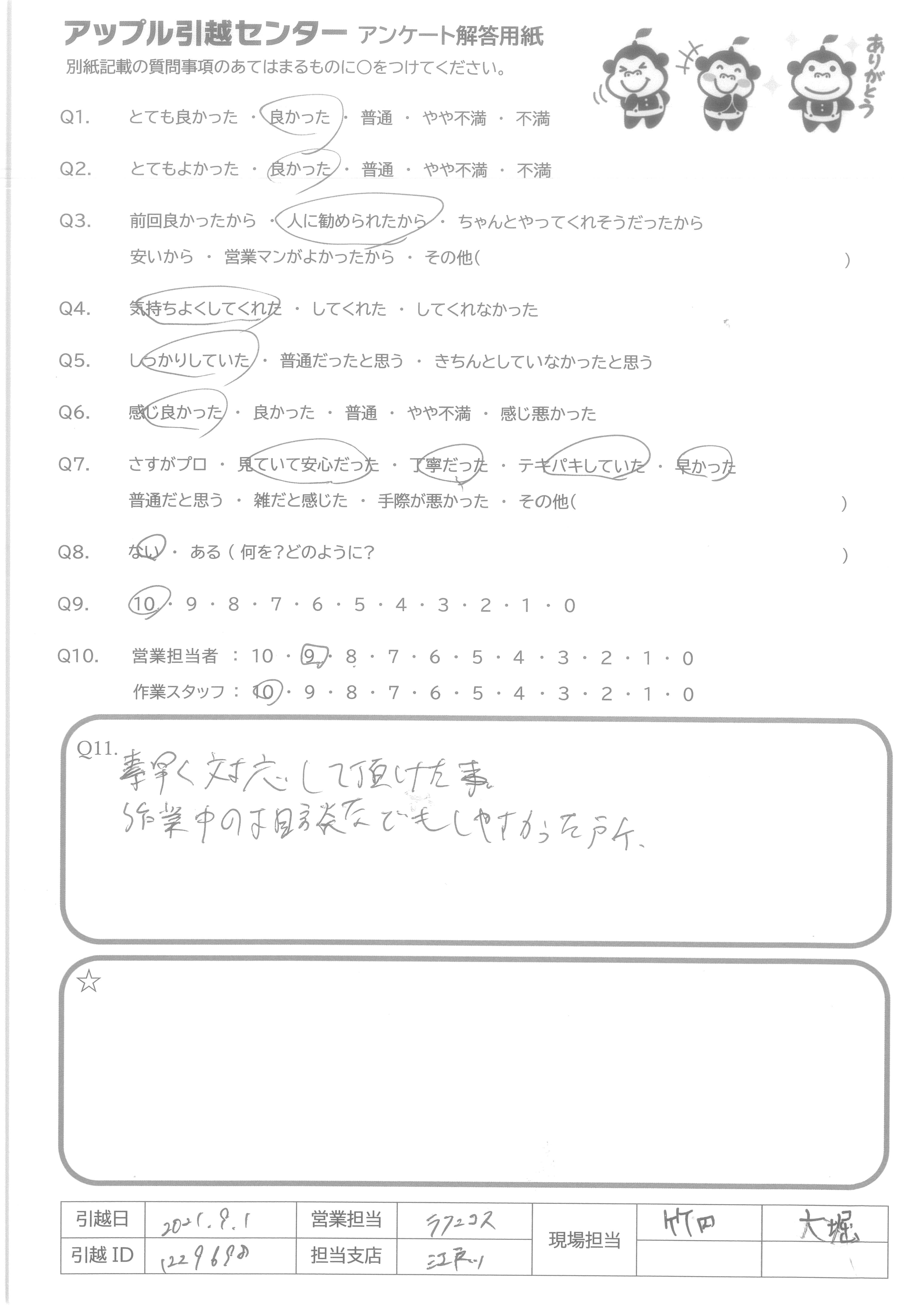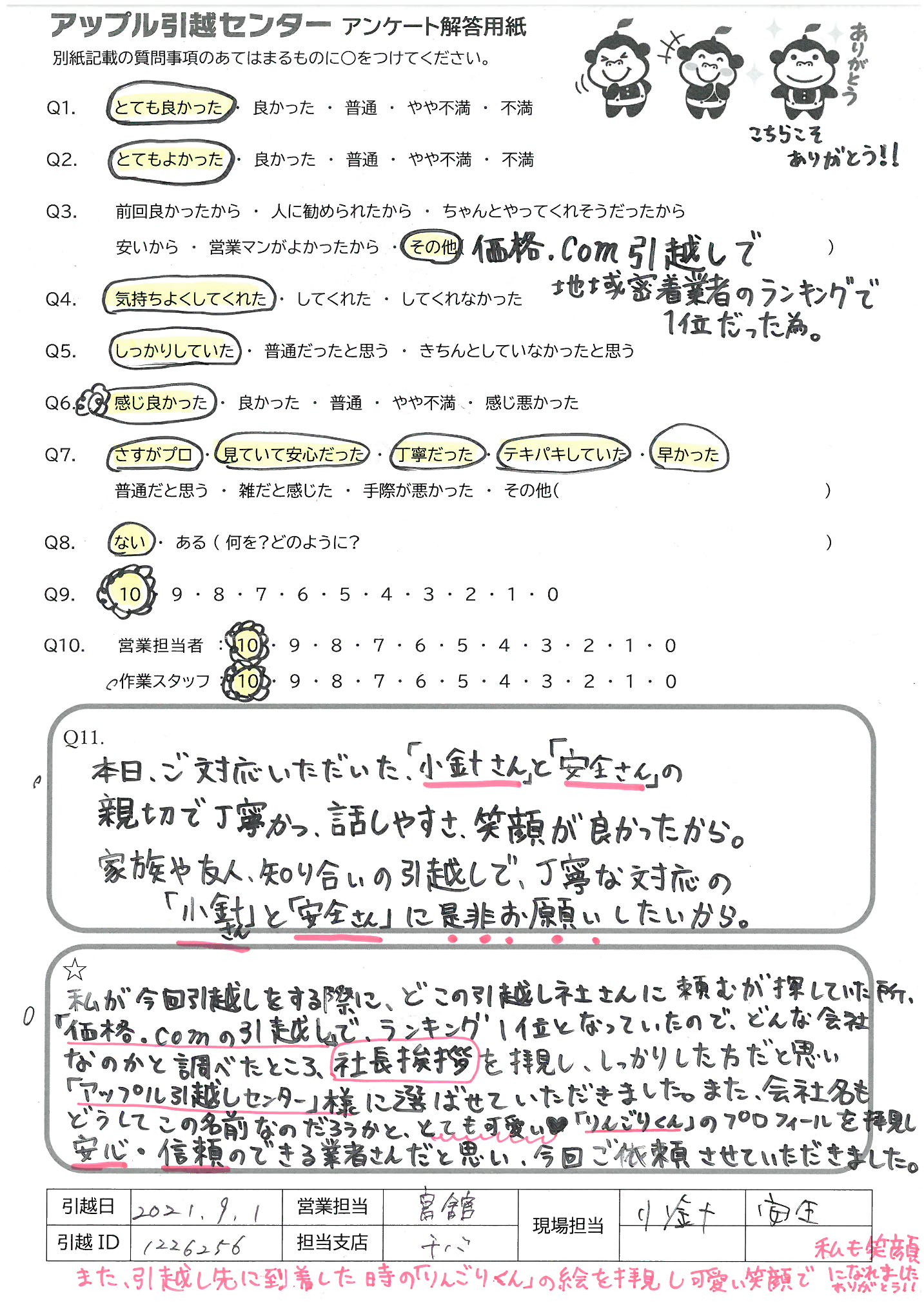 A.本日、ご対応いただいた「小針さん」と「安仝さん」の親切で丁寧かつ、話しやすさ、笑顔が良かったから。 家族や友人、知り合いの引越しで、丁寧な対応の「小針さん」と「安仝さん」に是非お願いしたいから。