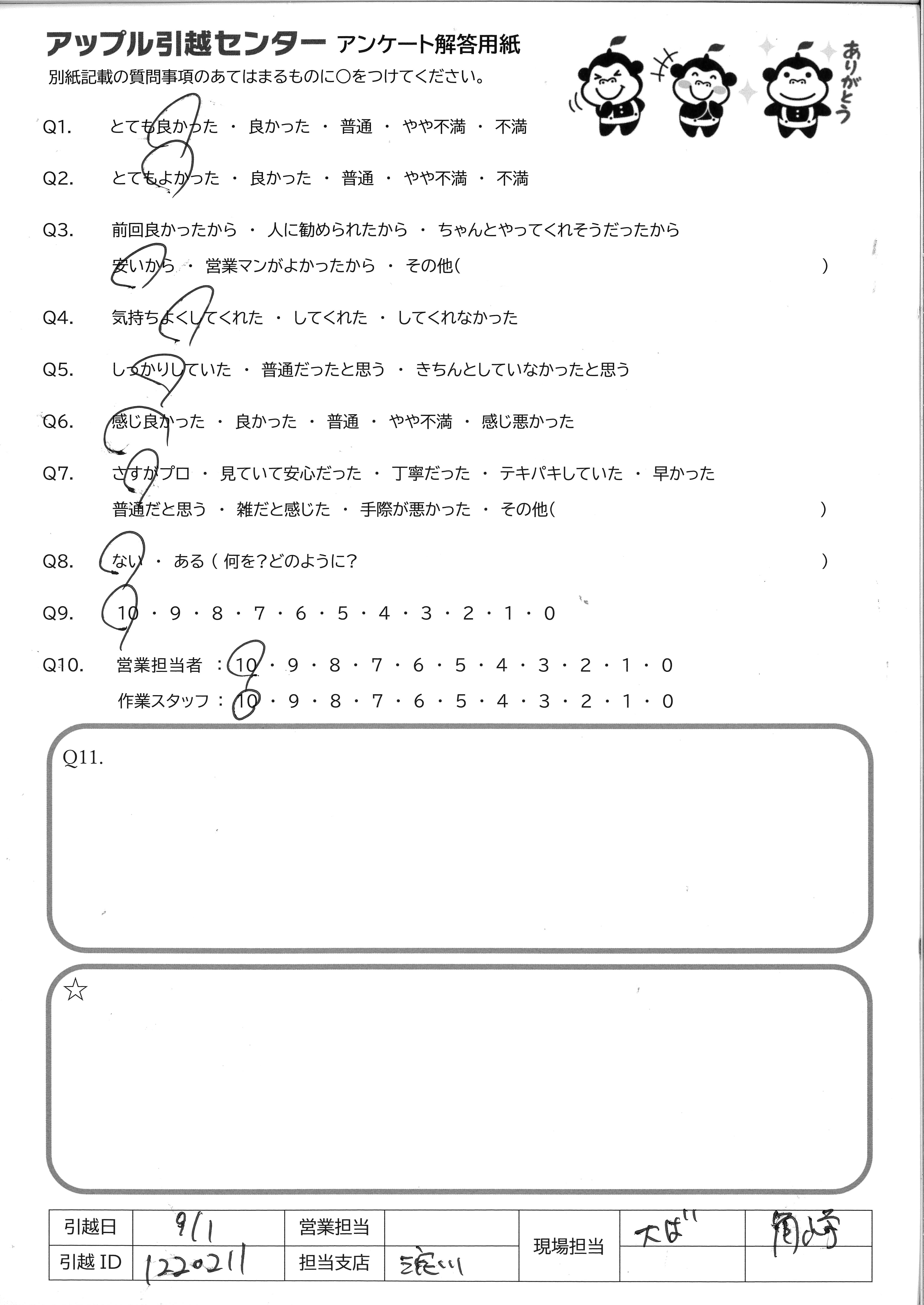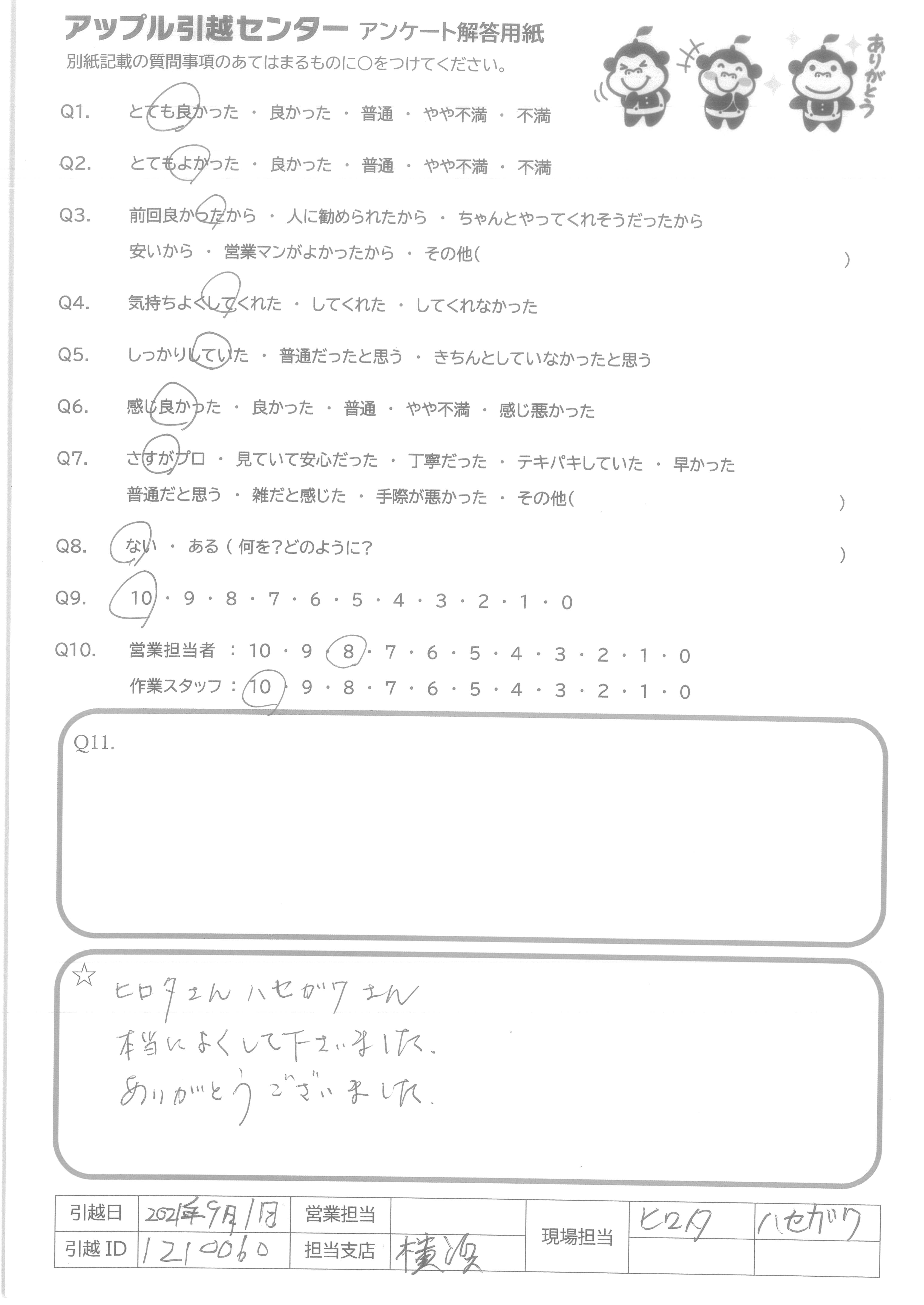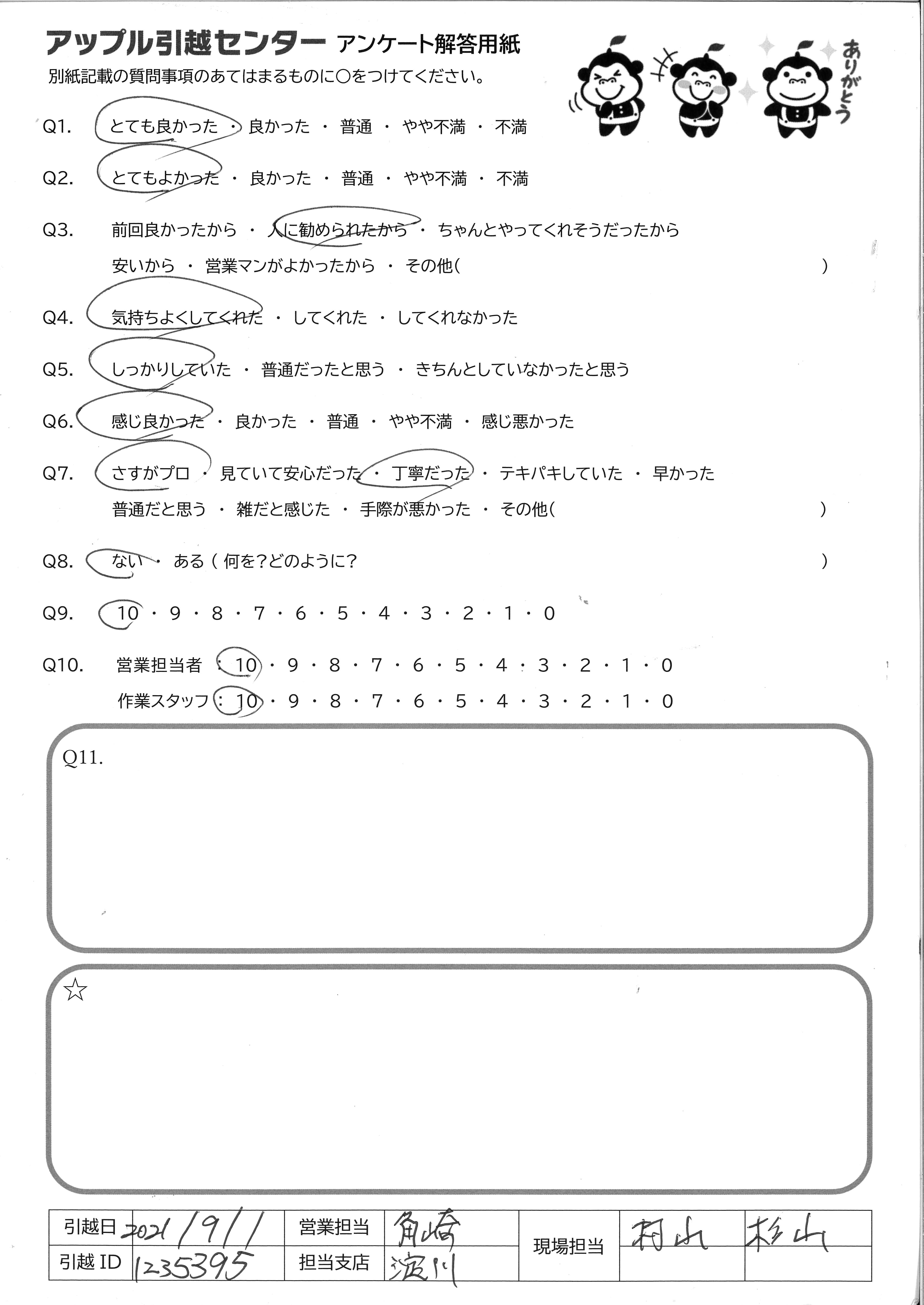 A.本日、ご対応いただいた「小針さん」と「安仝さん」の親切で丁寧かつ、話しやすさ、笑顔が良かったから。 家族や友人、知り合いの引越しで、丁寧な対応の「小針さん」と「安仝さん」に是非お願いしたいから。