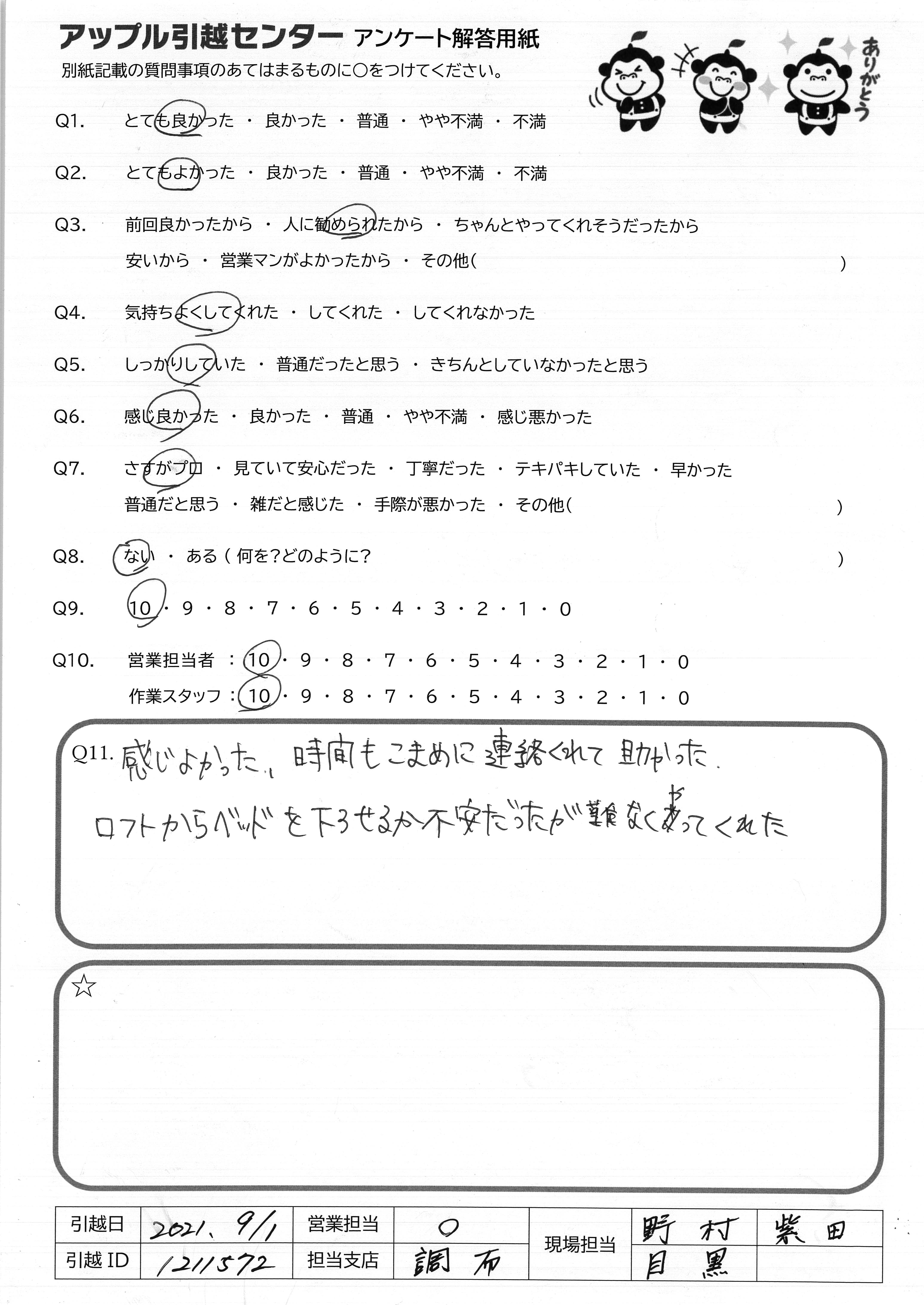 A.感じよかった。時間もこまめに連絡くれて助かった。 ロフトからベッドを下ろせるか不安だったが難なくやってくれた。