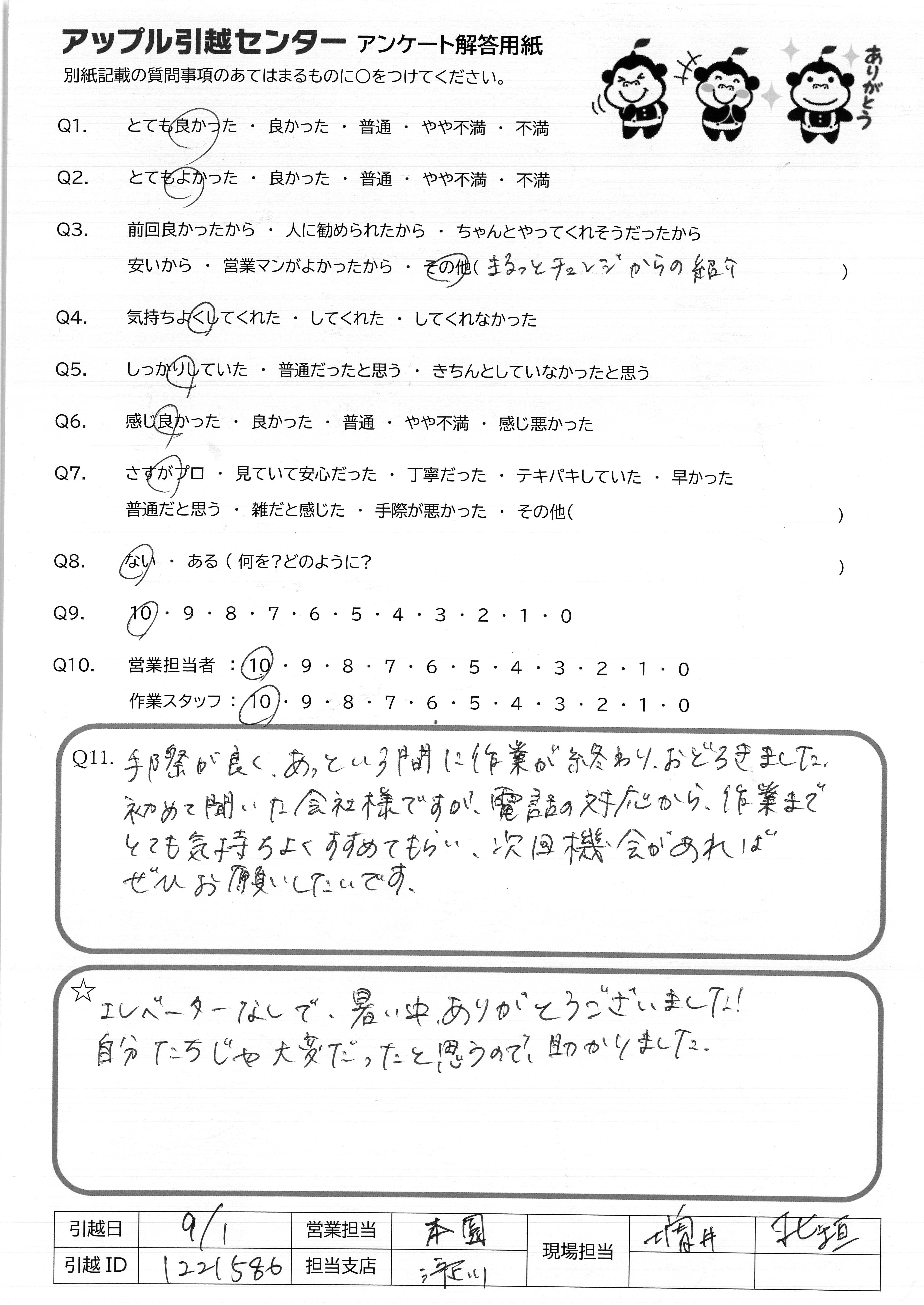 A.エレベーターなしで、暑い中ありがとうございました! 自分たちじゃ大変だったと思うので、助かりました。