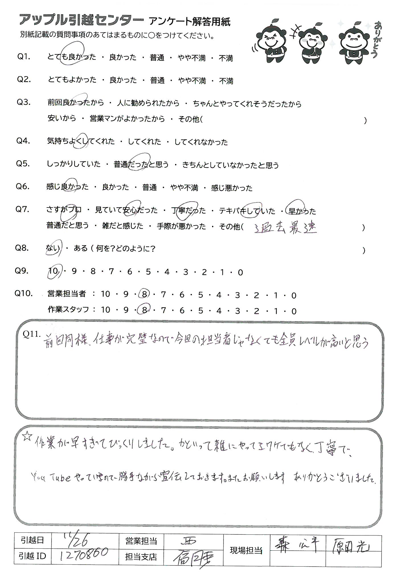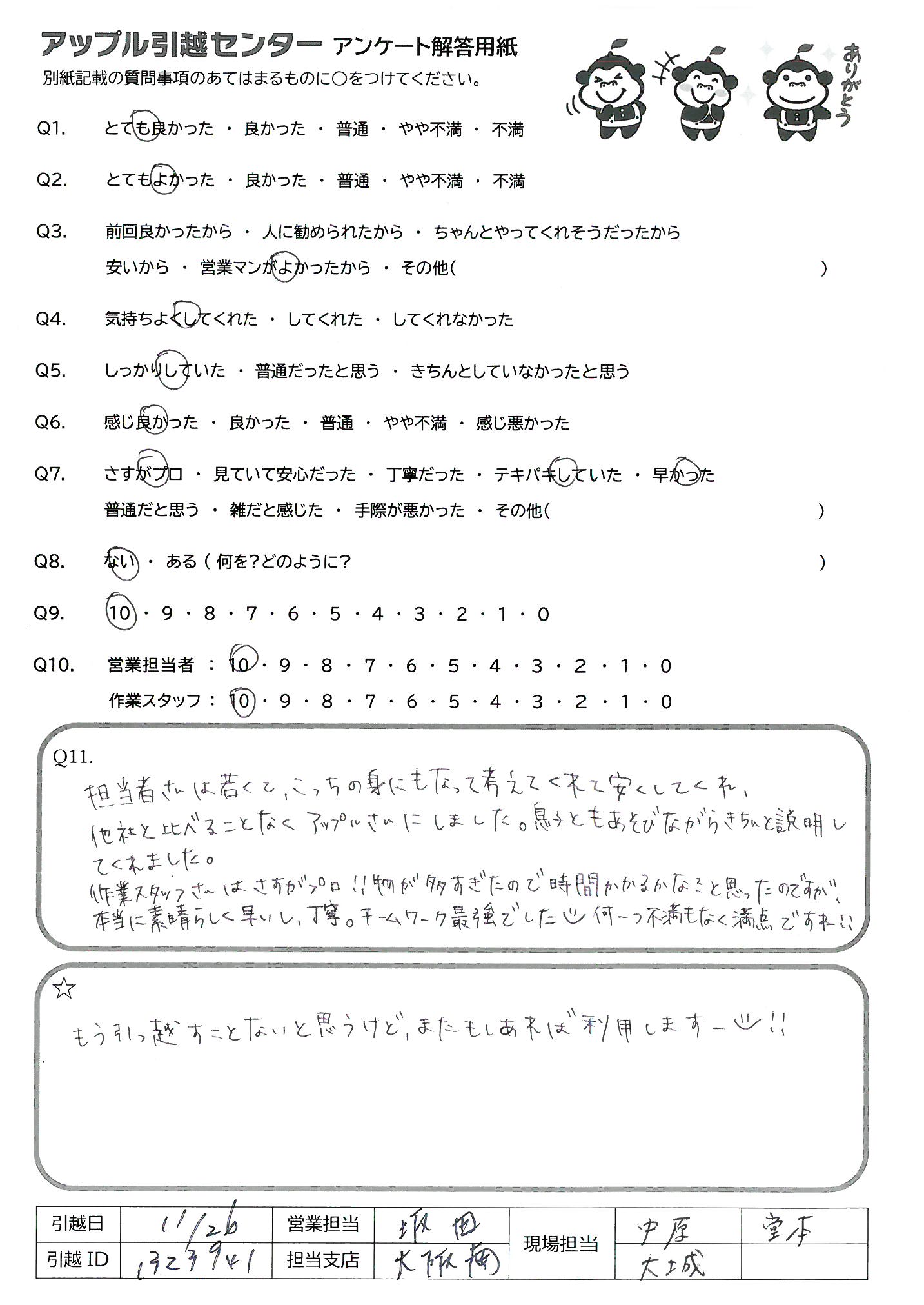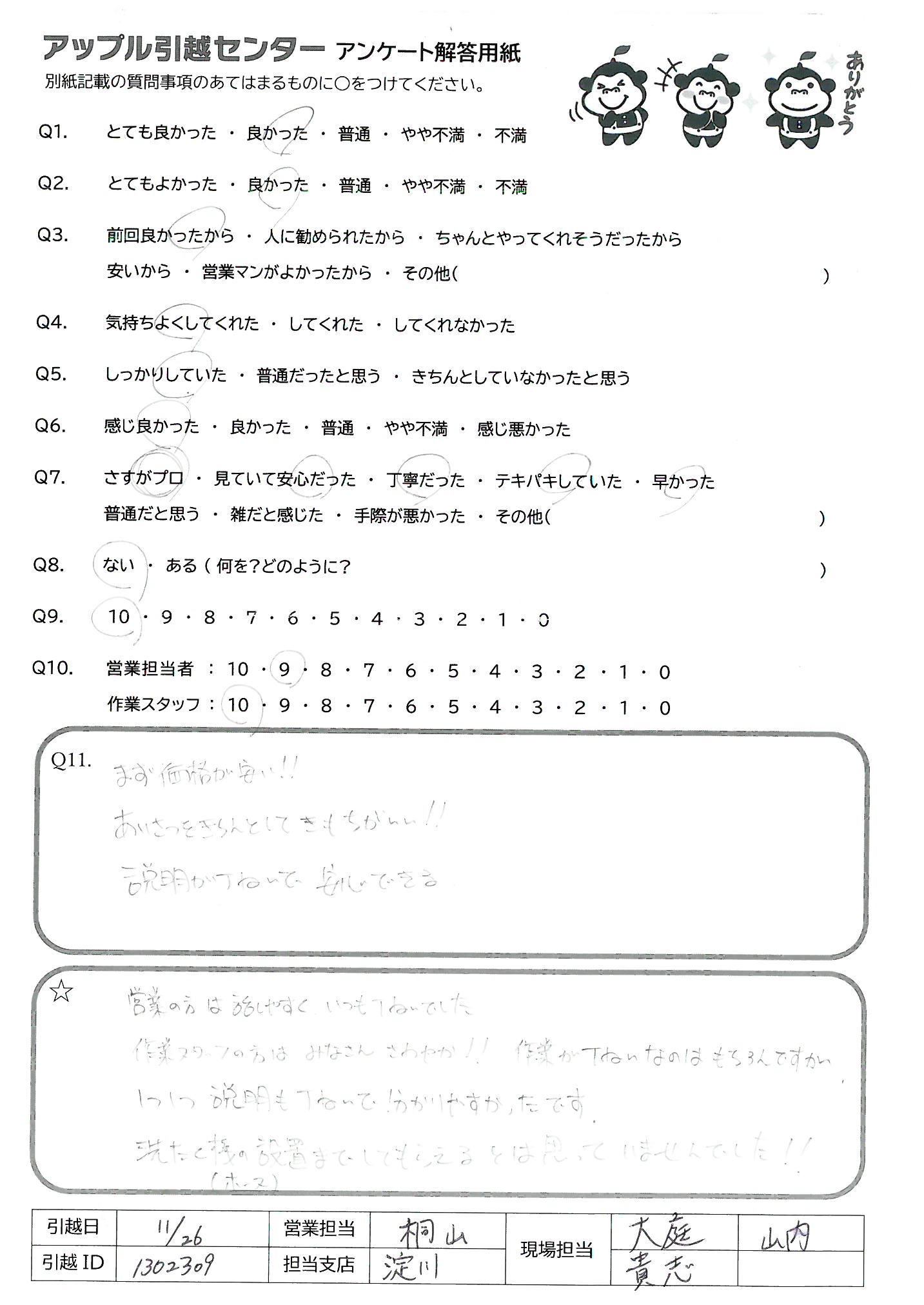 A.この度は、本当にお世話になりました。 アップルさんにお任せして正解でした! 次回、引越しすることがあったらまたお願いしたいです! ありがとうございました!