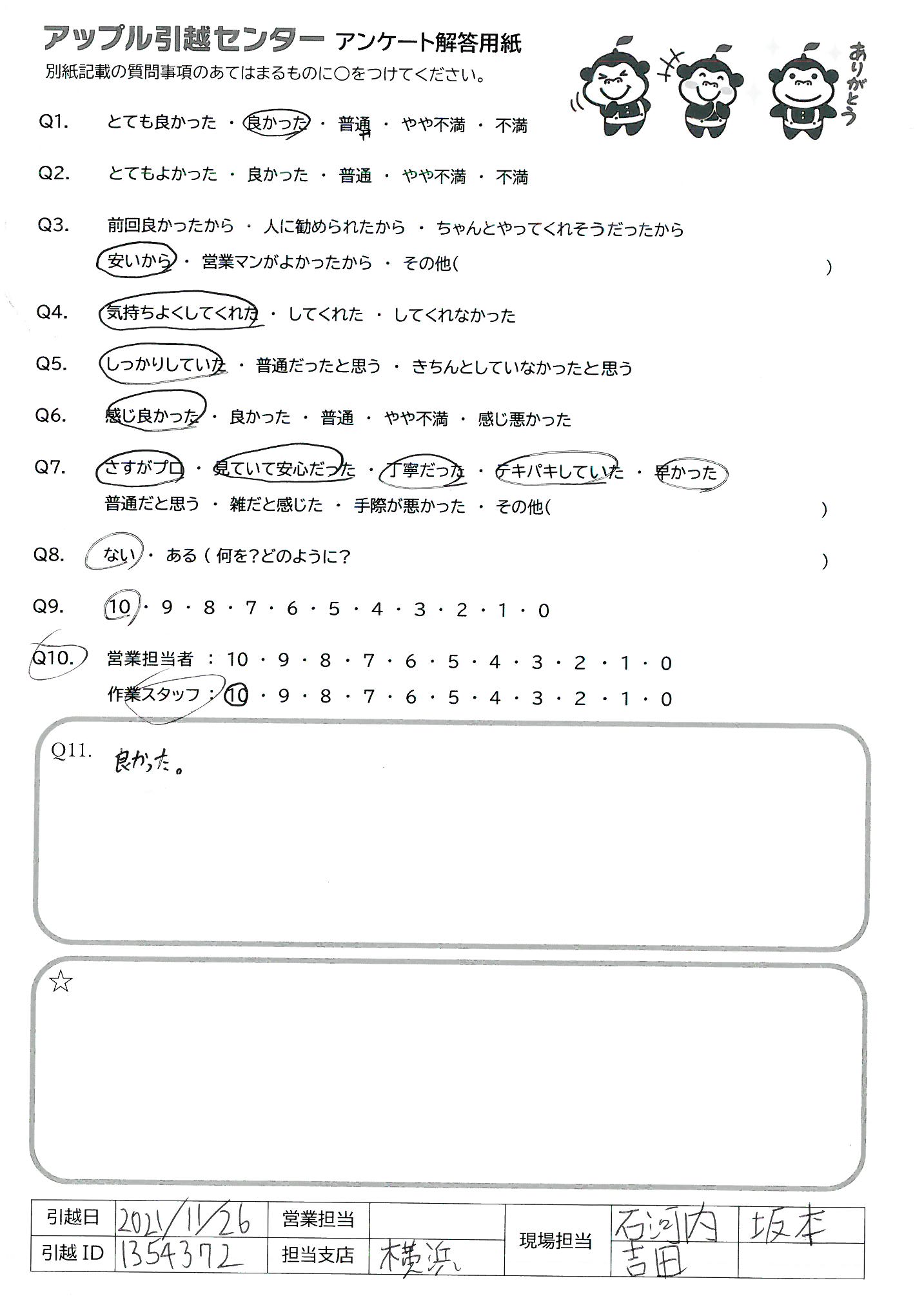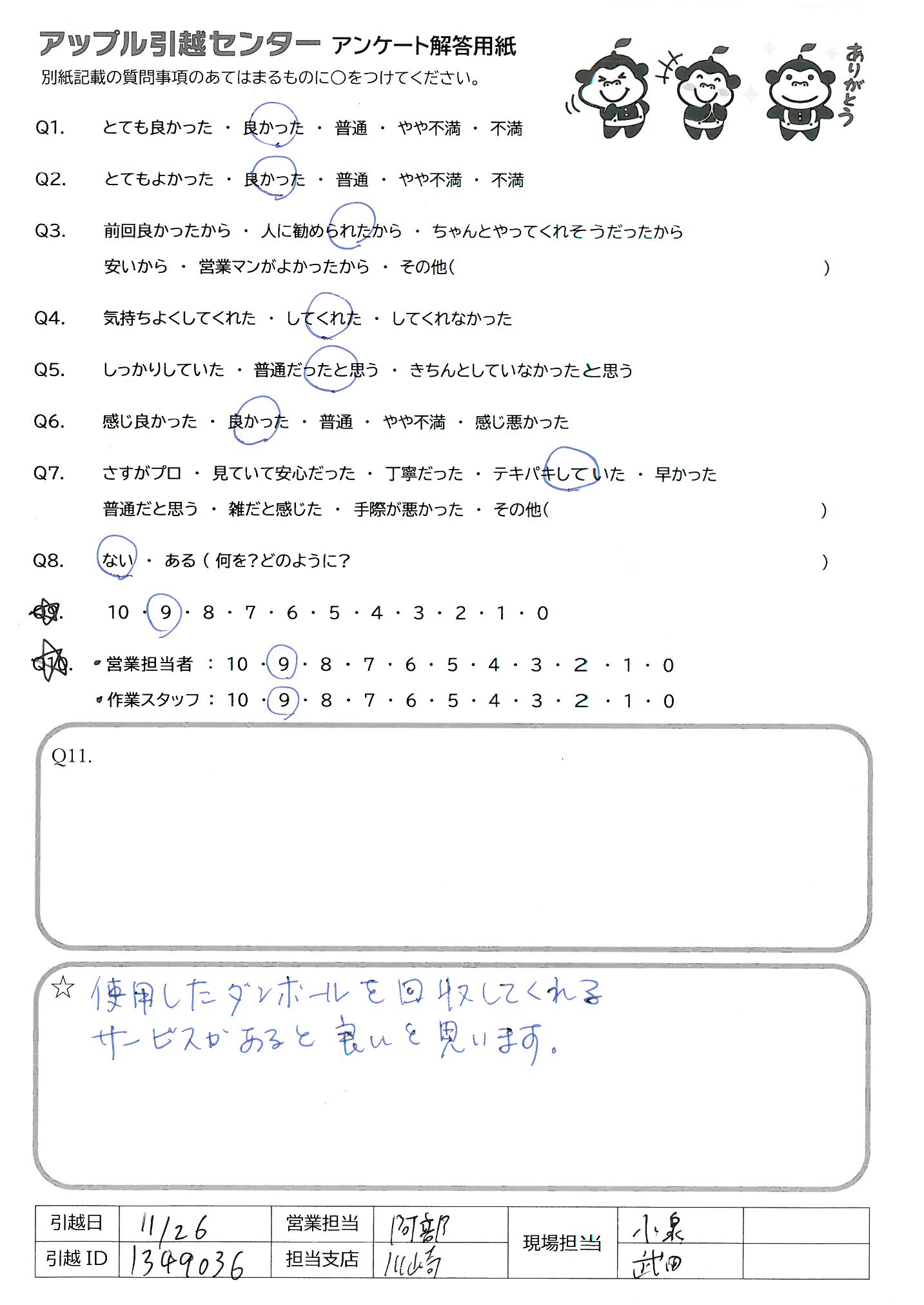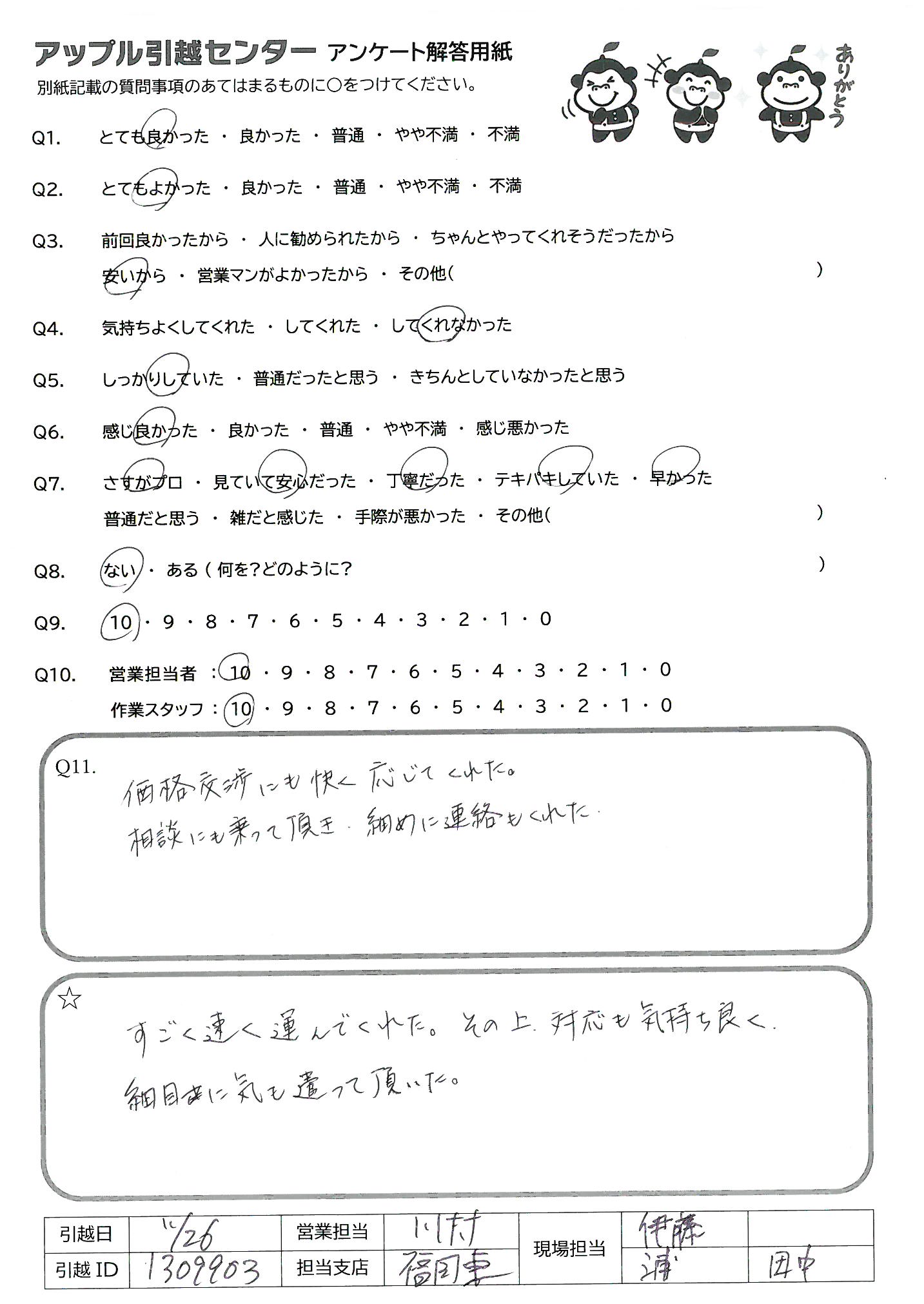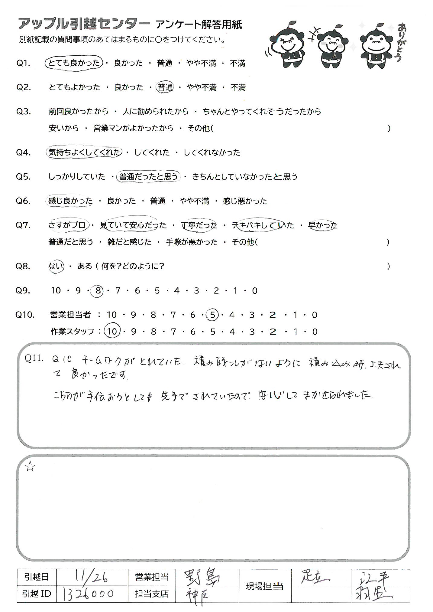 A.Q10 チームワークがとれていた 積み残しがないように積み込みの時、工夫されて良かったです。 こちらが手伝おうとしても先手でされていたので安心してまかせられました。