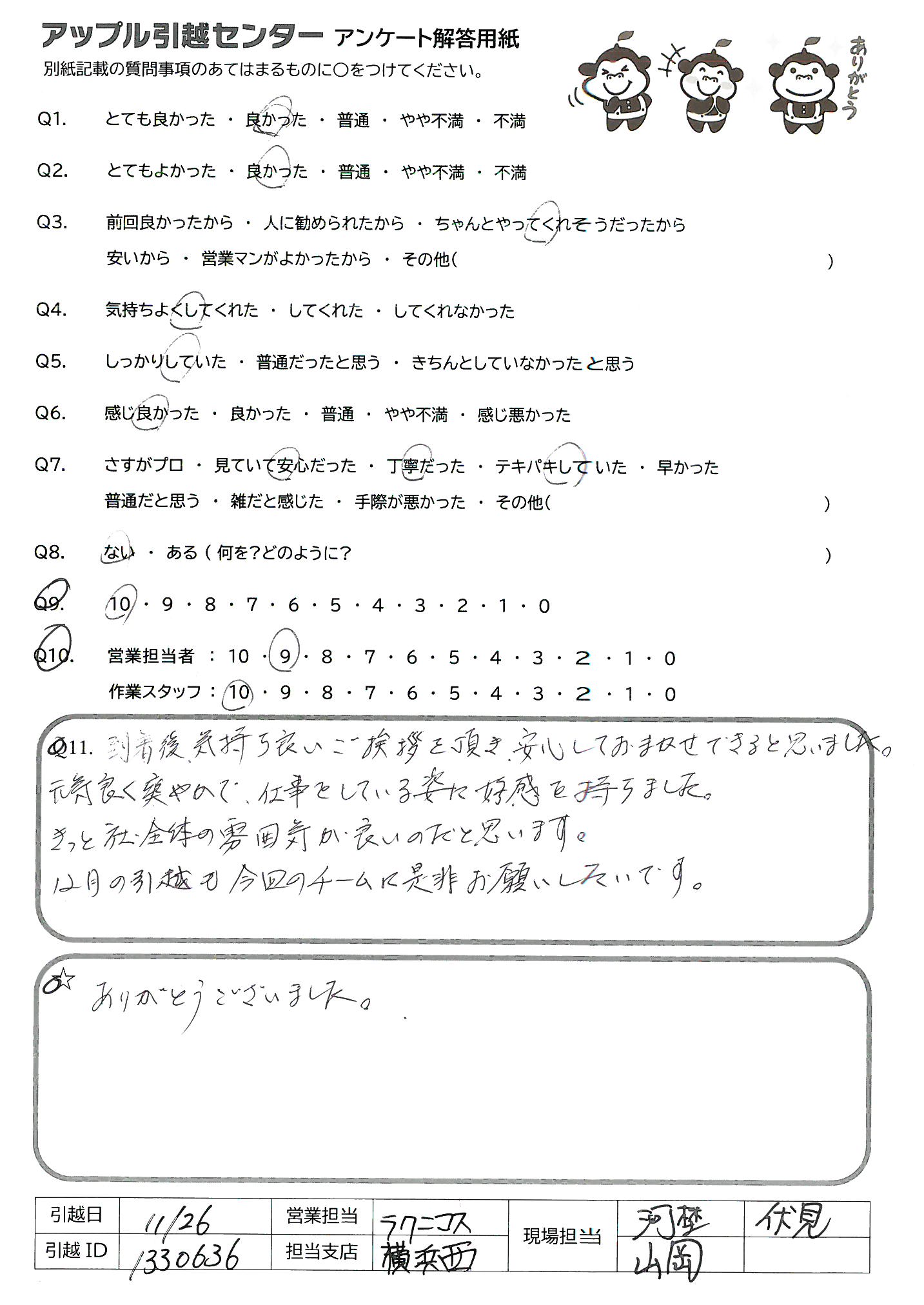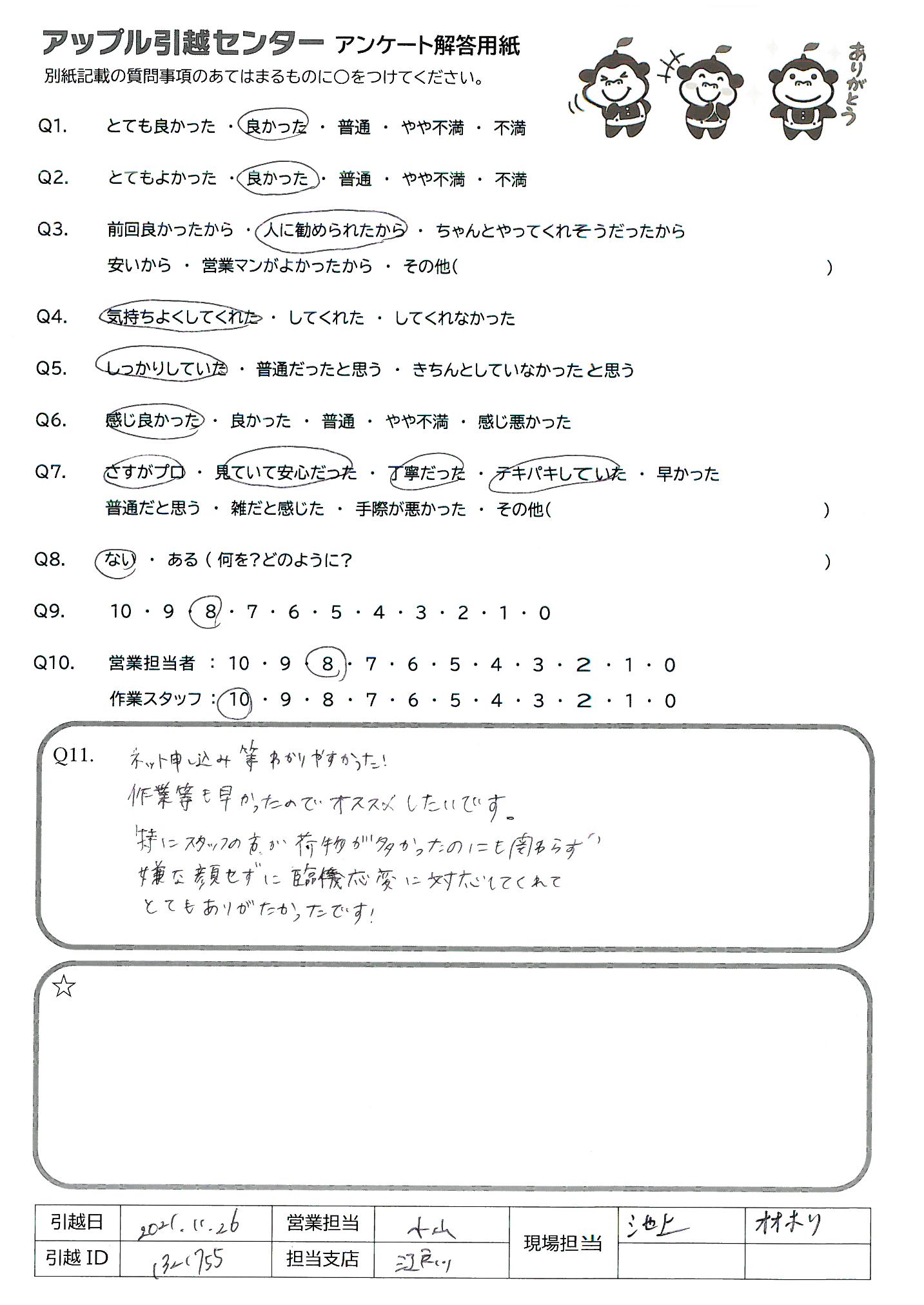 A.到着後、気持ち良いご挨拶を頂き、安心しておまかせできると思いました。 元気よく爽やかで、仕事をしている姿に好感を持ちました。きっと社全体の雰囲気が良いのだと思います。12月の引越も今回のチームに是非お願いしたいです。