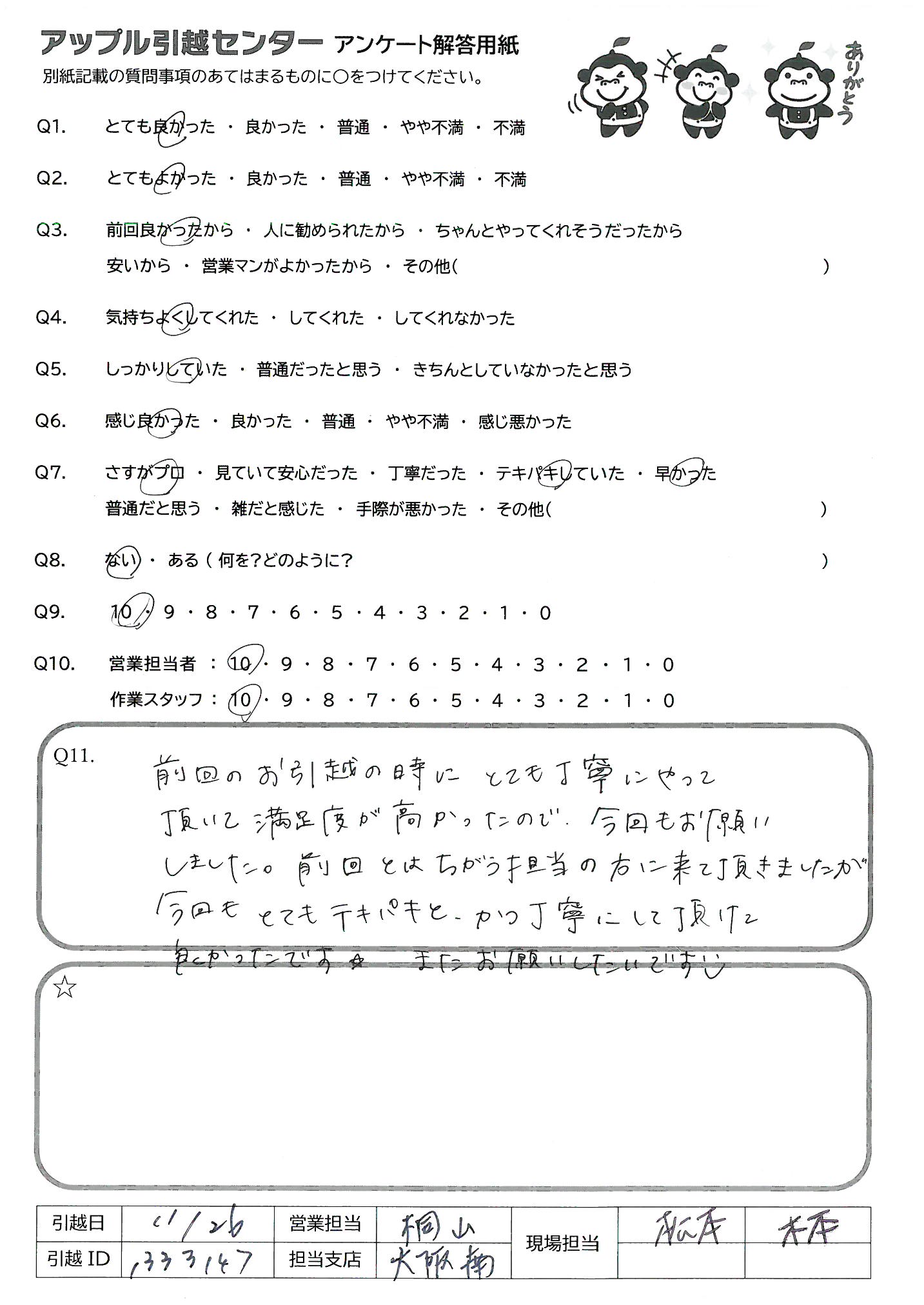 A.前回のお引越の時にとても丁寧にやって頂いて満足度が高かったので、今回もお願いしました。前回とはちがう担当の方に来て頂きましたが今回もとてもテキパキと、かつ丁寧にして頂けて良かったです、またお願いしたいです