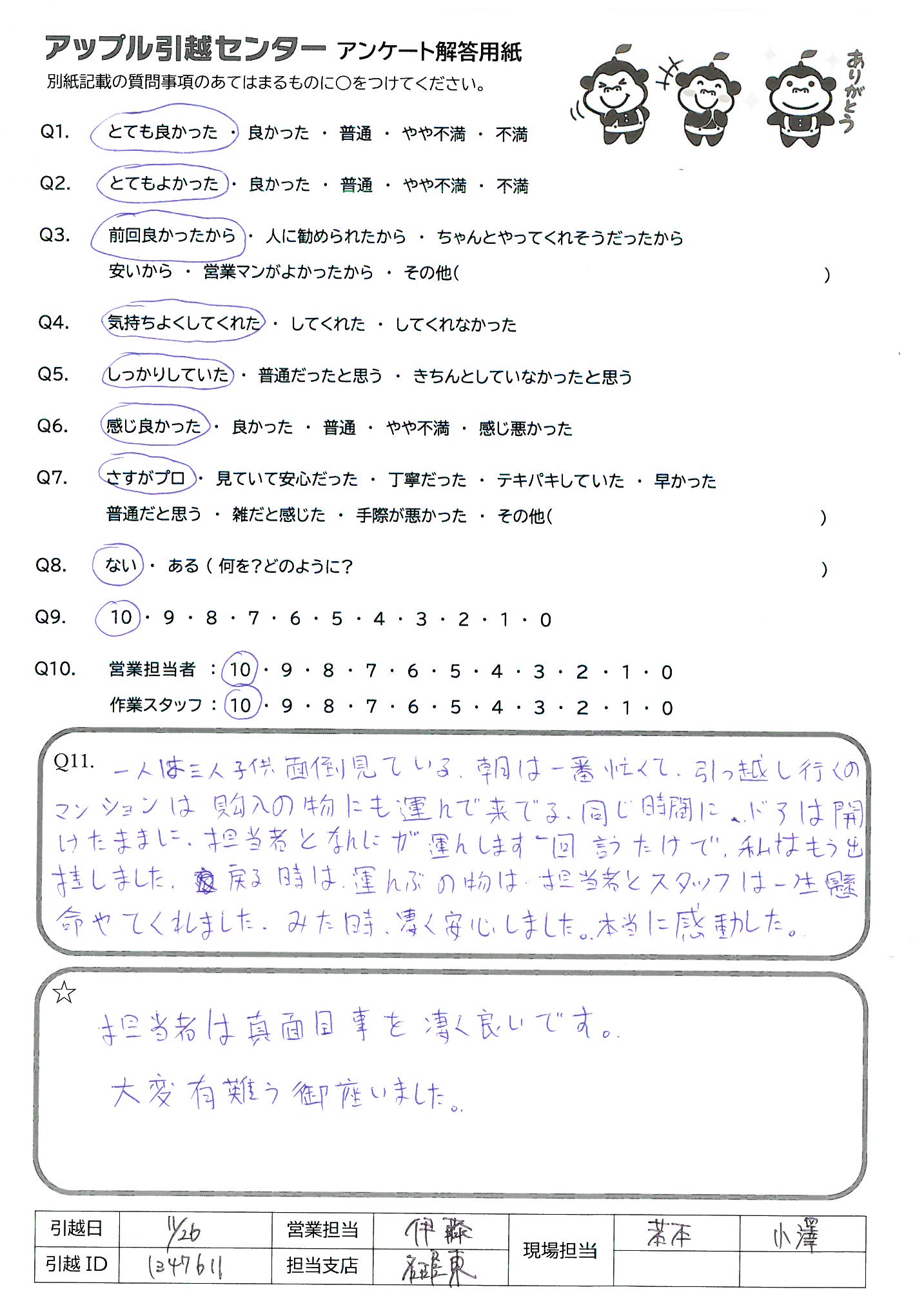 A.一人は三人子供面倒見ている、朝は一番忙しくて、引っ越し行くのマンションは貝勾入の物にも運んで来てる、同じ時間に、ドアは開けたままに、担当者となんにが運んします一回いうたけで、わたしはもう出接しました。戻る時は運んぶの物は担当者とスタッフは一生懸命やてくれました。みた時、凄く安心しました。本当に感動した。