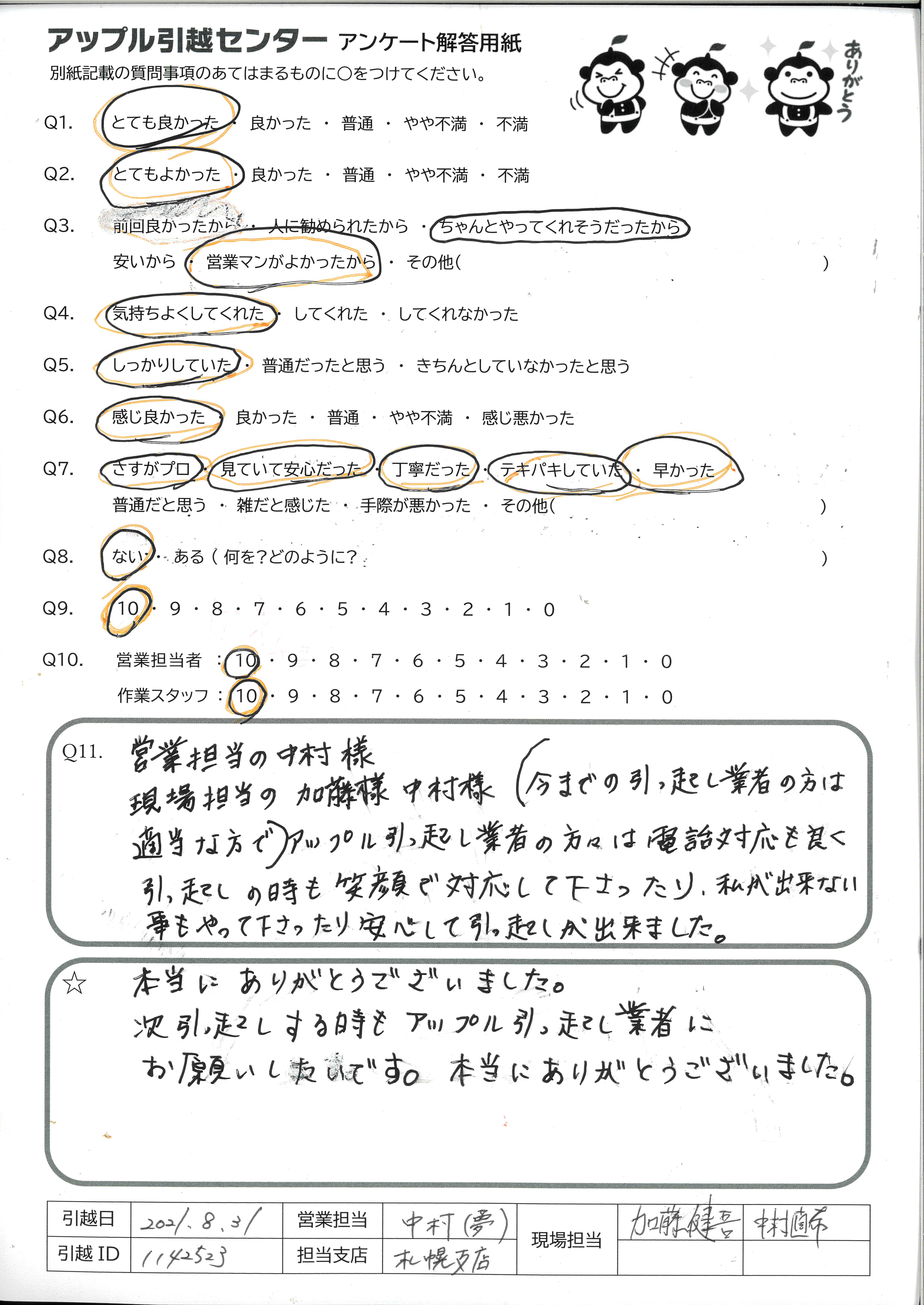 A.営業担当の中村様 現場担当の加藤様中村様(今までの引っ起し業者の方は適当な方で)アップル引っ起し業者の方々は電話対応も良く引っ起しの時も笑顔で対応して下さったり、私が出来ない事もやって下さったり安心して引っ起しが出来ました。