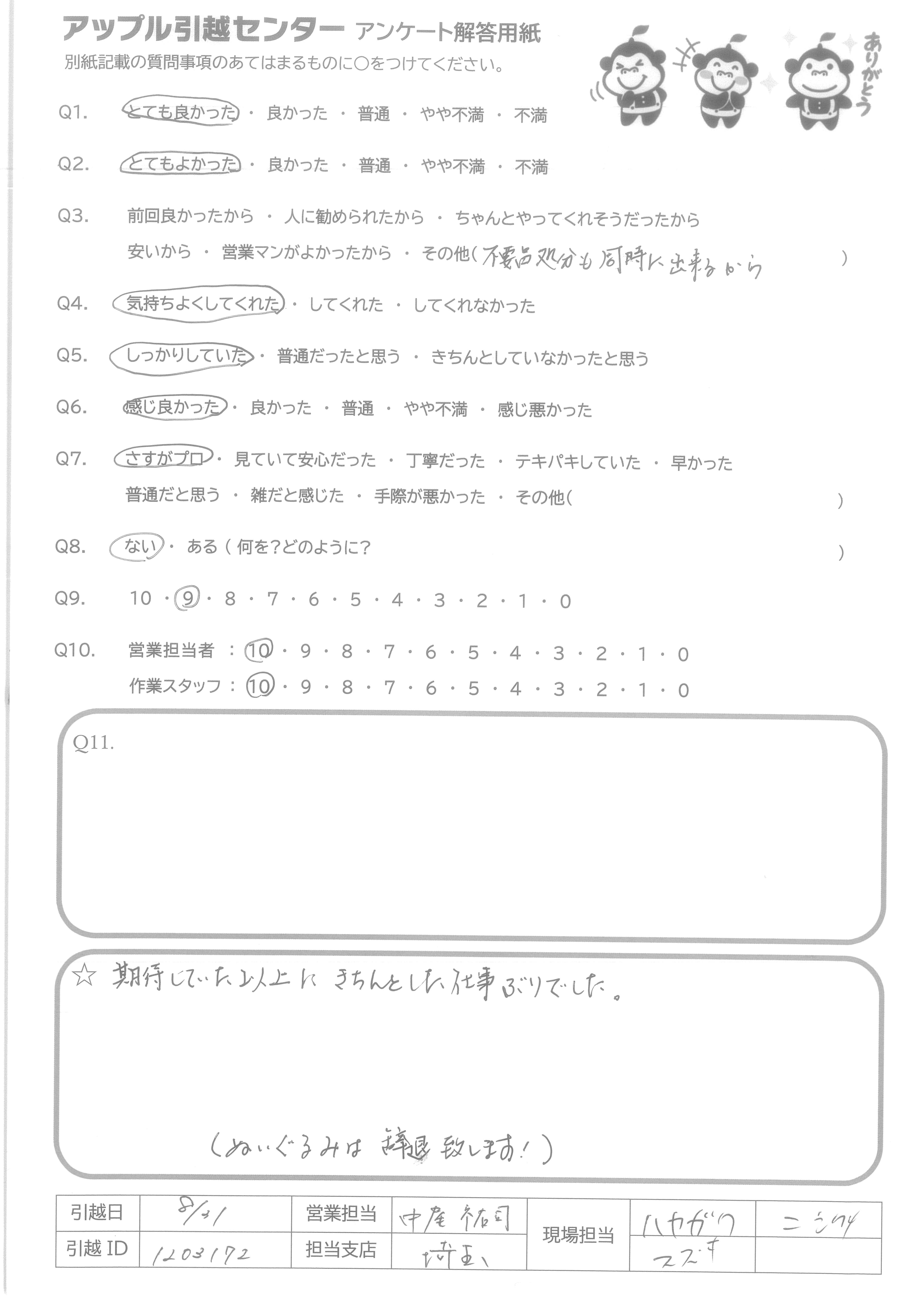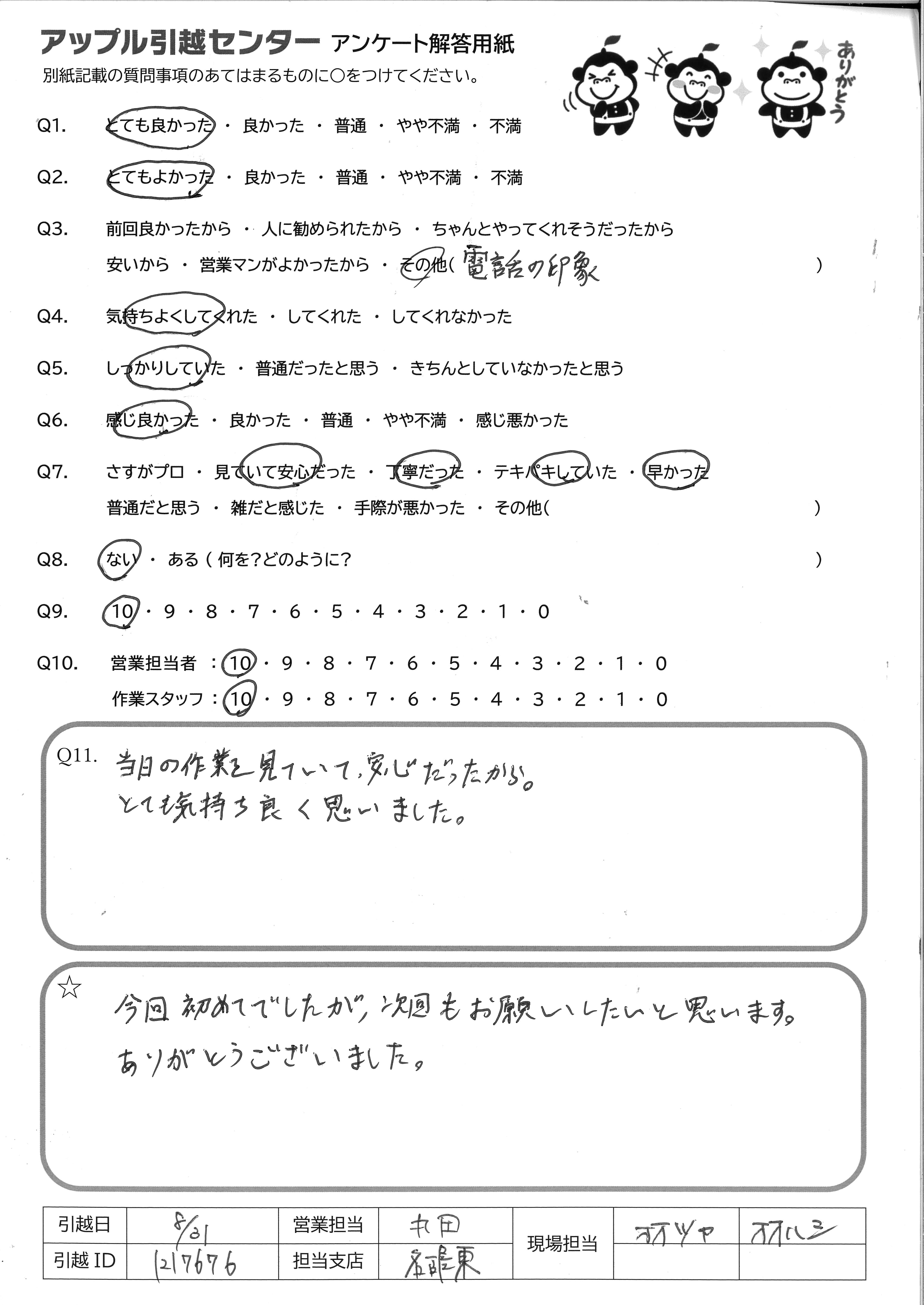 A.複数の方電話にて細やかに対応していただき逐次用意確認をメールにしてくれ安心でした。女性などのキメ細やかさでしょうか。営業担当者の方がどなたなのかわからなかったので0を打てませんでした。(電話受付の方と作業にあたってくれた方との想像から) 現場作業スタッフの方はとにかく手際がよくていねいでさすがだなと感心しました。機会あれば次回もお願いするつもりです。