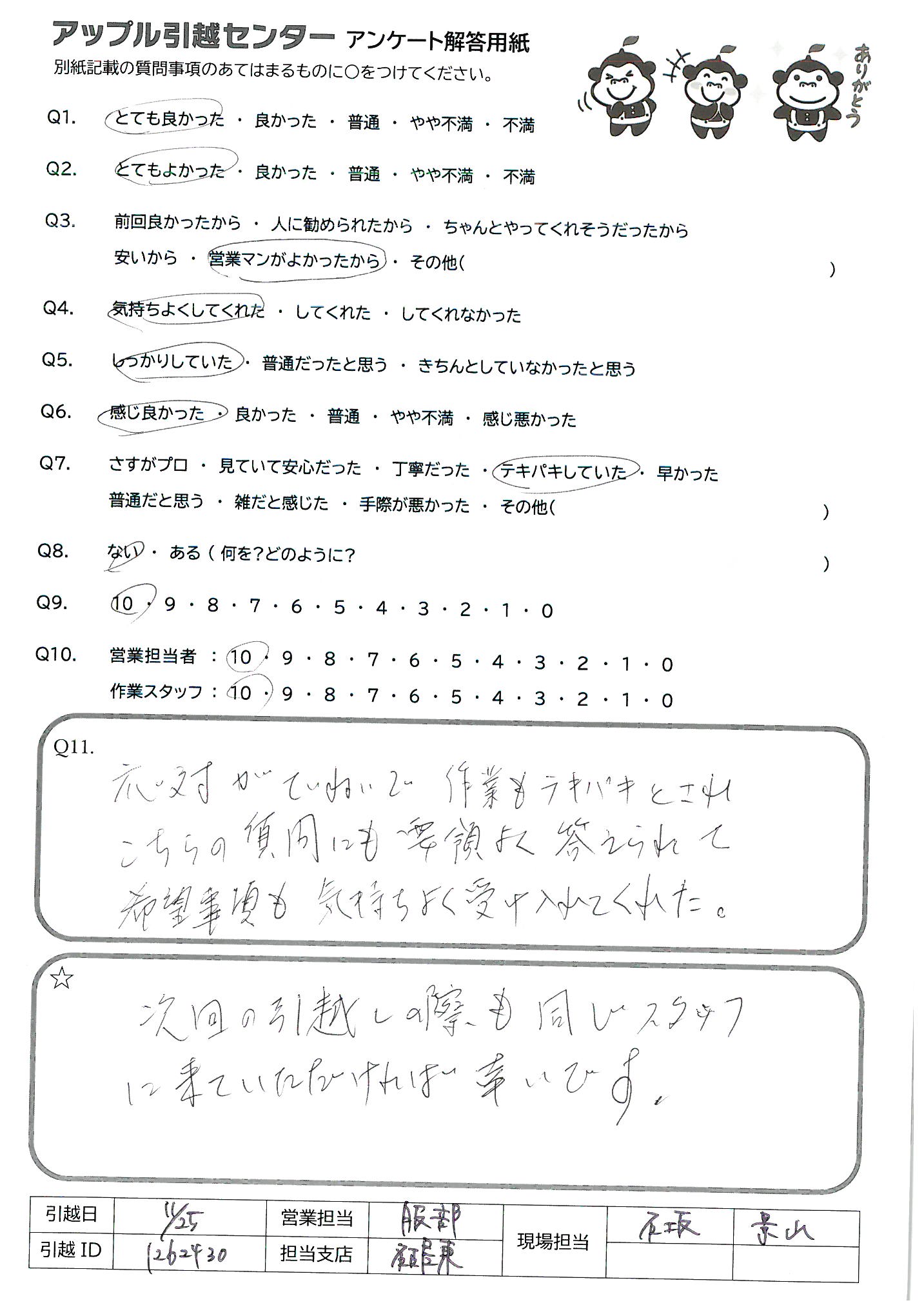 A.次回の引越しの際も同じスタッフに来ていただければ幸いです。
