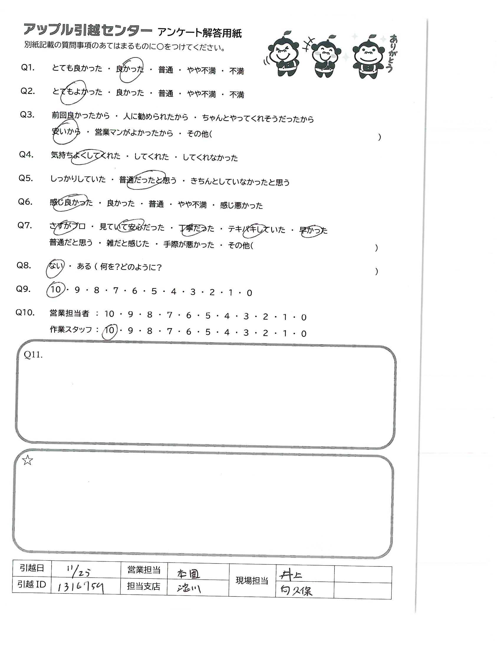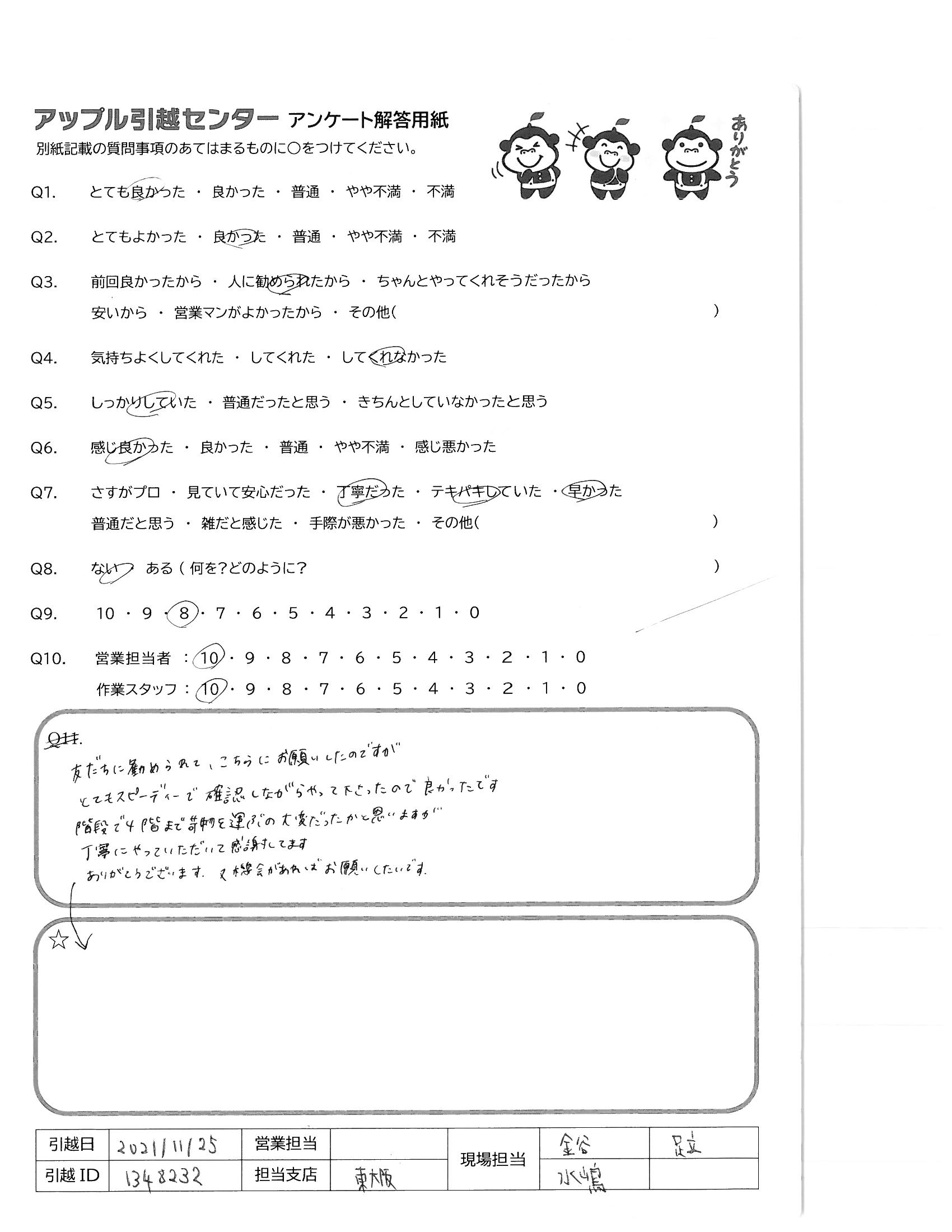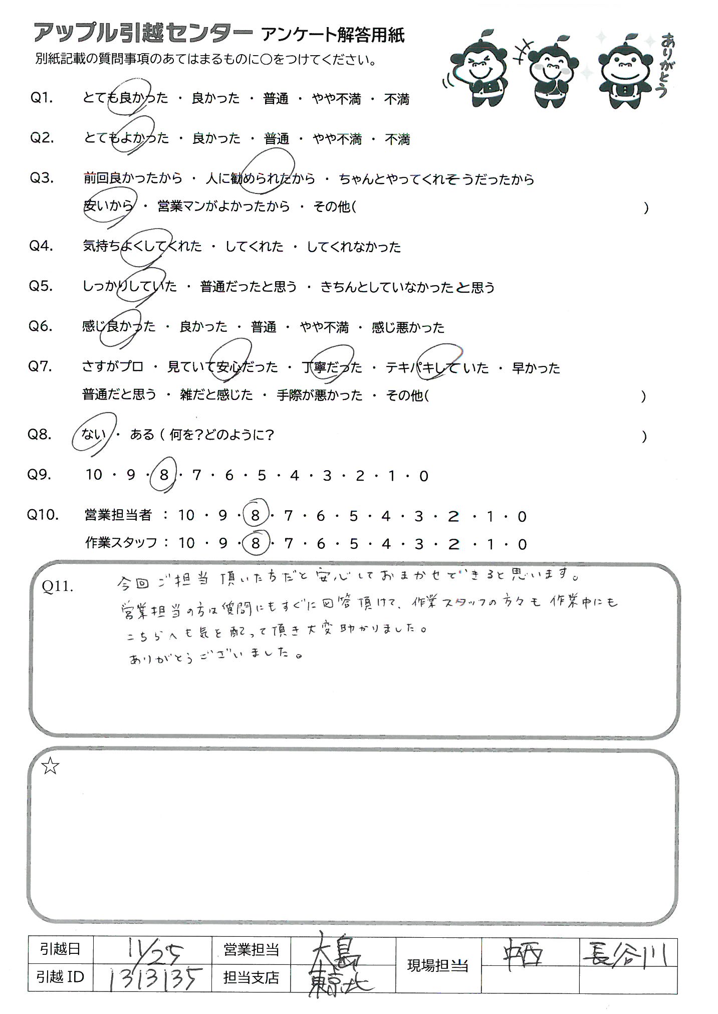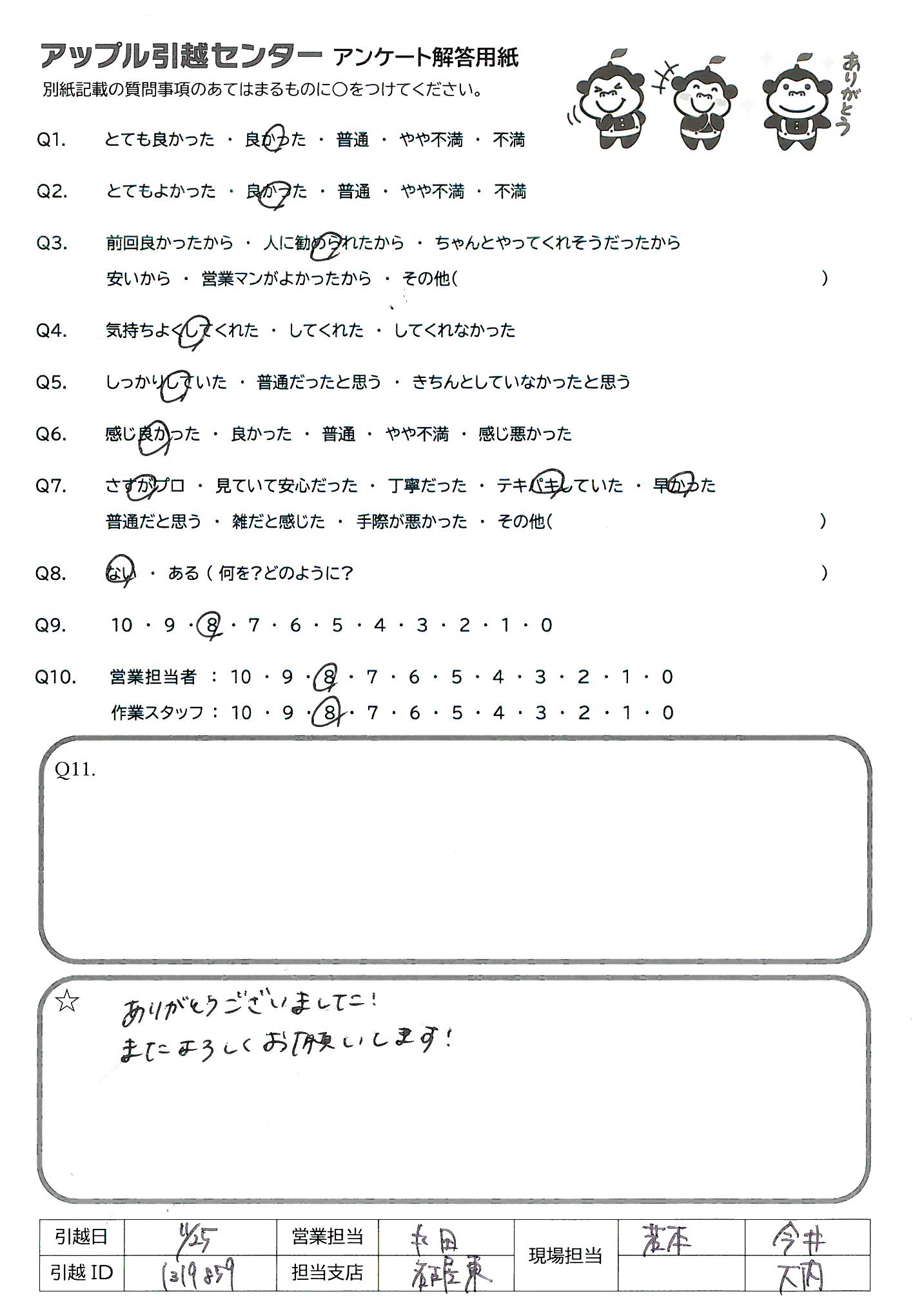 A.引越し開始時から終了までとても親切・丁寧で大変安心して気持ち良く引越が出来た事に感謝致します 引越先マンションの管理さんもいままでの業者の中で一番感じが良かったとおっしゃっておられました。もちろん電話での営業の方も大変好印象でした。又引越の際はお願いします。