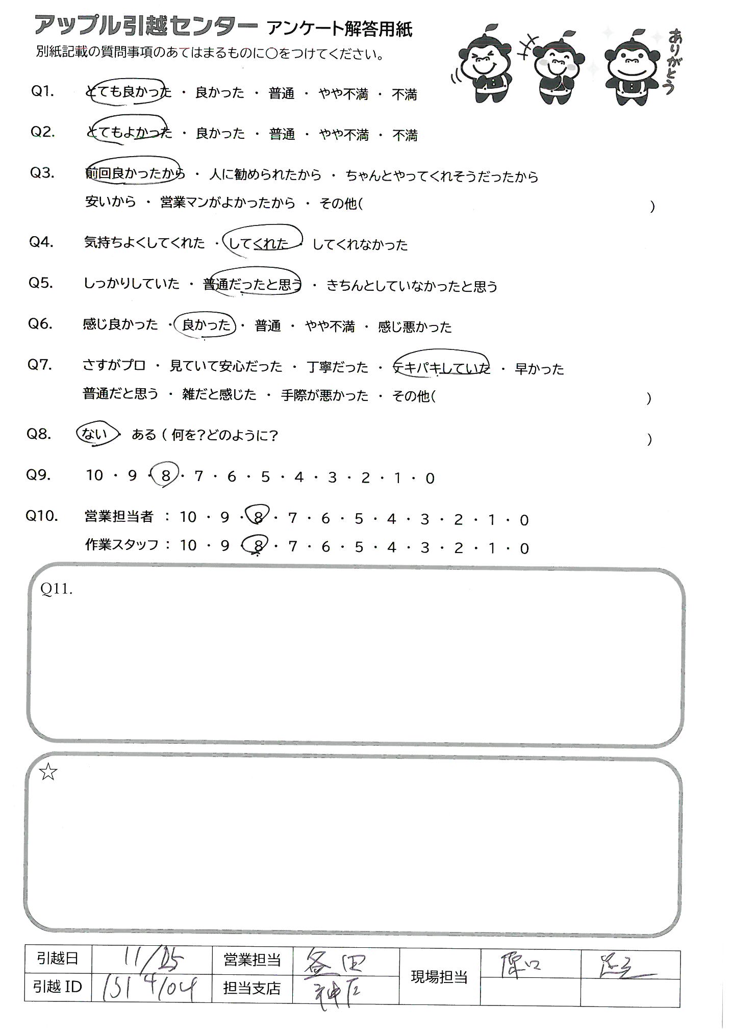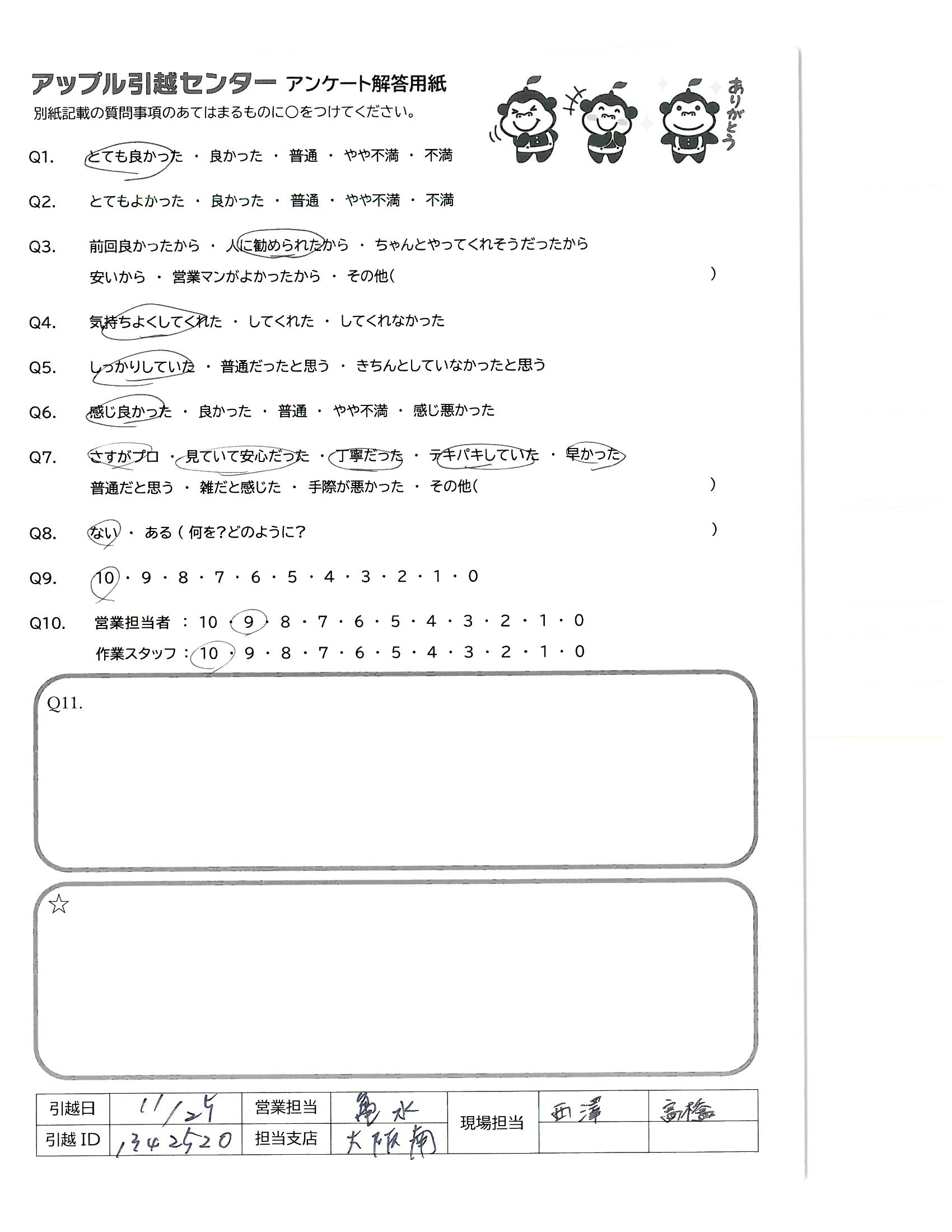 A.営業の方はすごく忙しそうでしたが短時間で丁寧に説明して下さいました。作業員の方々はさすがプロという動きでリーダーの方中心にテキパキ動いて下さいました。又、こちらの依頼に気持ち良い返事で対応してくれました。又、引っこしする時はお願いしたいと思います。