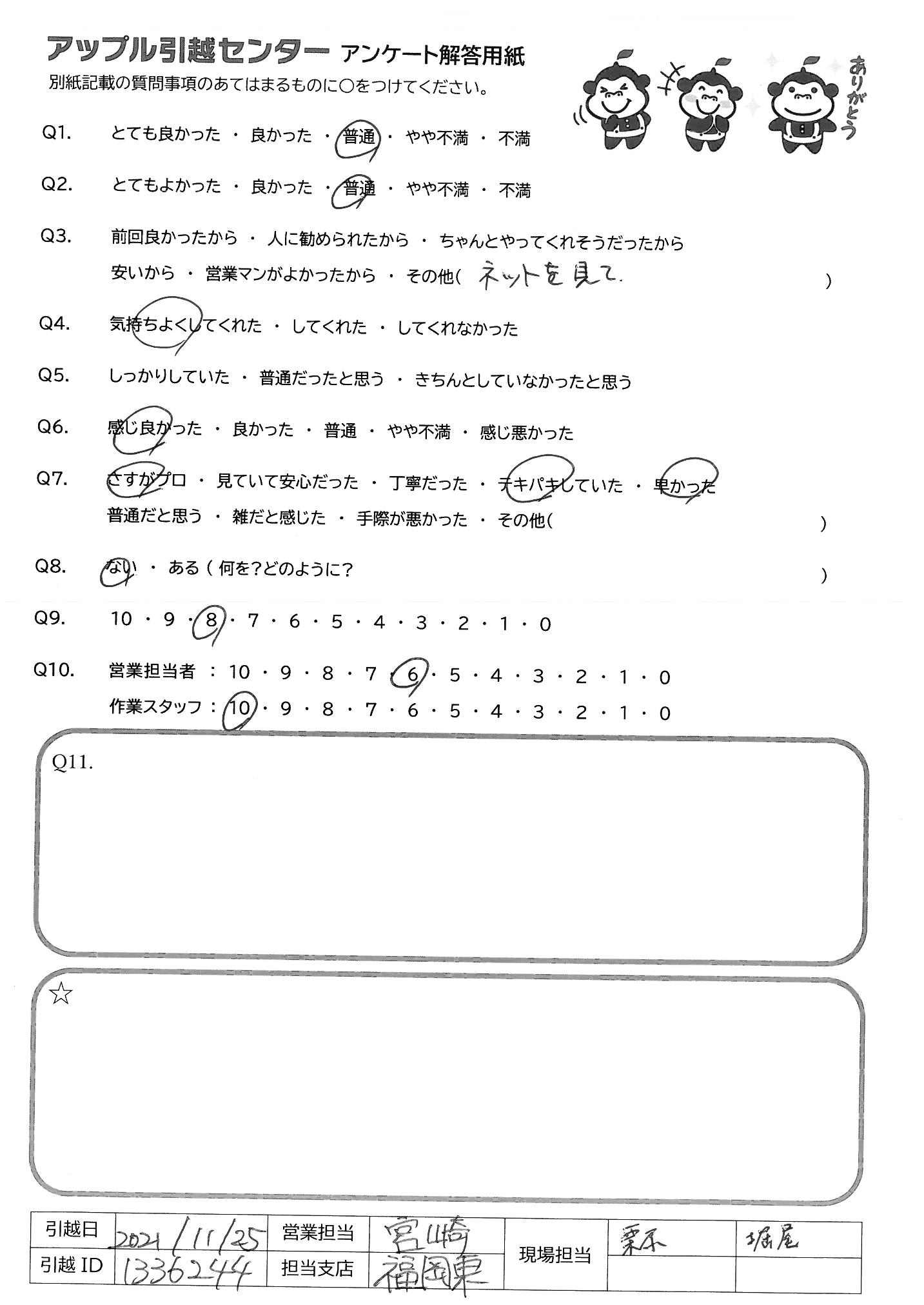 引越し日:2021年11月25日 エリア:福岡県福岡市東区