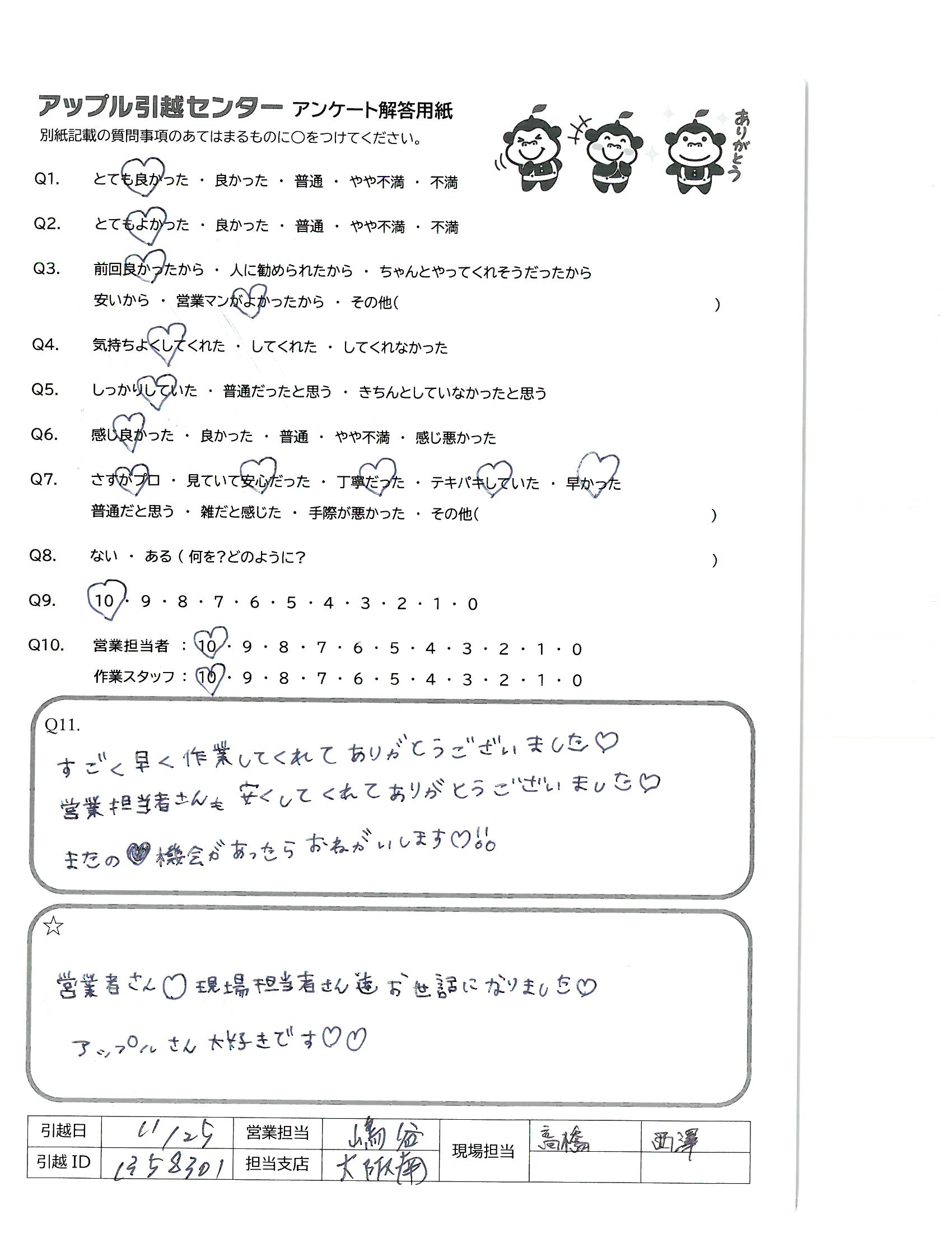 A.営業担当 野島様 スムーズにご案内いただきありがとうございました!ネット見積もりだと不安だったのでオンラインでの見積もりにさせて頂きましたが、やっぱりその方が良かったと思っています。不用品の回収も一点無料にして頂けて とてもありがたかったです! 作業スタッフの向久保様、福島様 とってもスムーズに作業を進めてくださりありがとうございました!おかげさまで午後からの便でしたが、引越した後も思っていたよりも時間に余裕があり 荷解きが進みました。 本当は100点を付けたかったのですが笑 布団を運んで下さった時のことなのですが、、 家具を外に出した後、下にホコリがある状態の床に そのまま掛け布団を置かれたましたので ちょっと気になってしまいました? 広くない部屋だったので作業するスペースが狭いのはわかりますが、そこだけなんとか改善していただければな〜と思います!