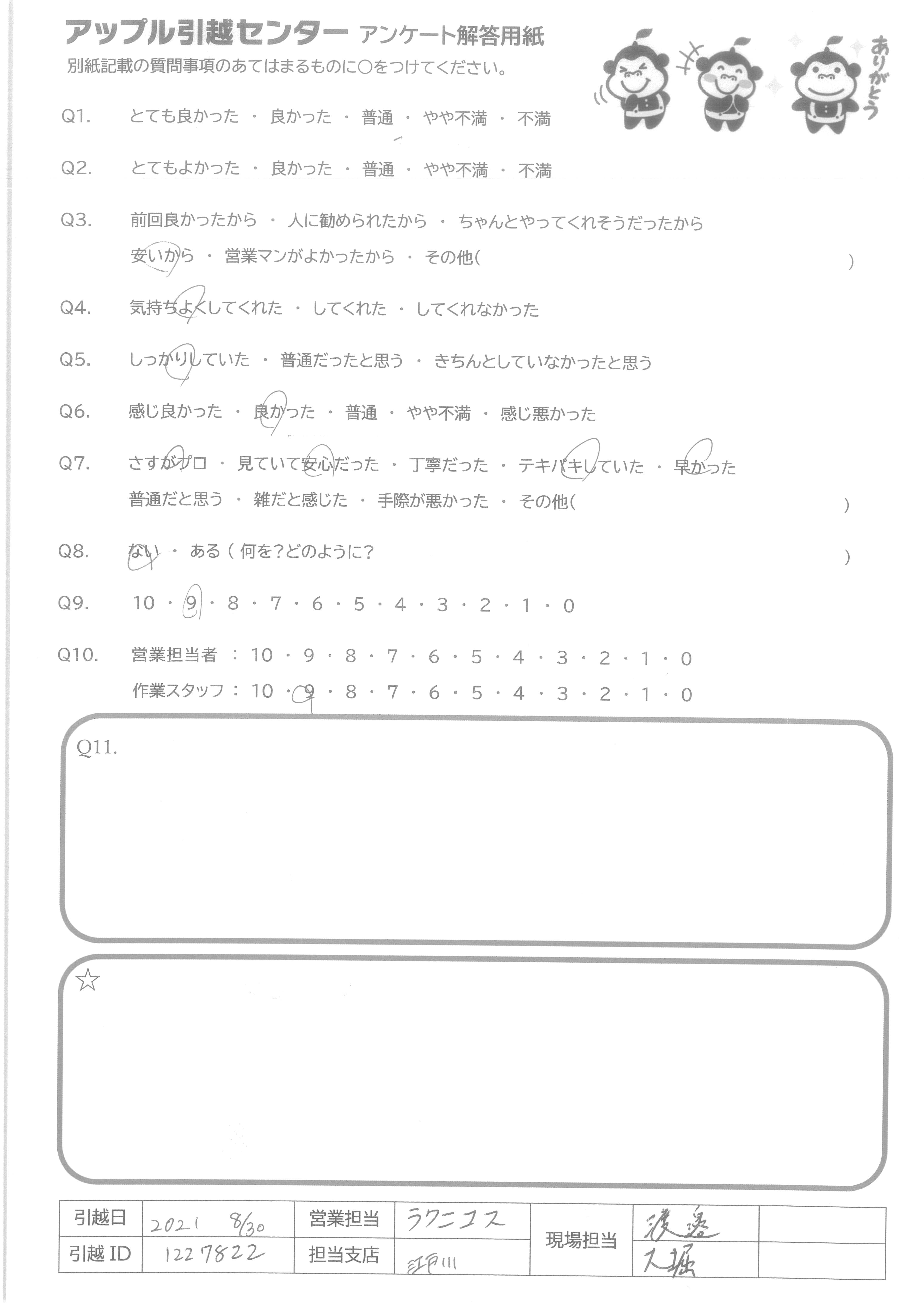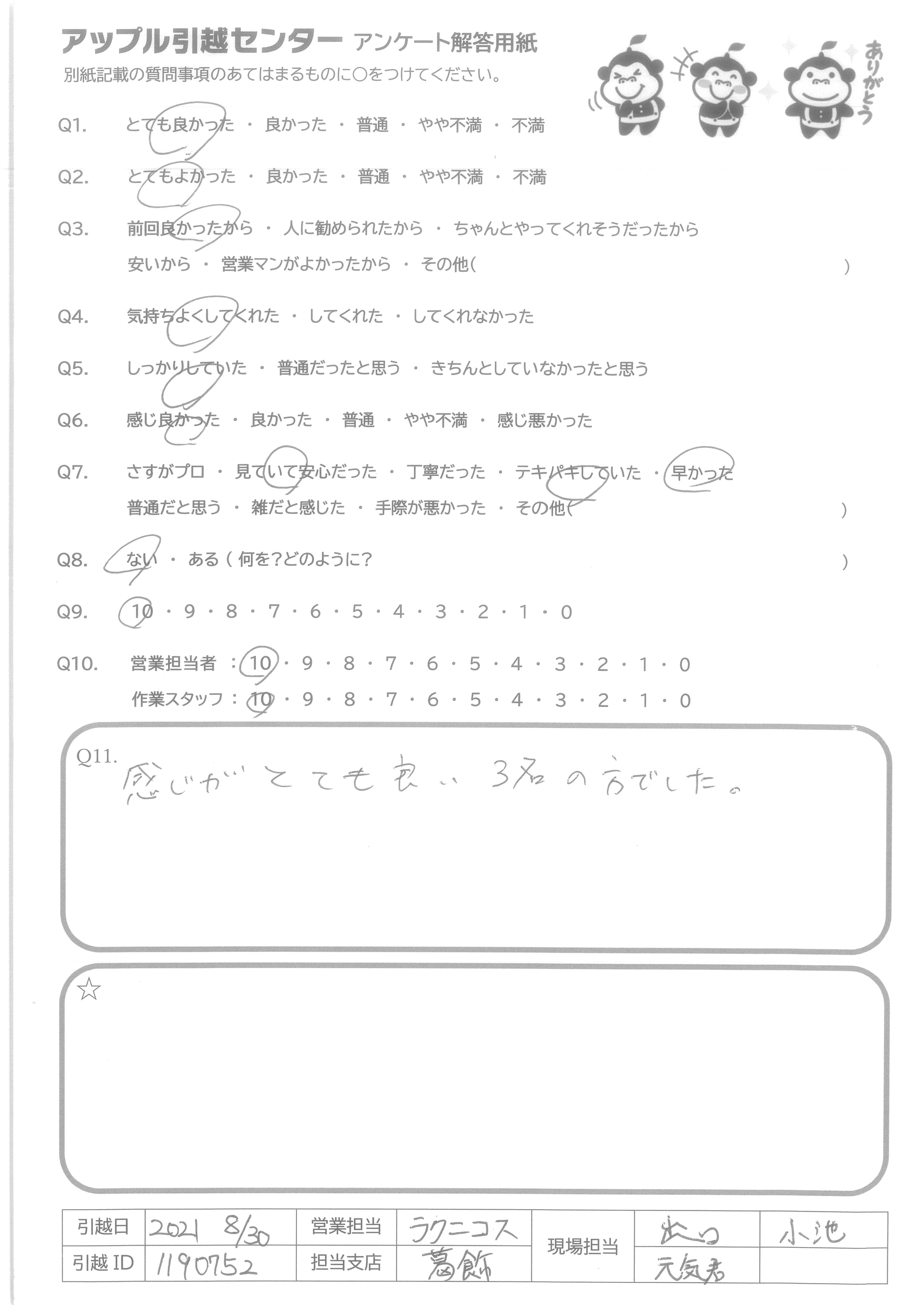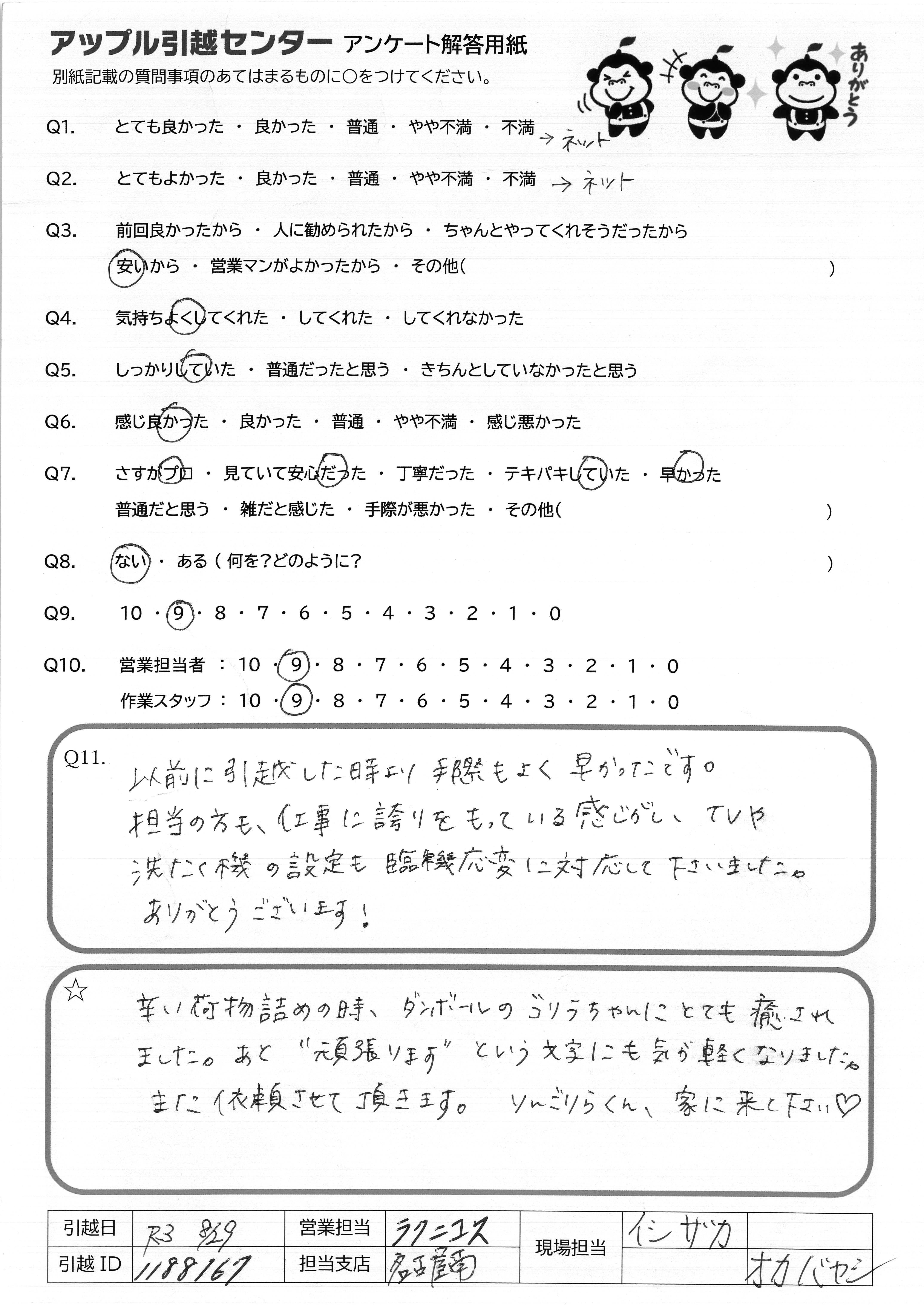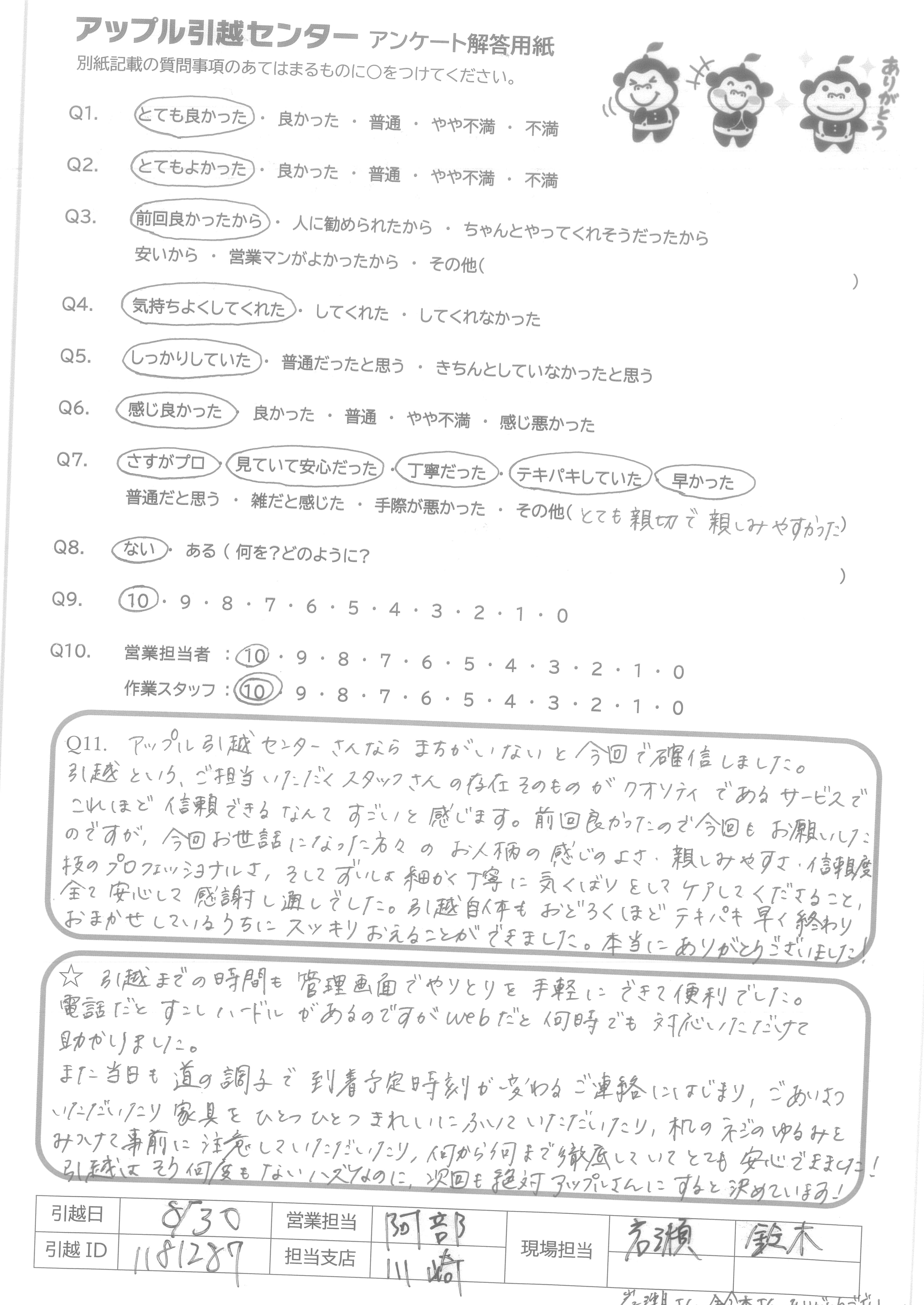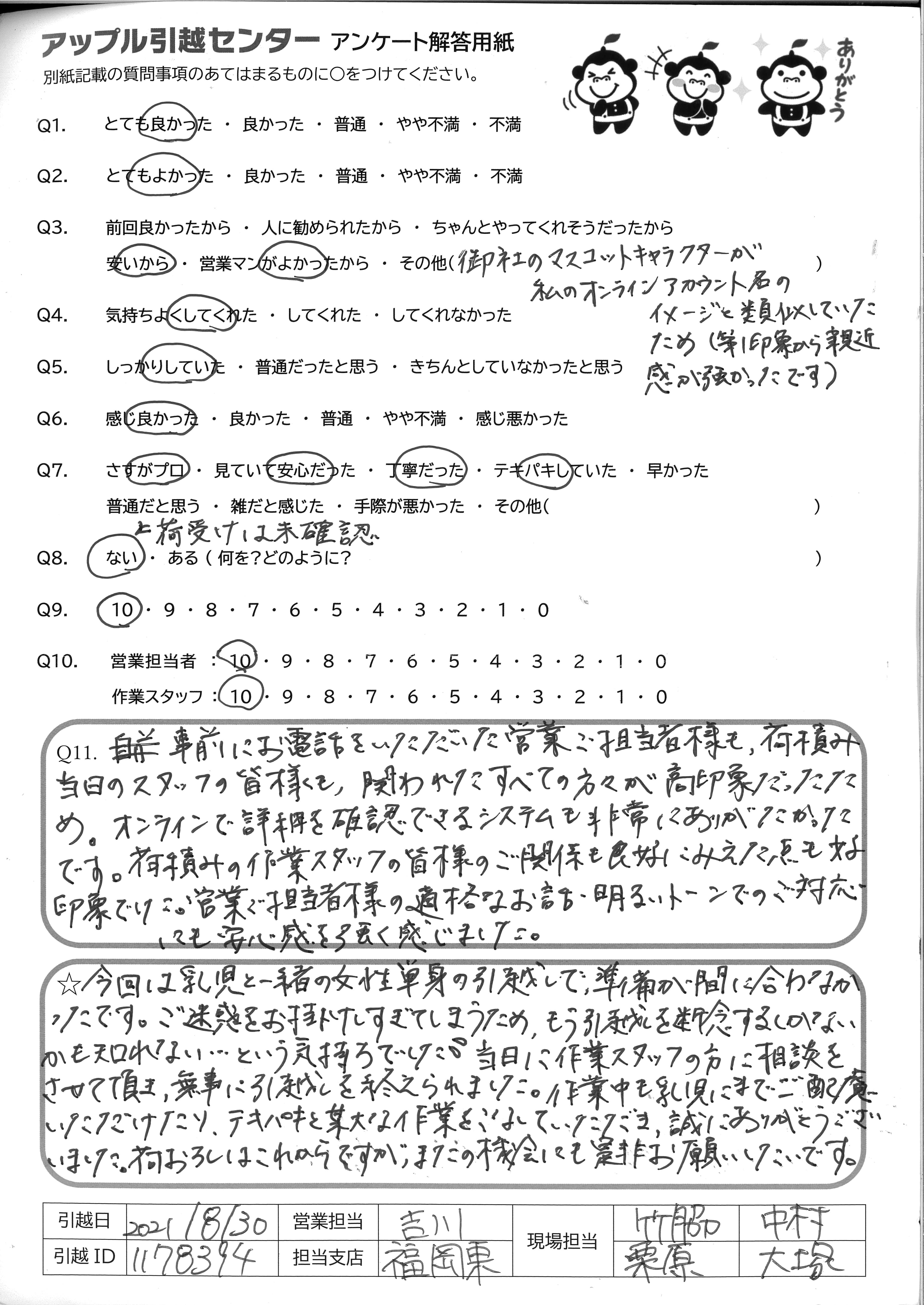 A.アップル引越センターさんならまちがいないと今回で確信しました。引越という、ご担当いただくスタッフさんの存在そのものがクオリティであるサービスでこれほど信頼できるなんてすごいと感じます。前回良かったので今回もお願いしたのですが、今回お世話になった方々のお人柄の感じのよさ、親しみやすさ、信頼度技のプロフェッショナルさ、そしてずいしょ細かく丁寧に気くばりをしてケアしてくださること、全て安心して感謝し通しでした。引越自体もおどろくほどテキパキ早く終わりおまかせしているうちにスッキリおえることができました。本当にありがとうございました!!