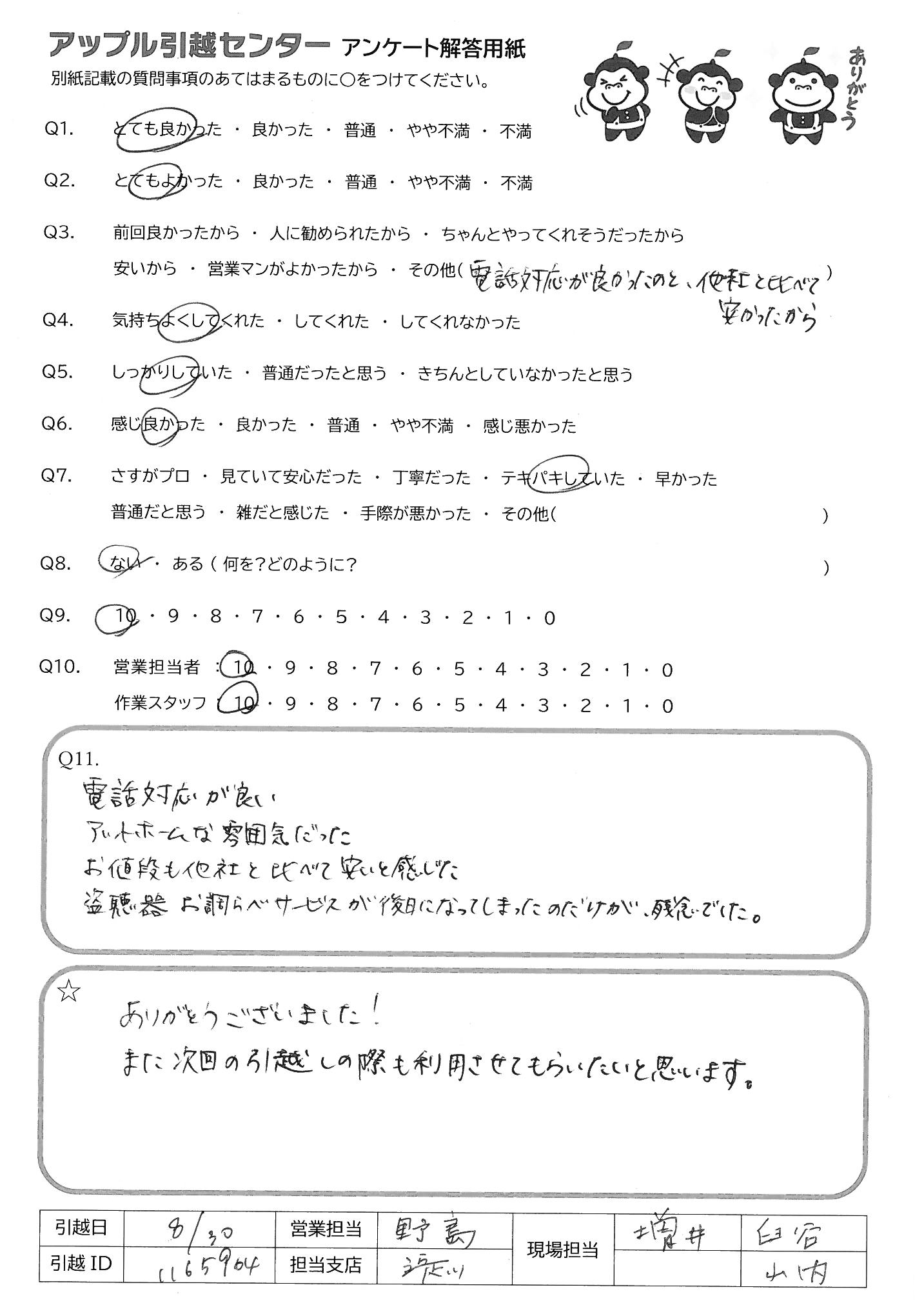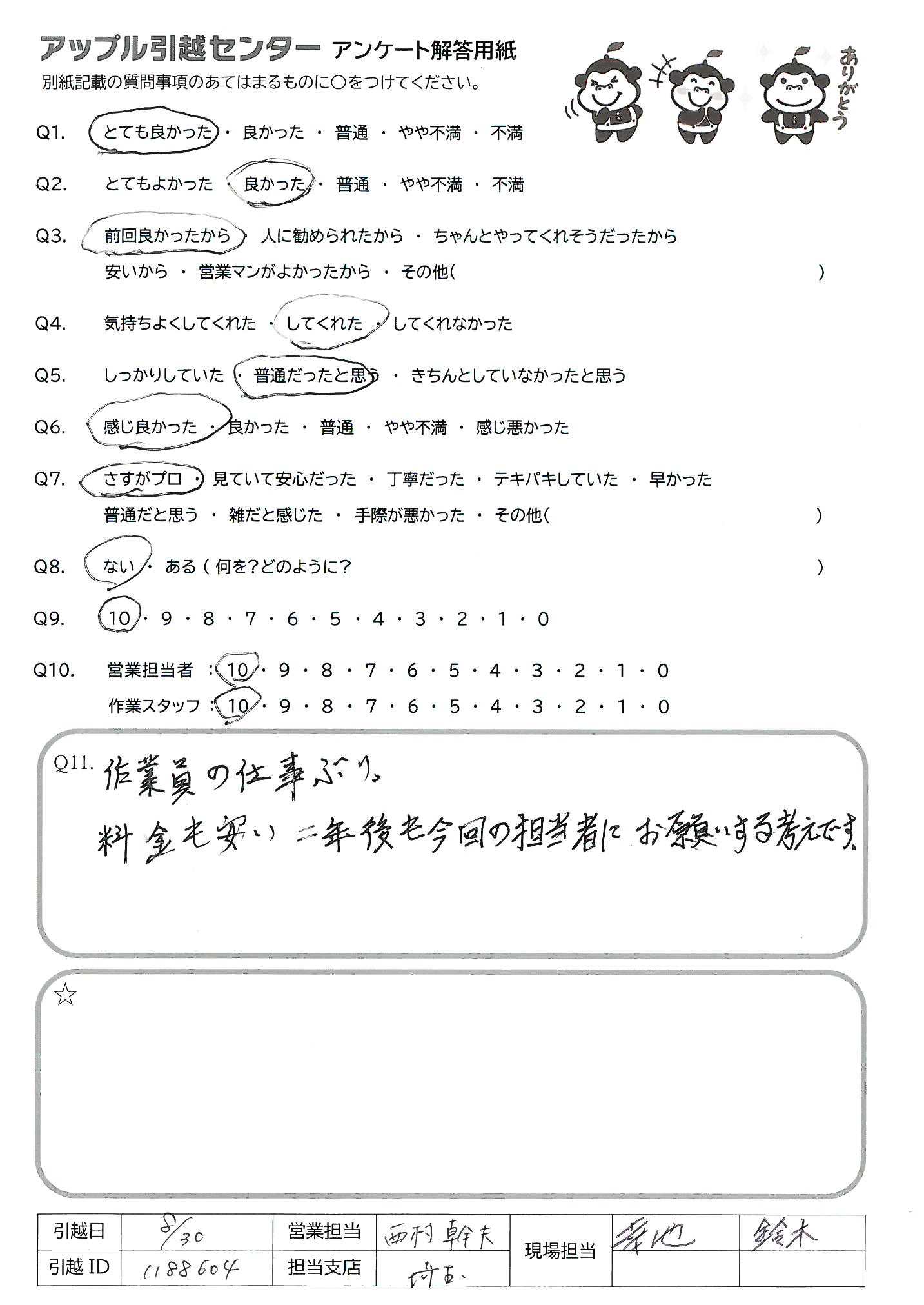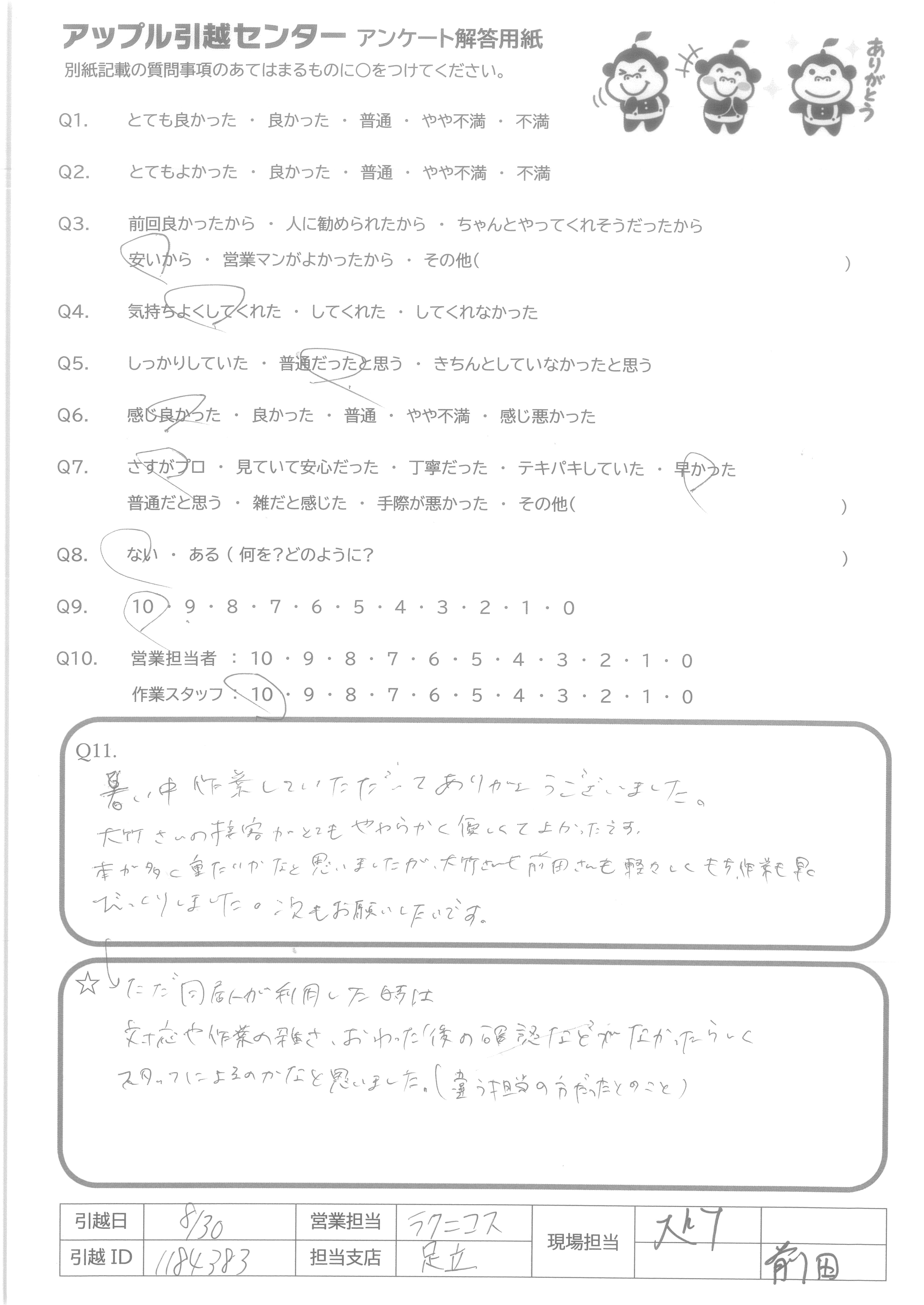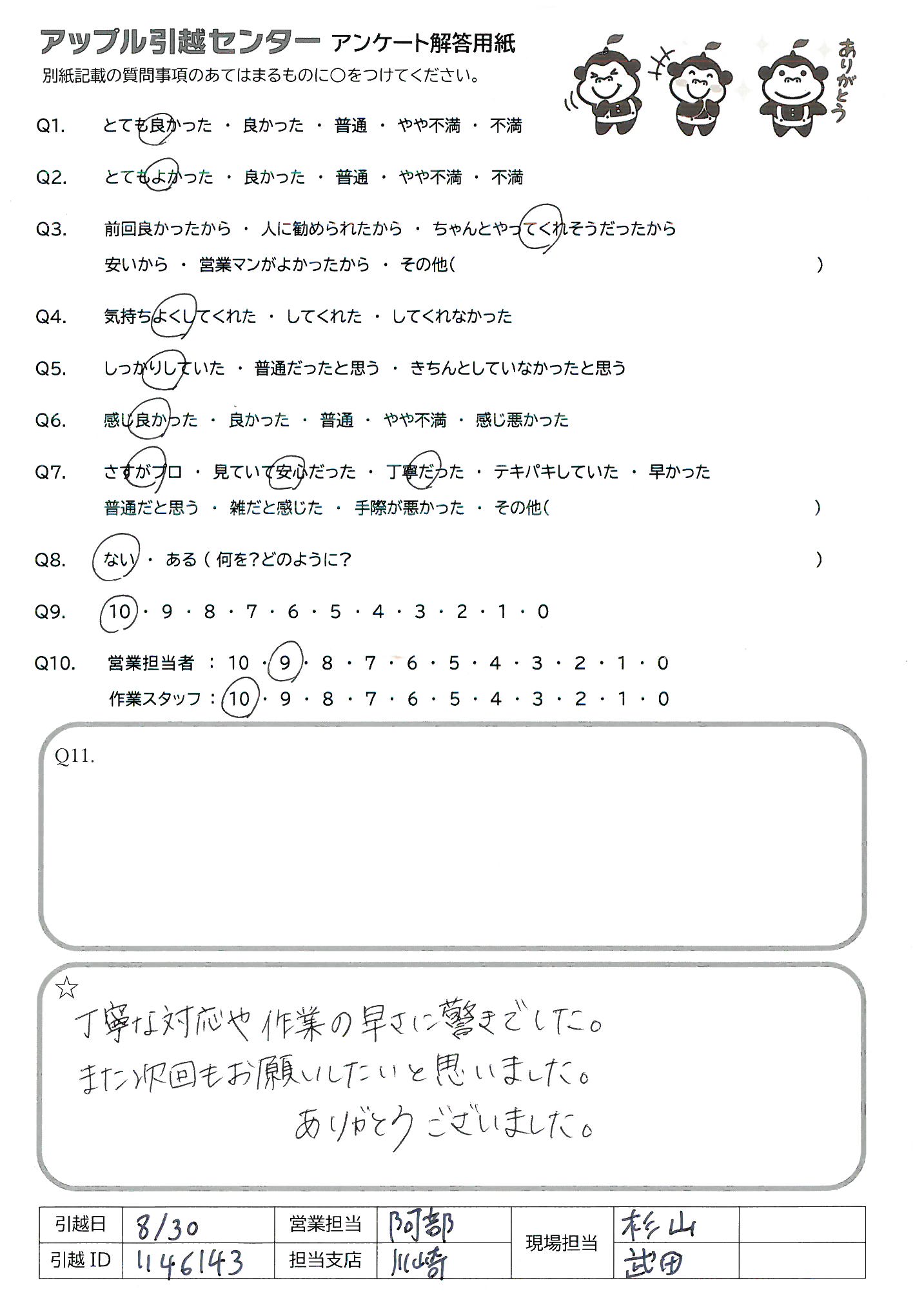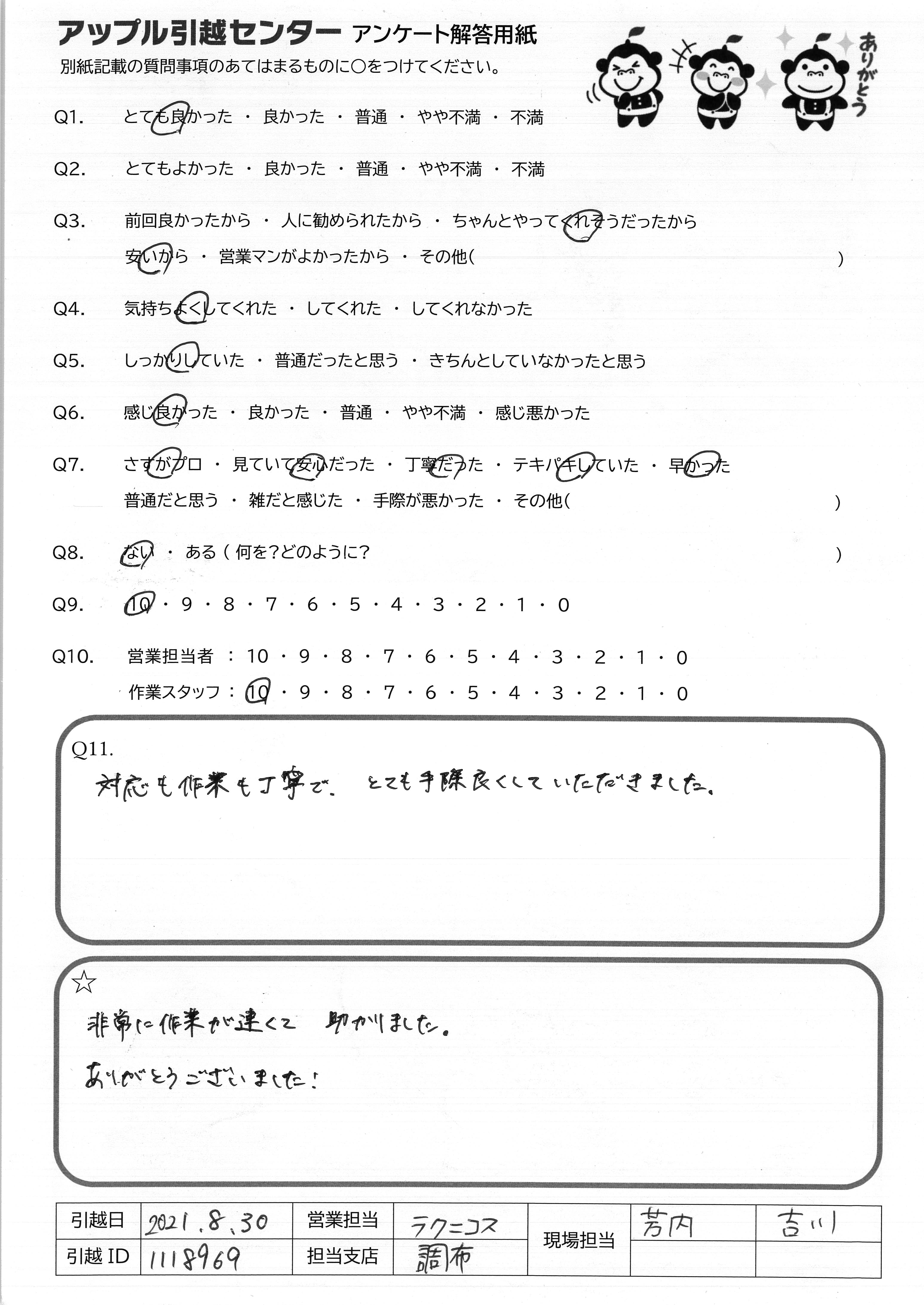 A.アップル引越センターさんならまちがいないと今回で確信しました。引越という、ご担当いただくスタッフさんの存在そのものがクオリティであるサービスでこれほど信頼できるなんてすごいと感じます。前回良かったので今回もお願いしたのですが、今回お世話になった方々のお人柄の感じのよさ、親しみやすさ、信頼度技のプロフェッショナルさ、そしてずいしょ細かく丁寧に気くばりをしてケアしてくださること、全て安心して感謝し通しでした。引越自体もおどろくほどテキパキ早く終わりおまかせしているうちにスッキリおえることができました。本当にありがとうございました!!