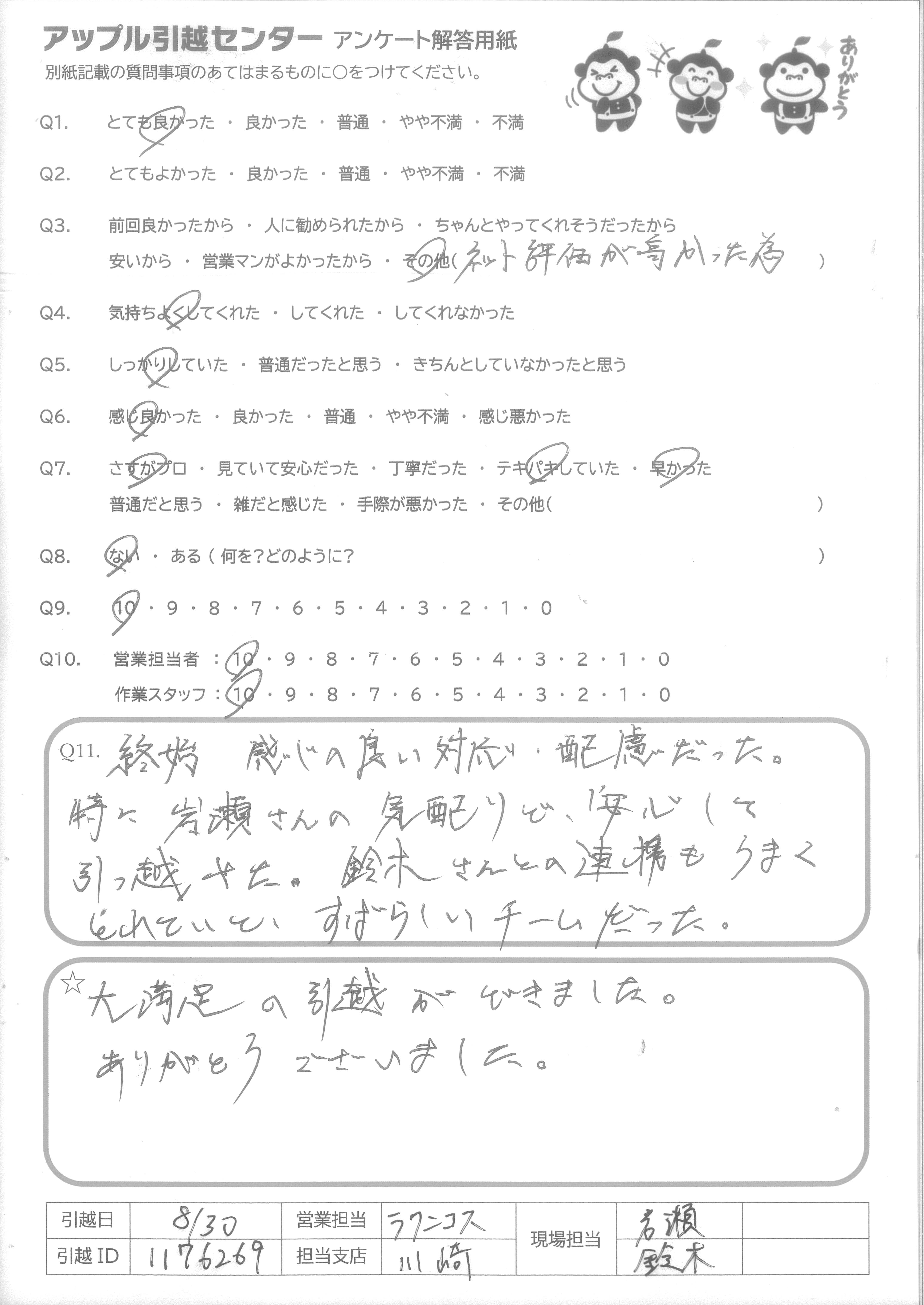 A.終始感じの良い対応・配慮だった。 特に岩瀬さんの気配りで、安心して引っ越せた。鈴木さんとの連携もうまくとれていて、すばらしいチームだった。