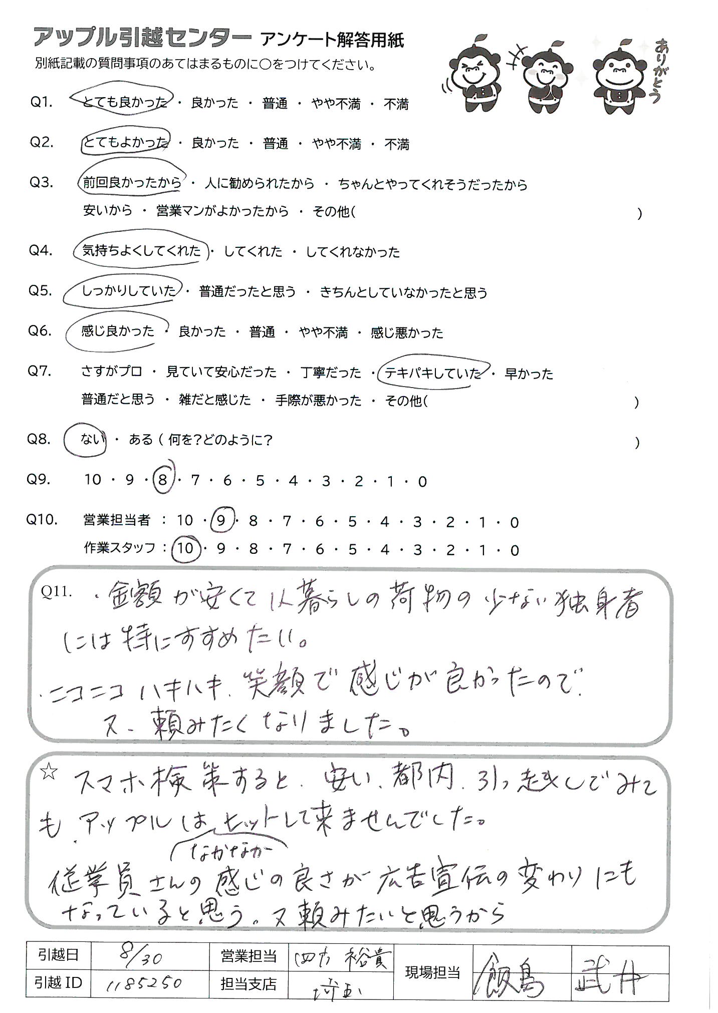 A.・金額が安くて1人暮らしの荷物の少ない独身者には特にすすめたい。 ニコニコハキハキ、笑顔で感じが良かったので、又、頼みたくなりました。