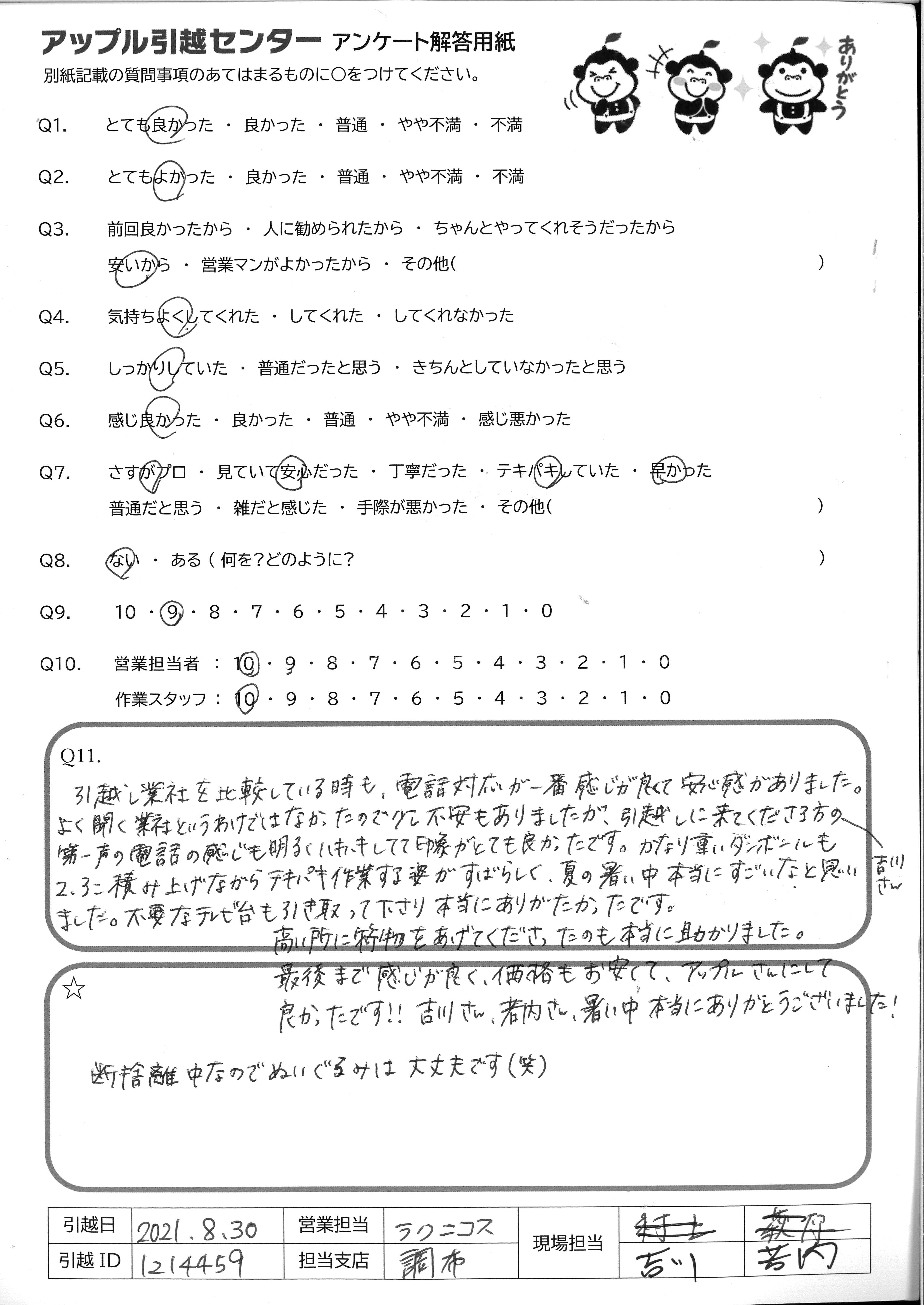 A.引越し業社を比較している時も、電話対応が一番感じが良くて安心感がありました。よく聞く業社というわけではなかったので少し不安もありましたが、引越しに来てくださる方の第一声の電話の感じも明るくハキハキしてて印象がとても良かったです。かなり重いダンボールも2,3こ積み上げながらテキパキ作業する姿がすばらしく、夏の暑い中本当にすごいなとお澪ました。不要なテレビ台も引取って下さり本当にありがたかったです。 高い所に荷物をあげてくださったのも本当に助かりました。