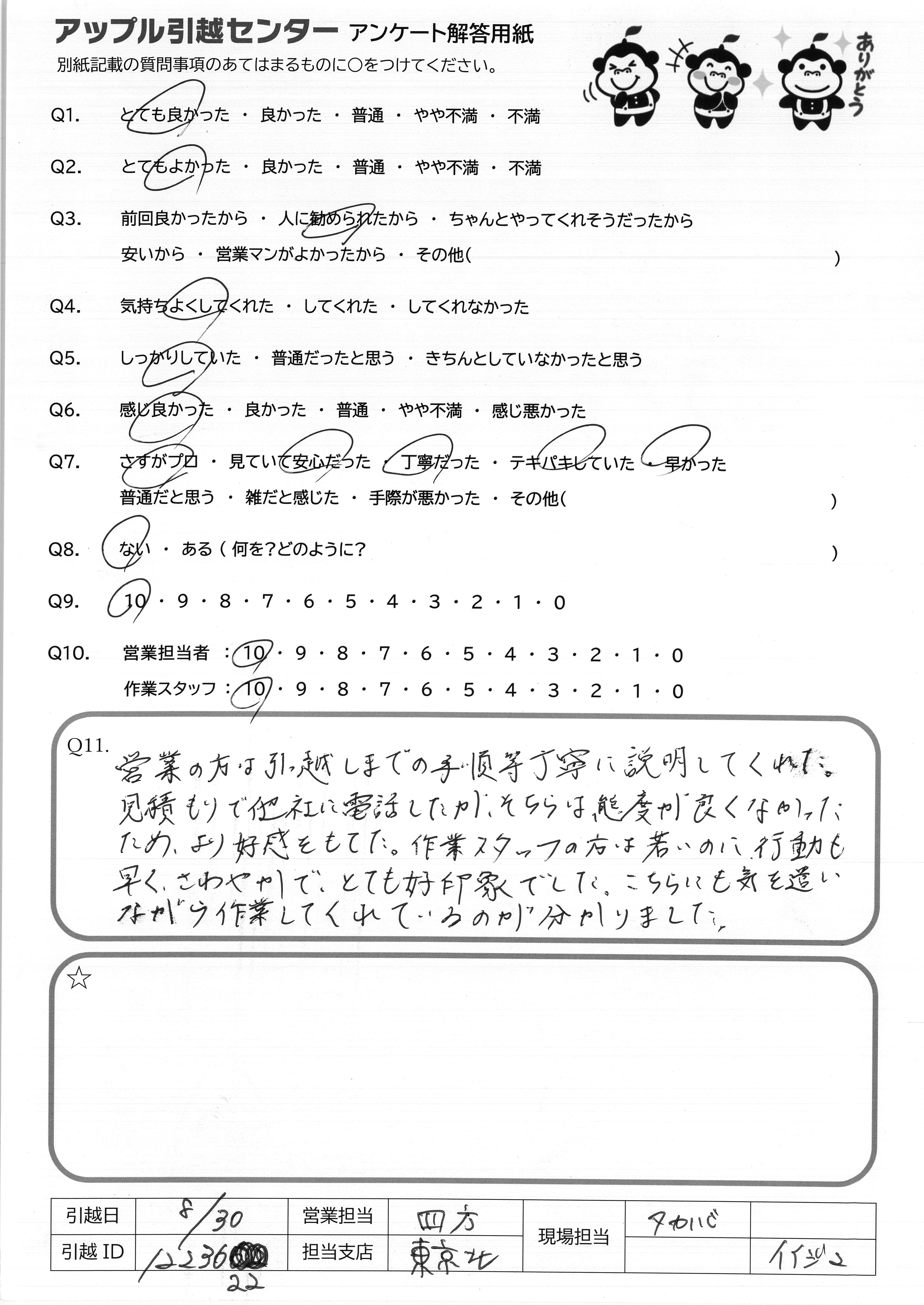 A.営業の方は引っ越しまでの手順等丁寧に説明してくれた。 見積もりで他社に電話したが、そちらは態度が良くなかったため、より好感をもてた。作業スタッフの方は若いのに、行動も早く、さわやかで、とても好印象でした。こちらにも気を遣いながら作業してくれているのが分かりました。