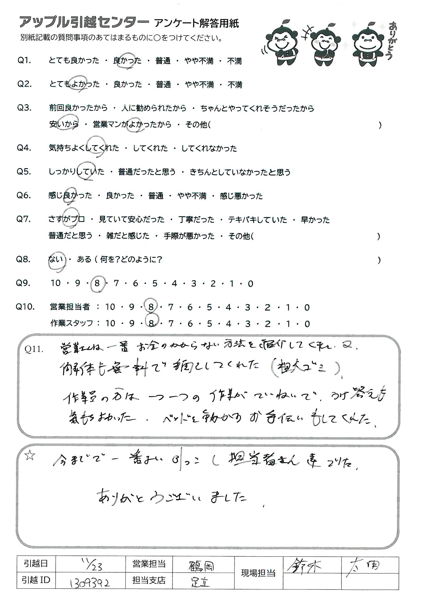 A.・他社との値段比較に快く・早急に応じてくれた ・当日に立ち寄りをお願いしてしまったのですが、快く・早急に応じてくれた ・作業スタッフの方がとても明るく挨拶、やり取りをしてくれて安心できた ・作業も早くてテキパキと対応してくれてとても助かった ・梱包ができていないものについても臨機応変に対応してくれて助かった