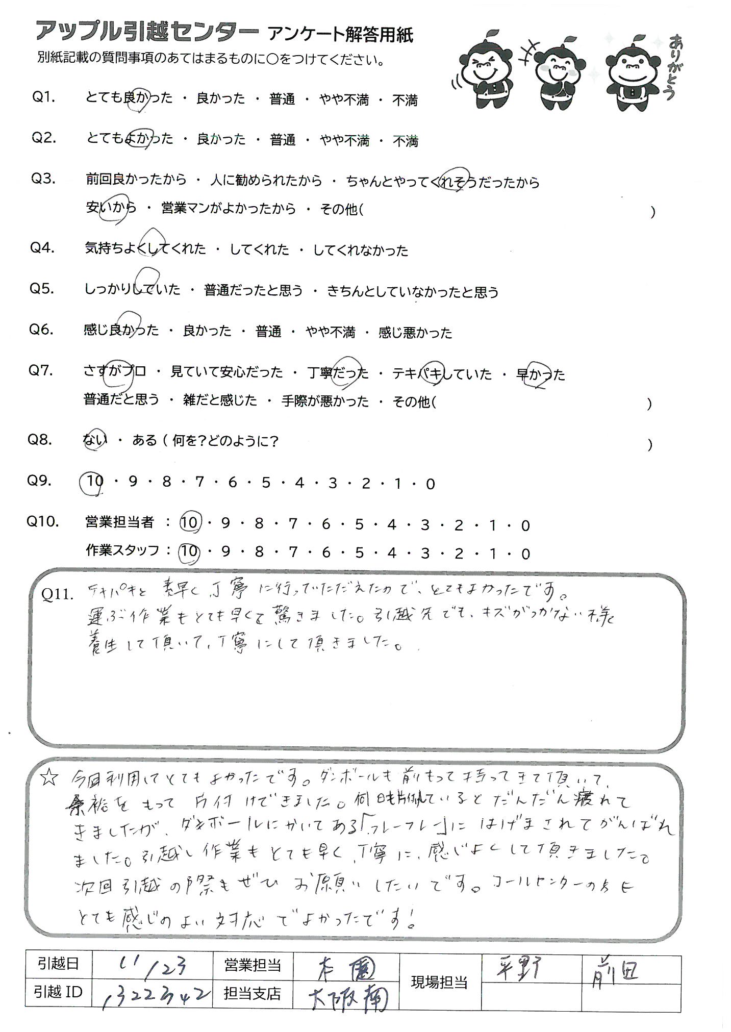A.今回利用してとてもよかったです。ダンボールも前持ってきて頂いて、余裕をもって片付けできました。何日も片付けしているとだんだん疲れてきましたが、ダンボールにかいてある「フレーフレ」にはげまされてがんばれました。引越し作業もとても早く、丁寧に、感じよくして頂きました。 次回引越の際もぜひお願いしたいです。コールセンターの方にとても感じのよい対応でよかったです!