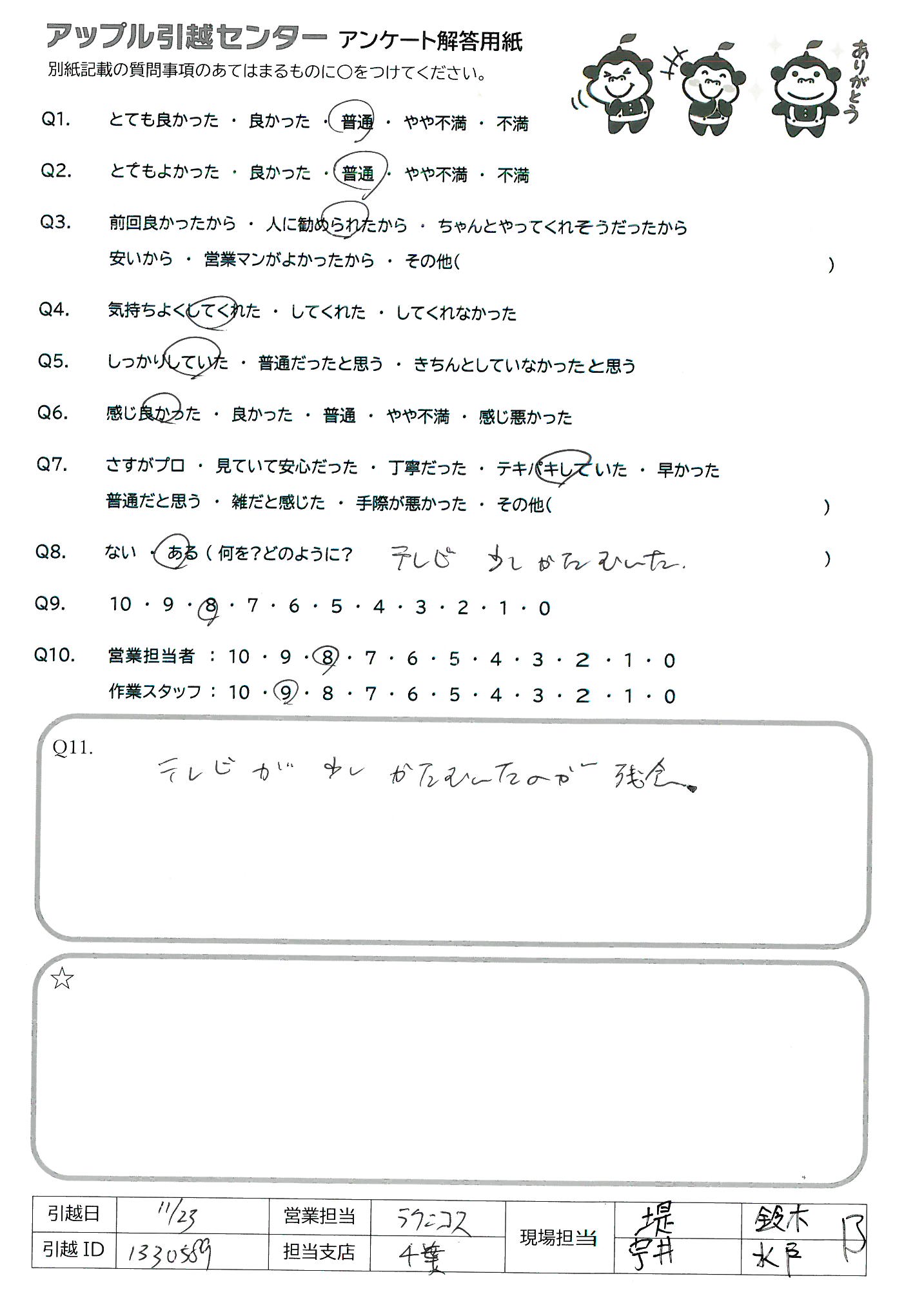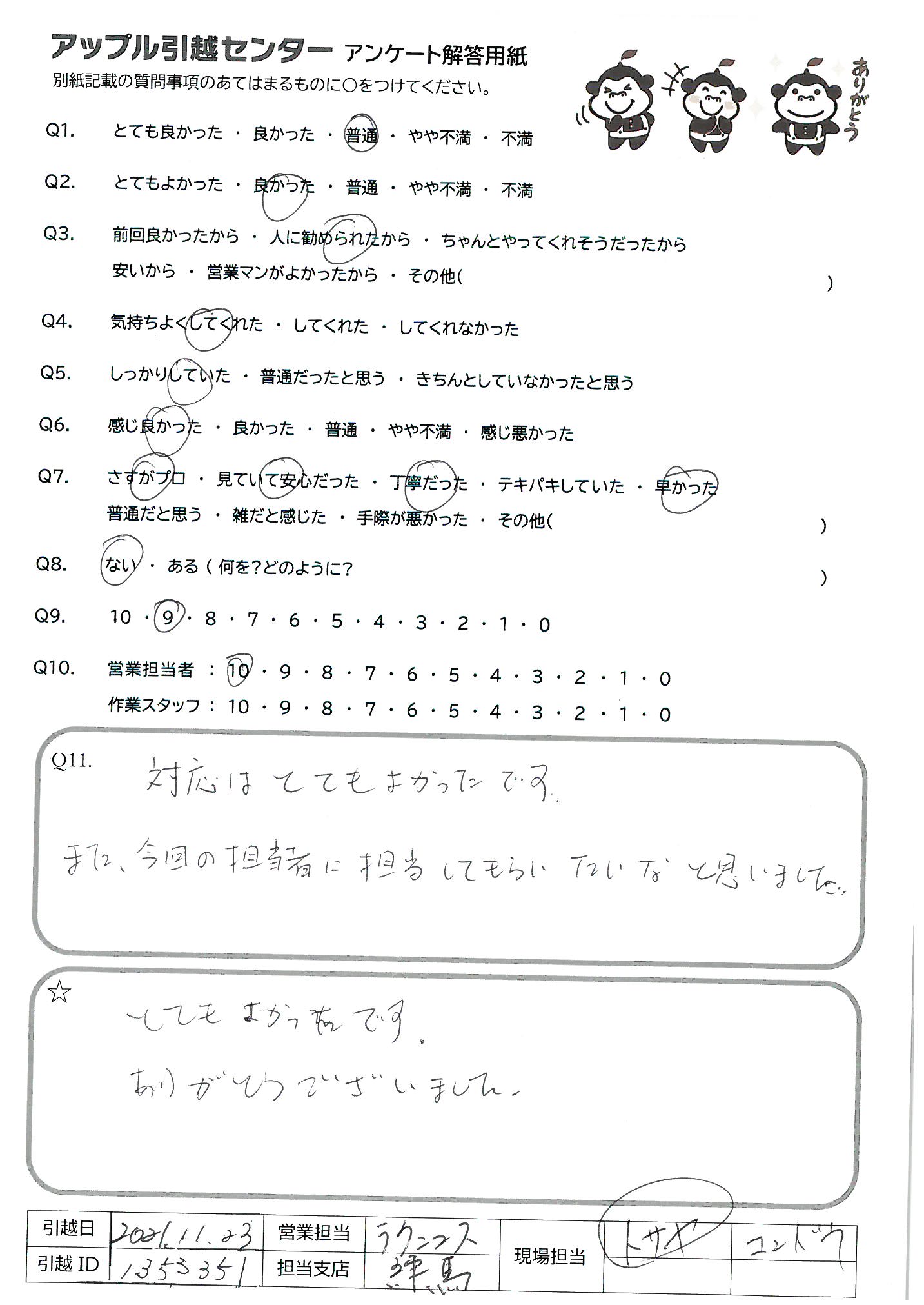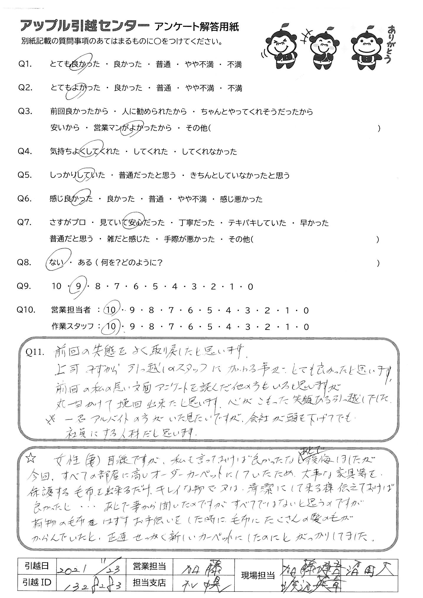 A.前回の失態をよく取り戻したと思います。 上司みずから、引っ越しのスタッフに加わる事がとても良かったと思います。 前回の私の長い文面アンケートを読んだ他の方もいると思いますが丸一日かけて挽回できたと思います。心がこもった笑顔ある引っ越しでした。 ※1名アルバイトの方がいた見たいですが、会社が頭を下げてでも社員にする人材だと思います。