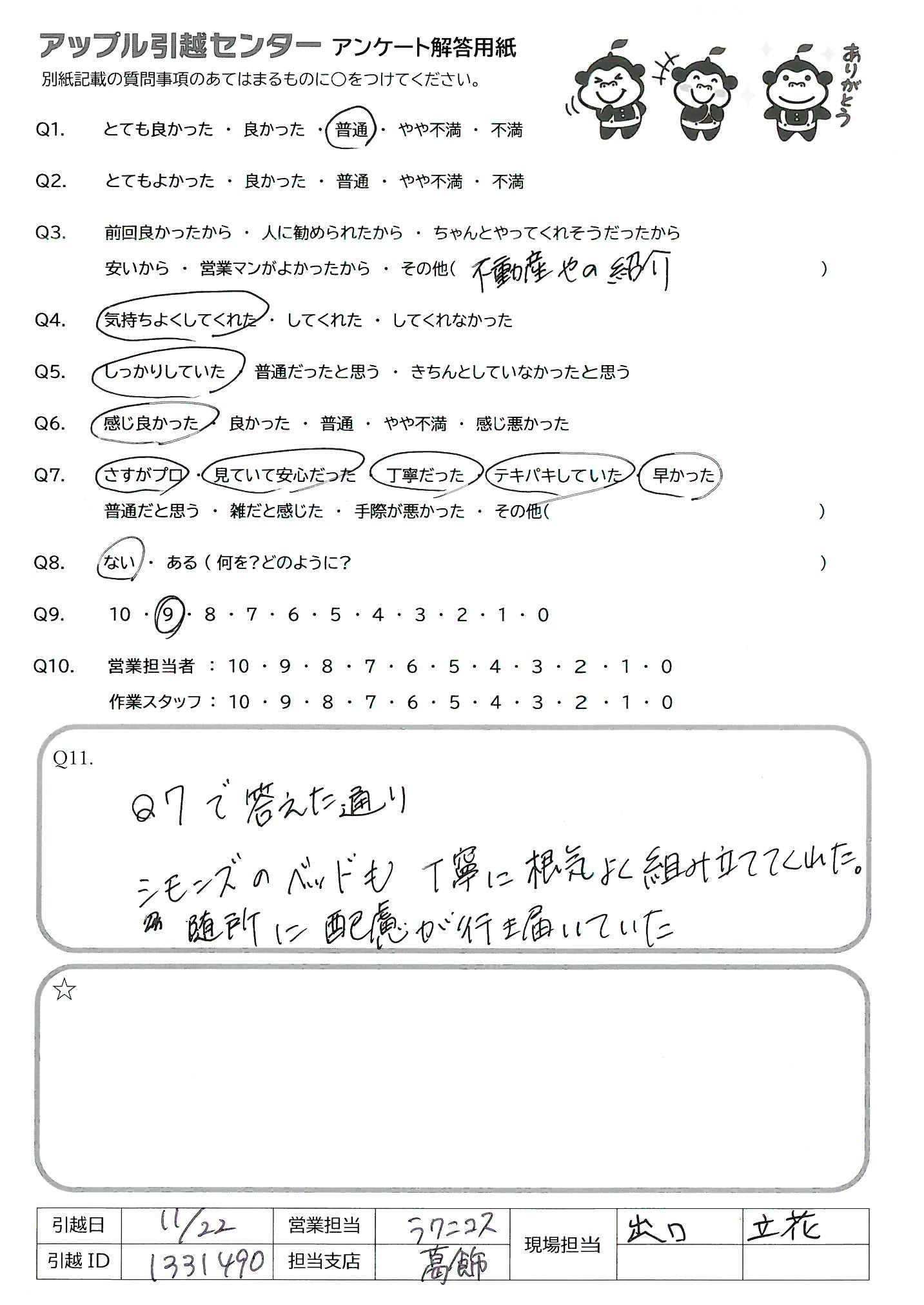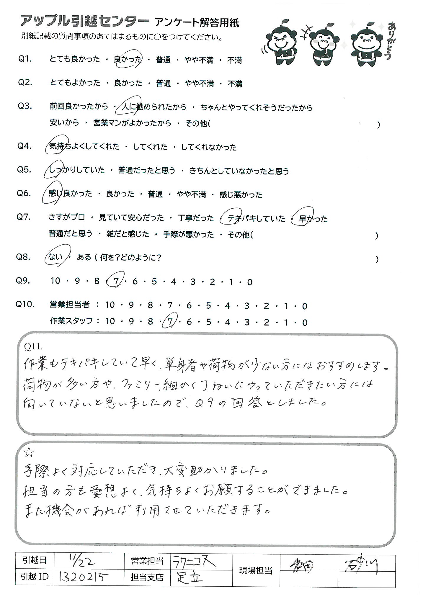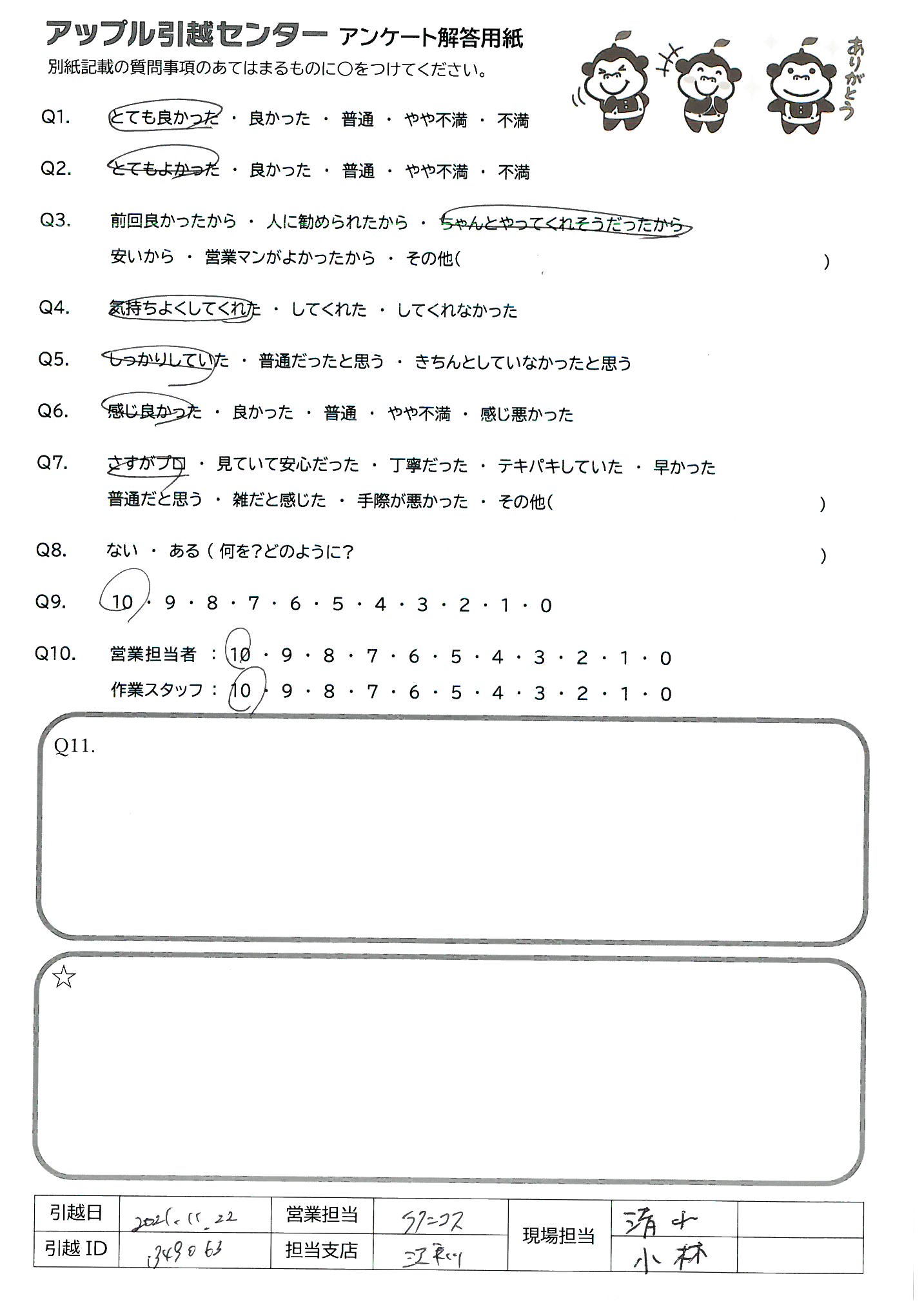 A.作業モテキパキしていて早く、単身者や荷物が少ない方にはおすすめします。 荷物が多い方や、ファミリー細かく丁ねいにやっていただきたい方には向いていないと思いましたので、Q9の回答としました。