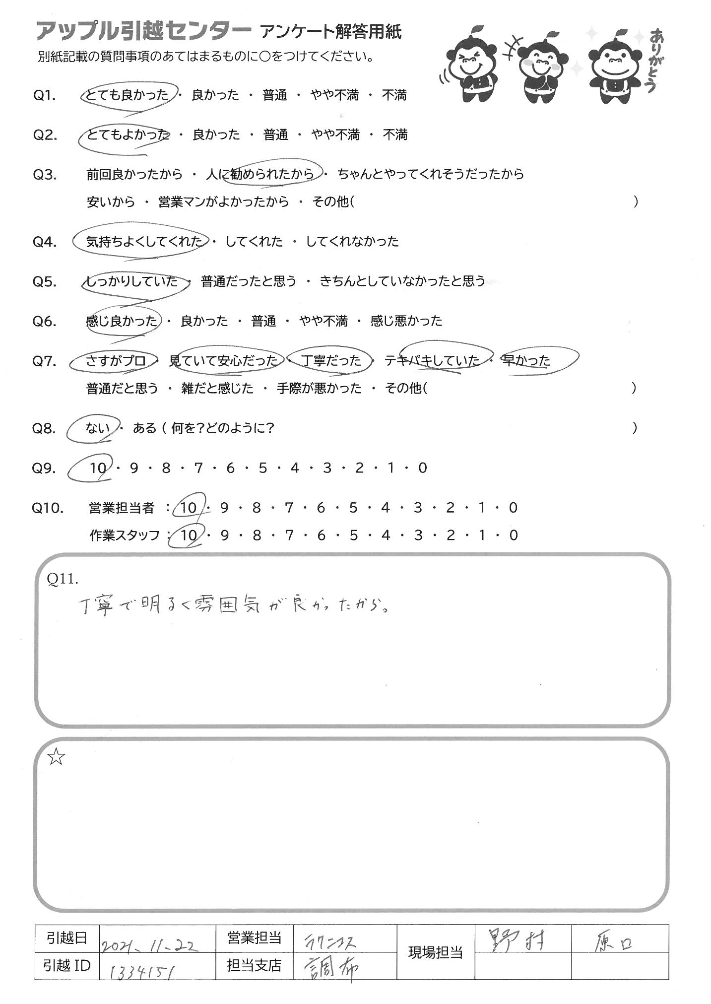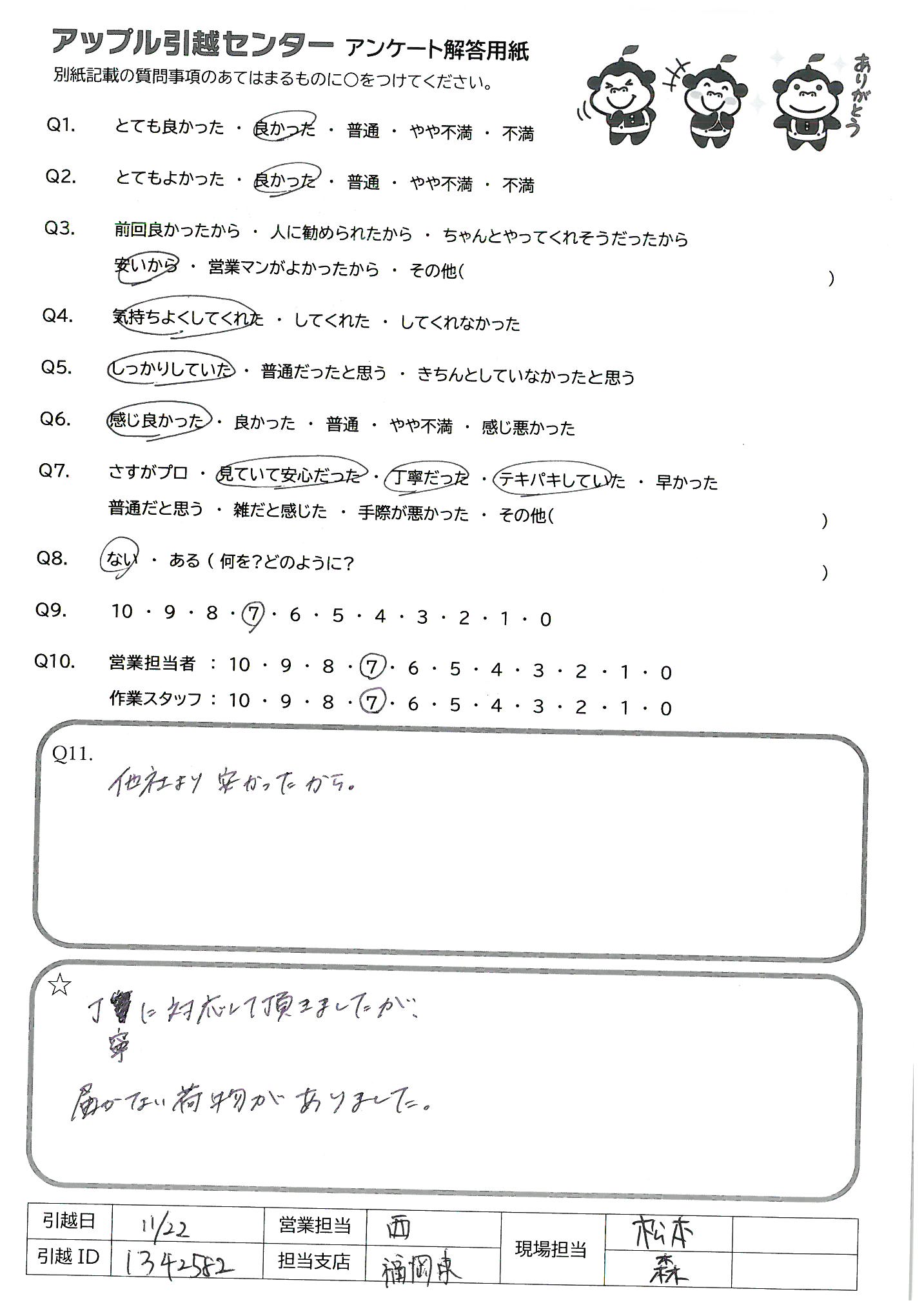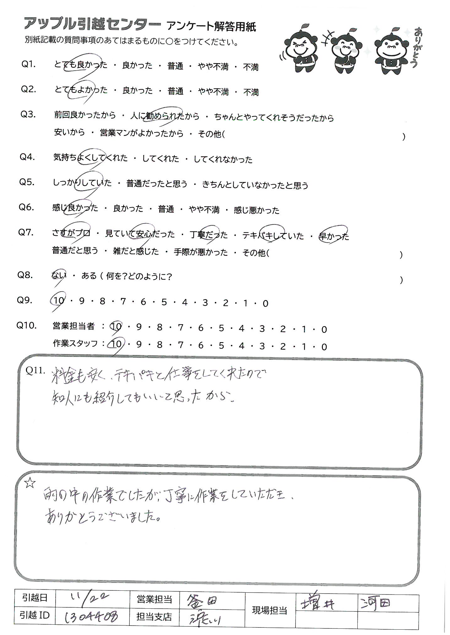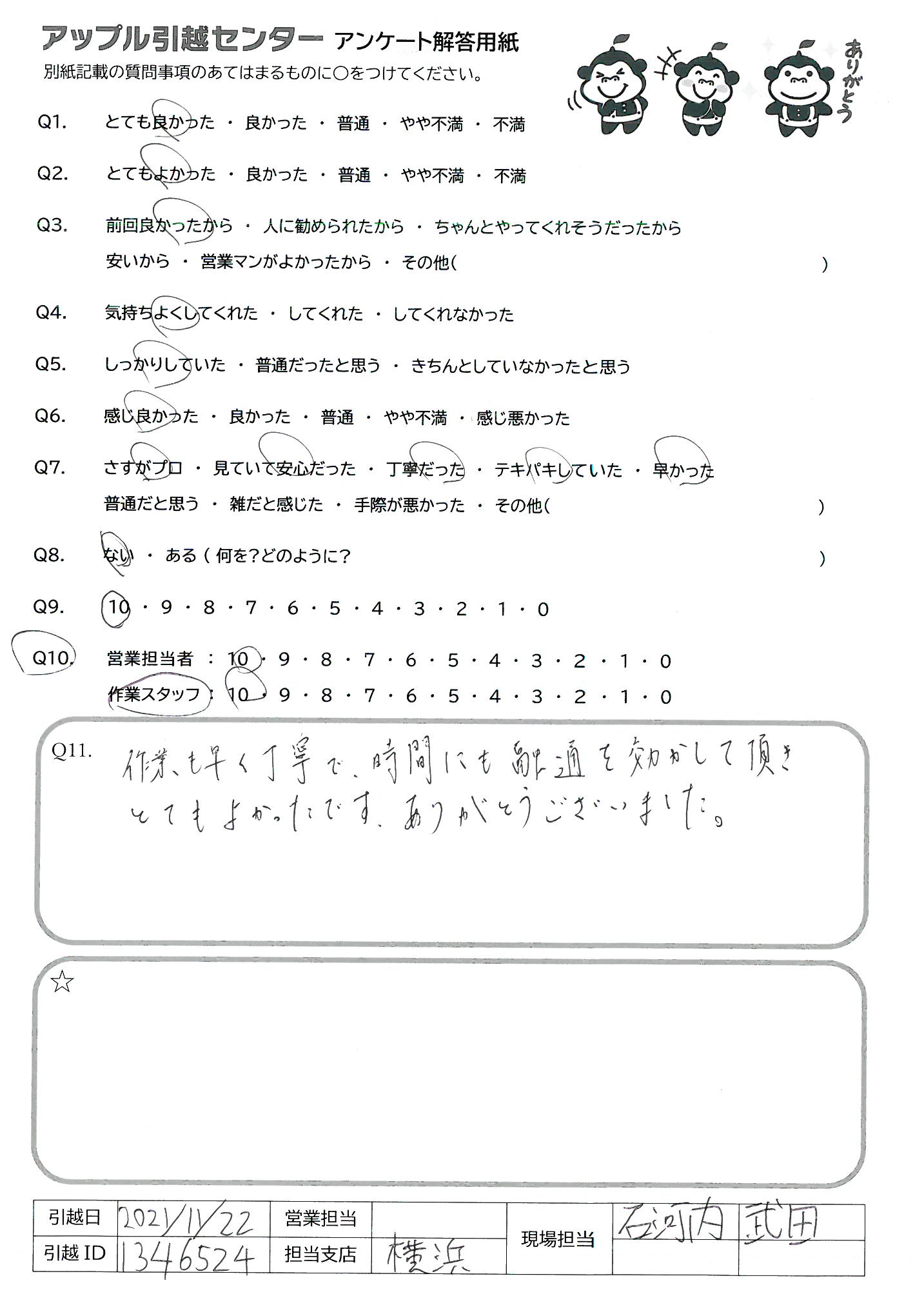 A.作業モテキパキしていて早く、単身者や荷物が少ない方にはおすすめします。 荷物が多い方や、ファミリー細かく丁ねいにやっていただきたい方には向いていないと思いましたので、Q9の回答としました。