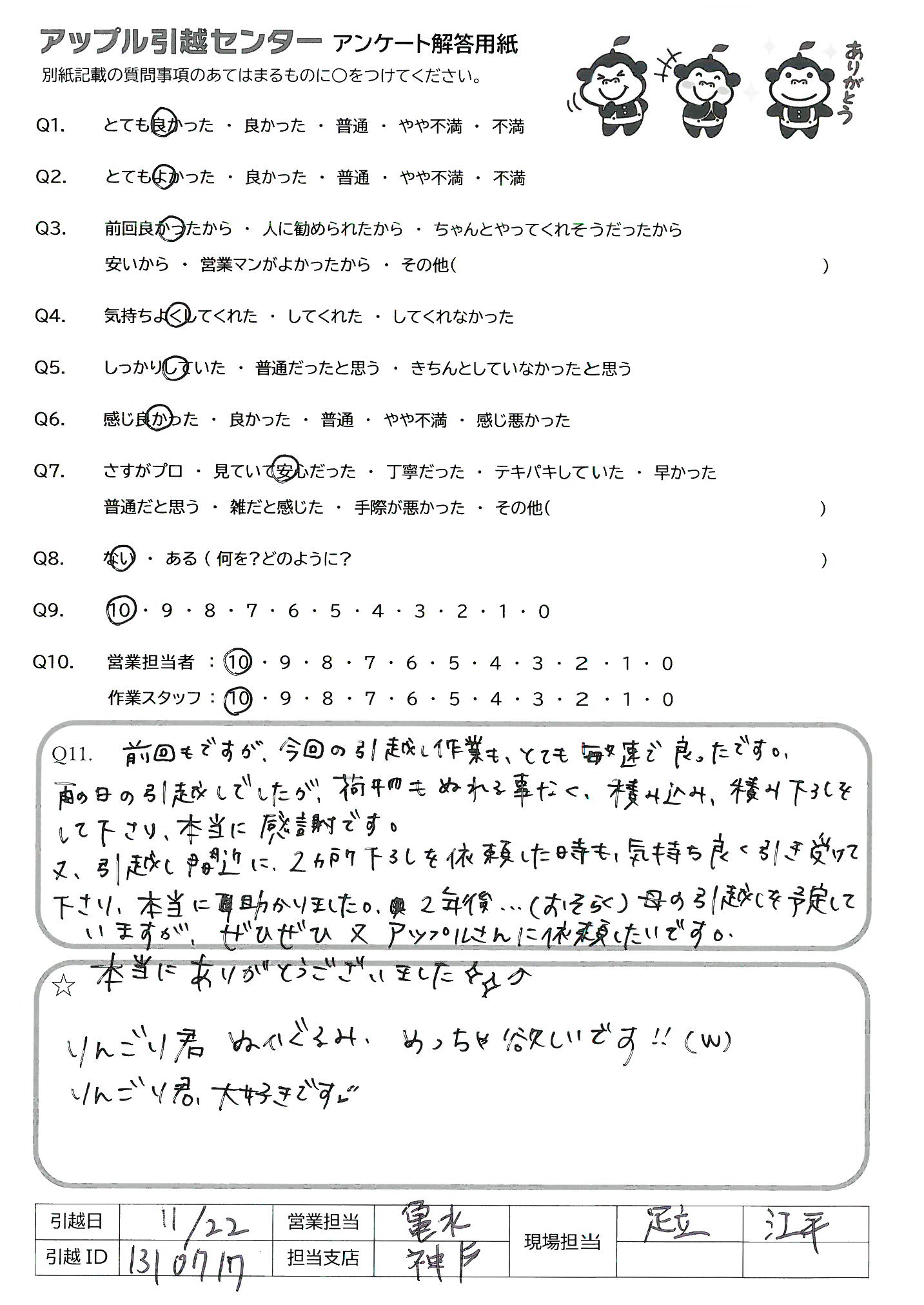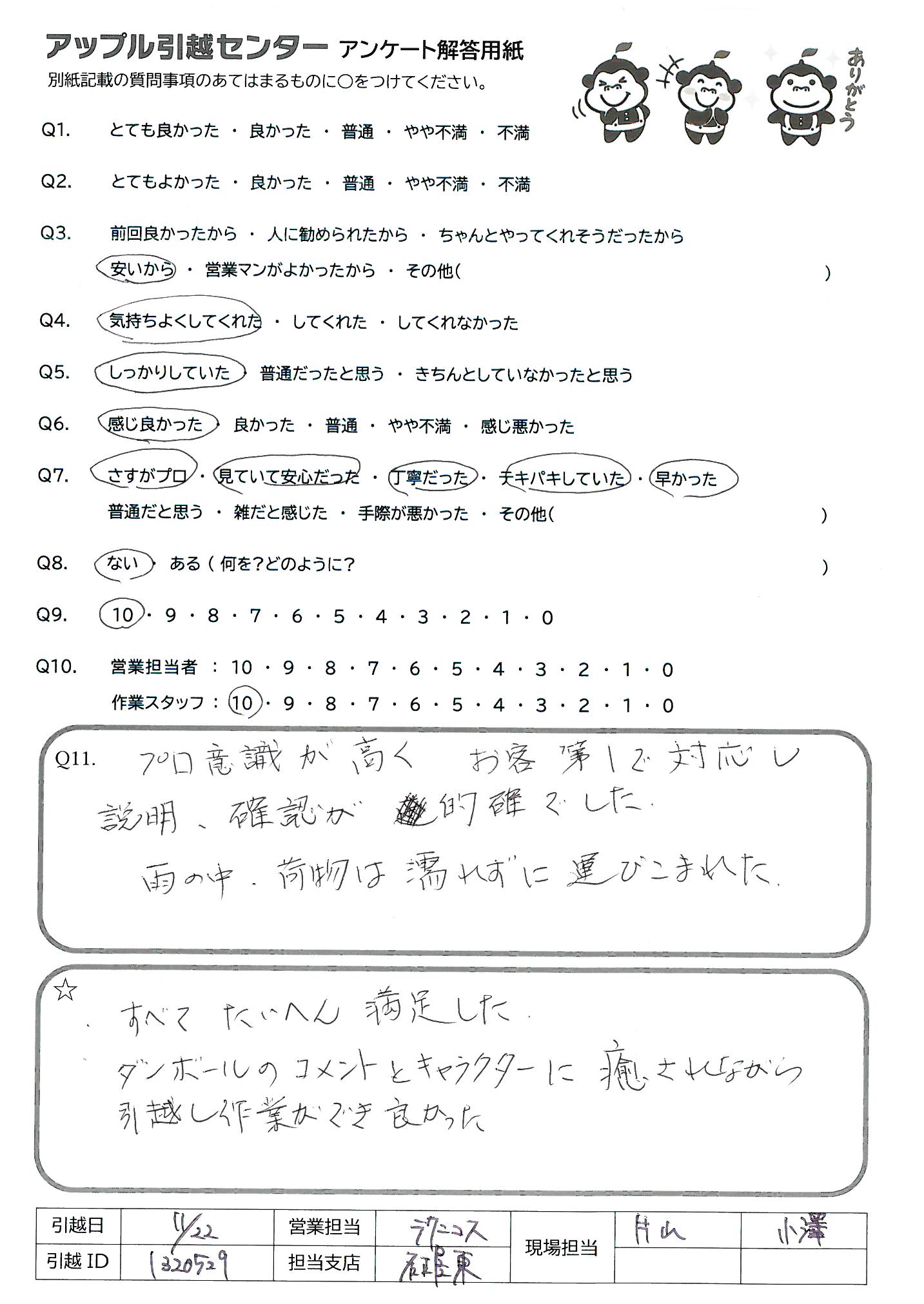 A.前回もですが、今回の引越し作業も、とても敏速で良ったです。 雨の日の引越しでしたが、荷物もぬれることなく、積み込み、積み下ろしをして下さり、本当に感謝です。 又、引越し間近に2ヶ所下ろしを依頼した時も、気持ちよく引き受けて下さり、本当に助かりました。2年後…(おそらく)母の引越しを予定していますが、ぜひぜひ又アップルさんに依頼したいです。