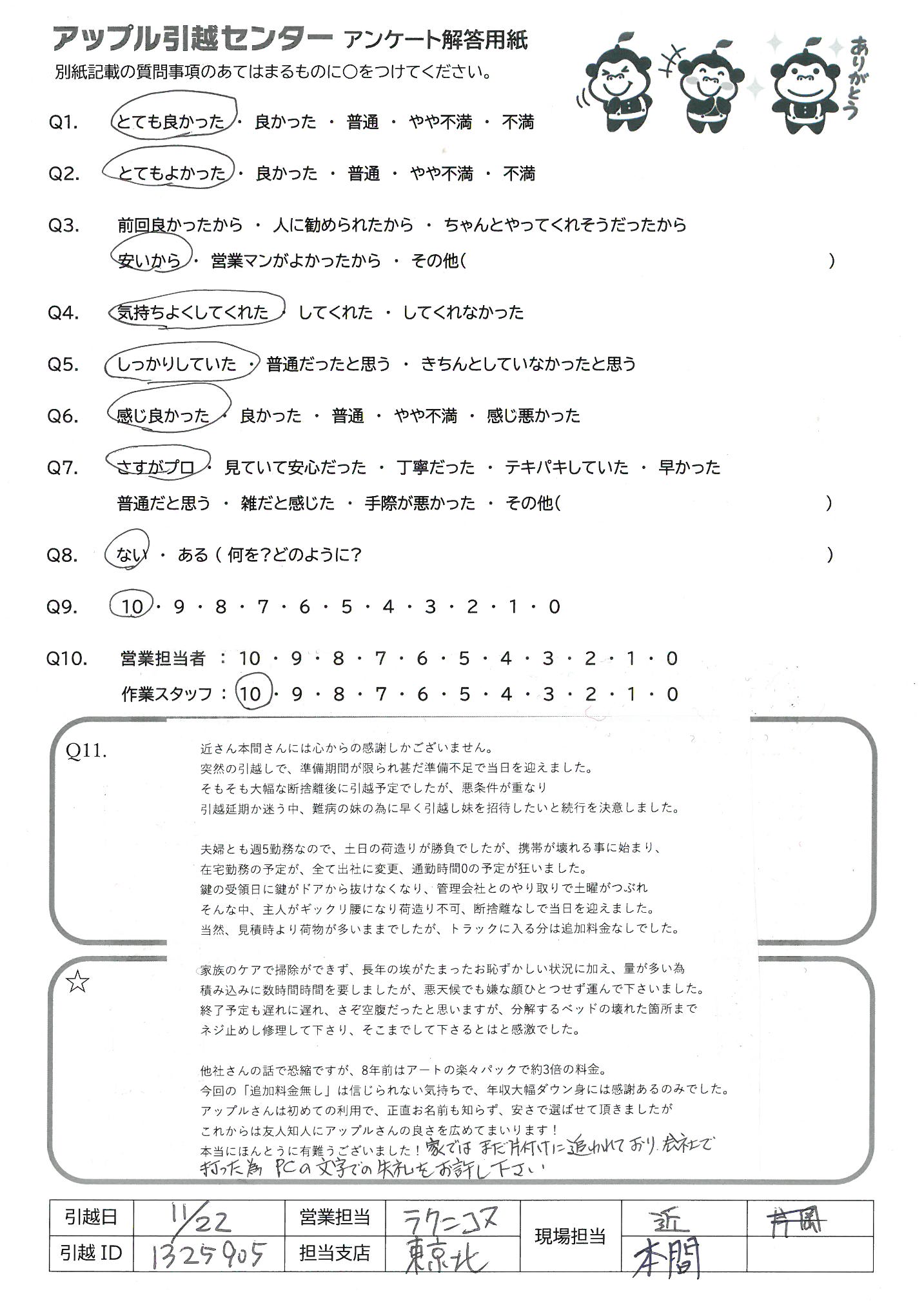 A.家族のケアで掃除ができず、長年の埃がたまったお恥ずかしい状況に加え、量が多い為積み込みに数時間時間を要しましたが、悪天候でも嫌な顔ひとつせず運んでくださいました。 終了予定も遅れに遅れ、さぞ空腹だったと思いますが、分解するベッドの壊れた箇所までネジ止めし修理して下さり、そこまでして下さるとは感激でした。 他社さんの話で恐縮ですが、8年前はアートの楽々パックで約3倍の料金。今回の「追加料金無し」は信じられない気持ちで、年収大幅ダウン身には感謝あるのみでした。アップルさんは初めての利用で、正直お名前も知らず、安さで選ばせて頂きましたがこれからは友人知人にアップルさんの良さを広めてまいります!本当にほんとうに有難うございました!家ではまだ片付けに追われており、会社で打った為、PCの文字での失礼をお許し下さい