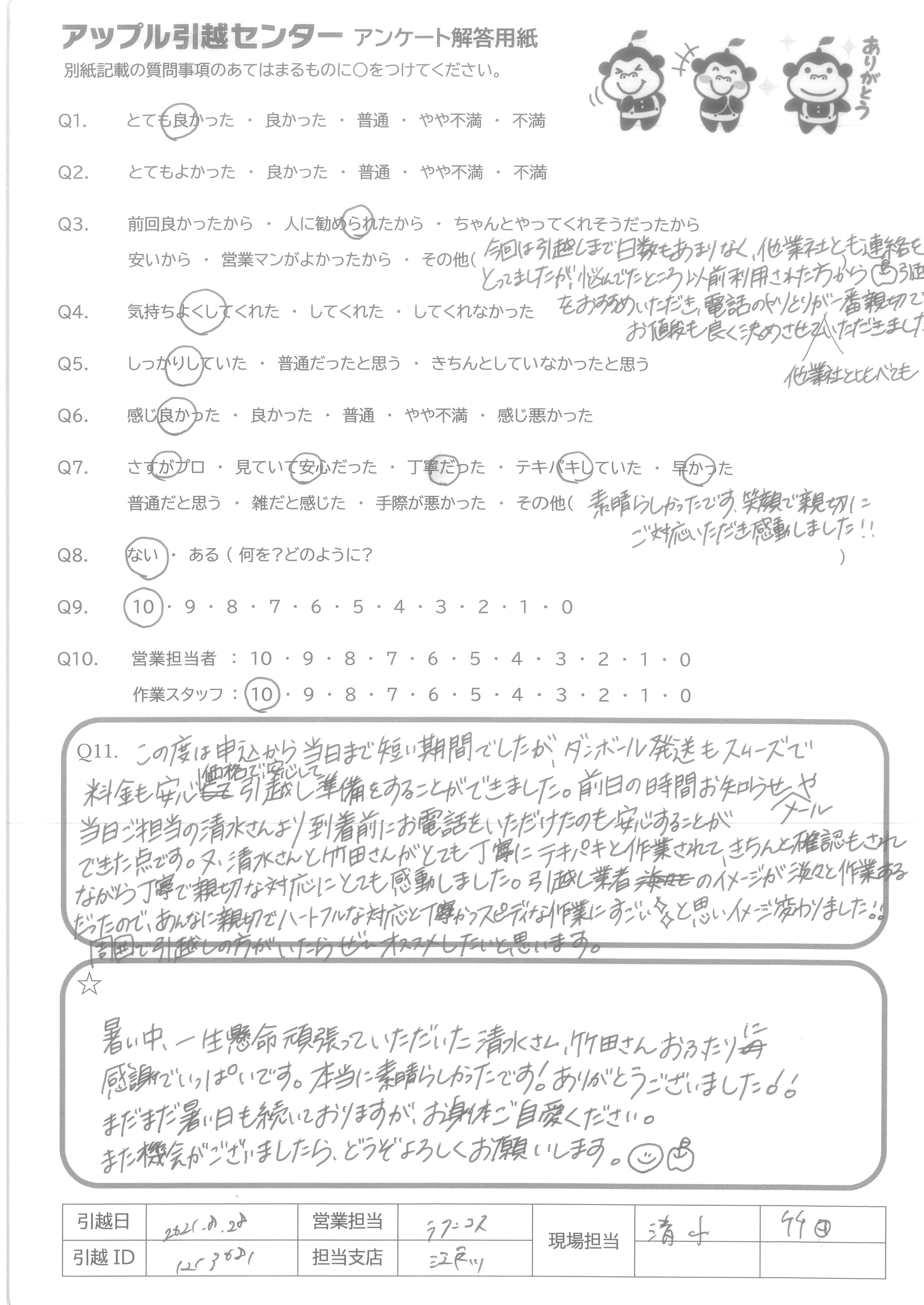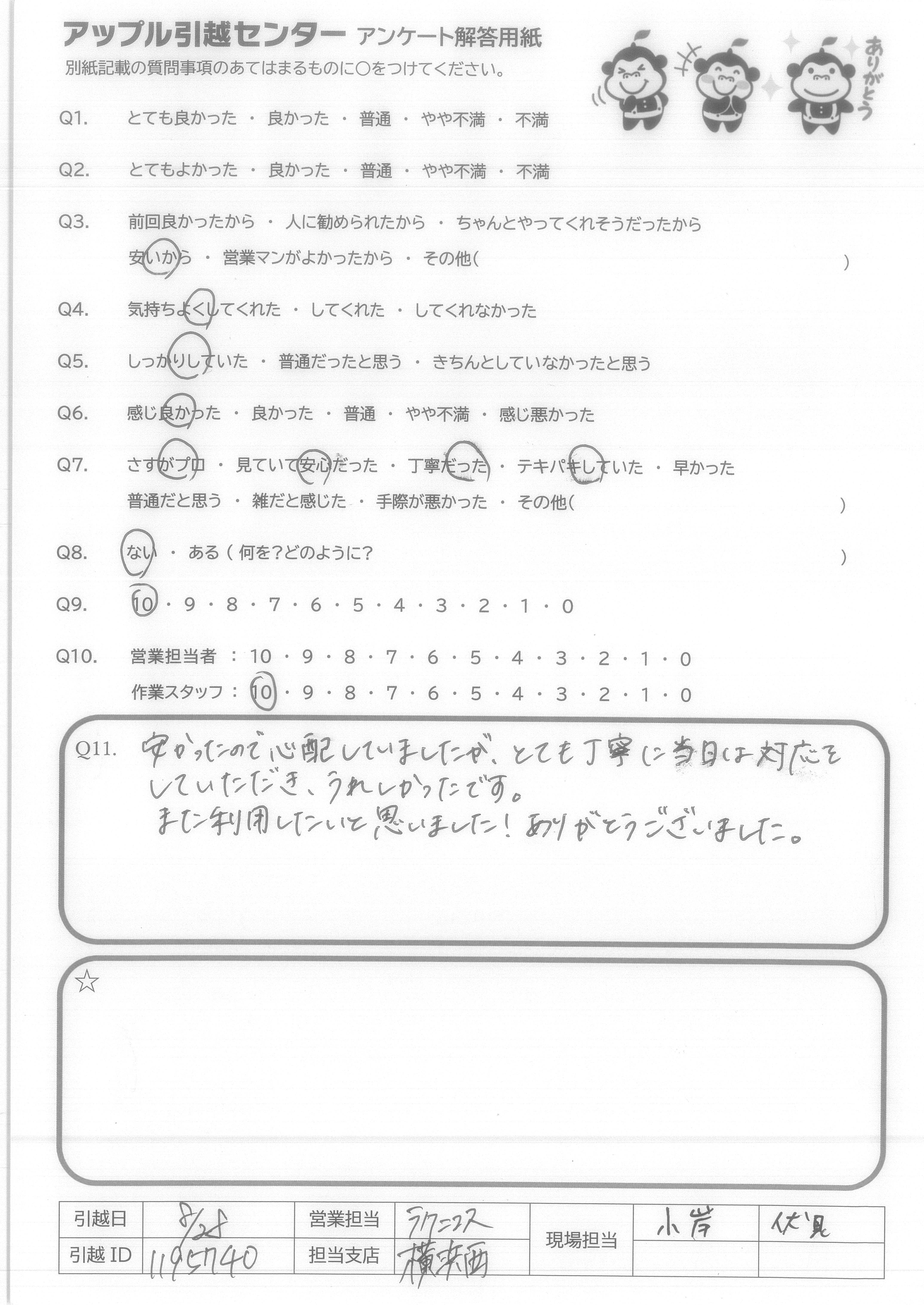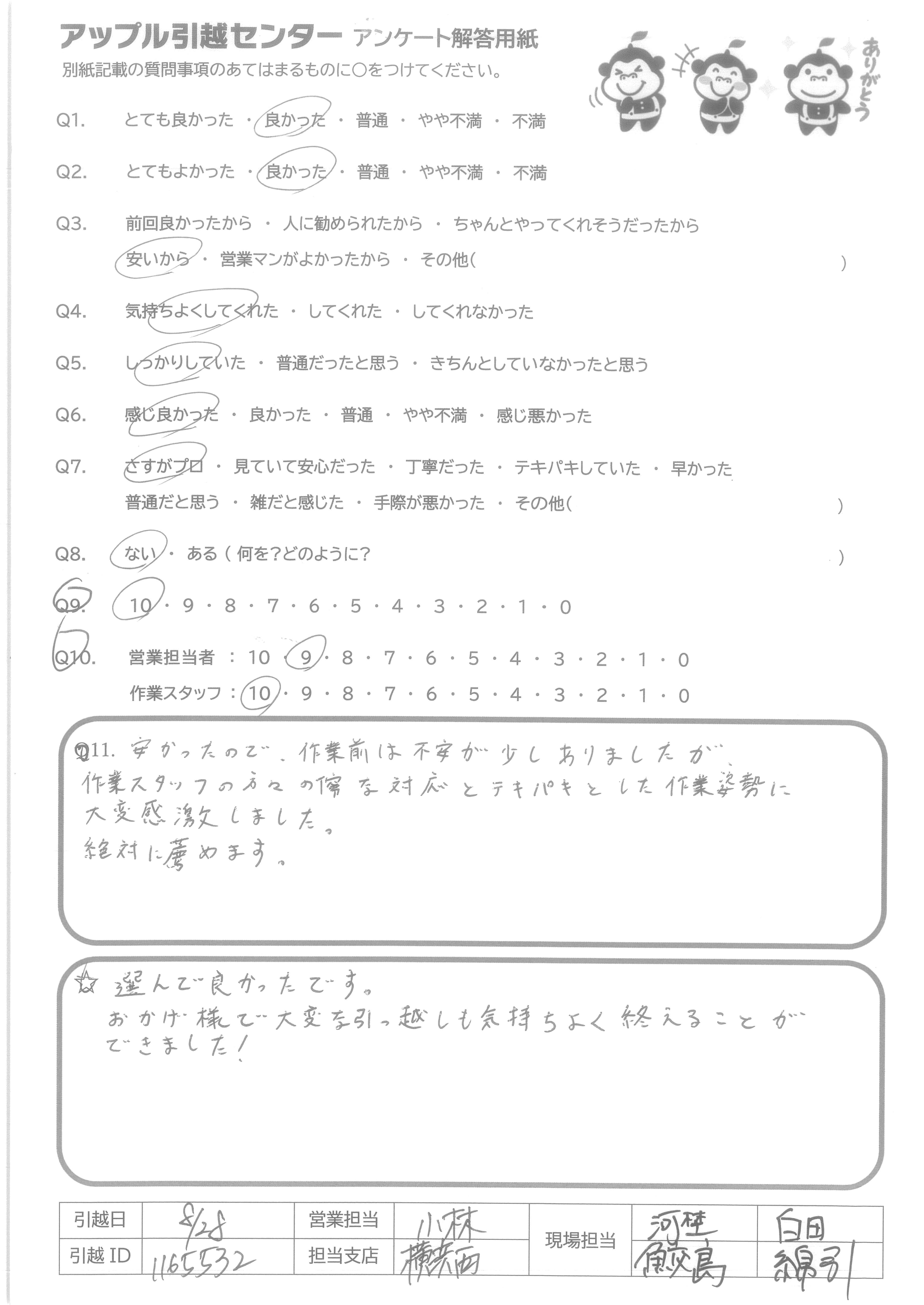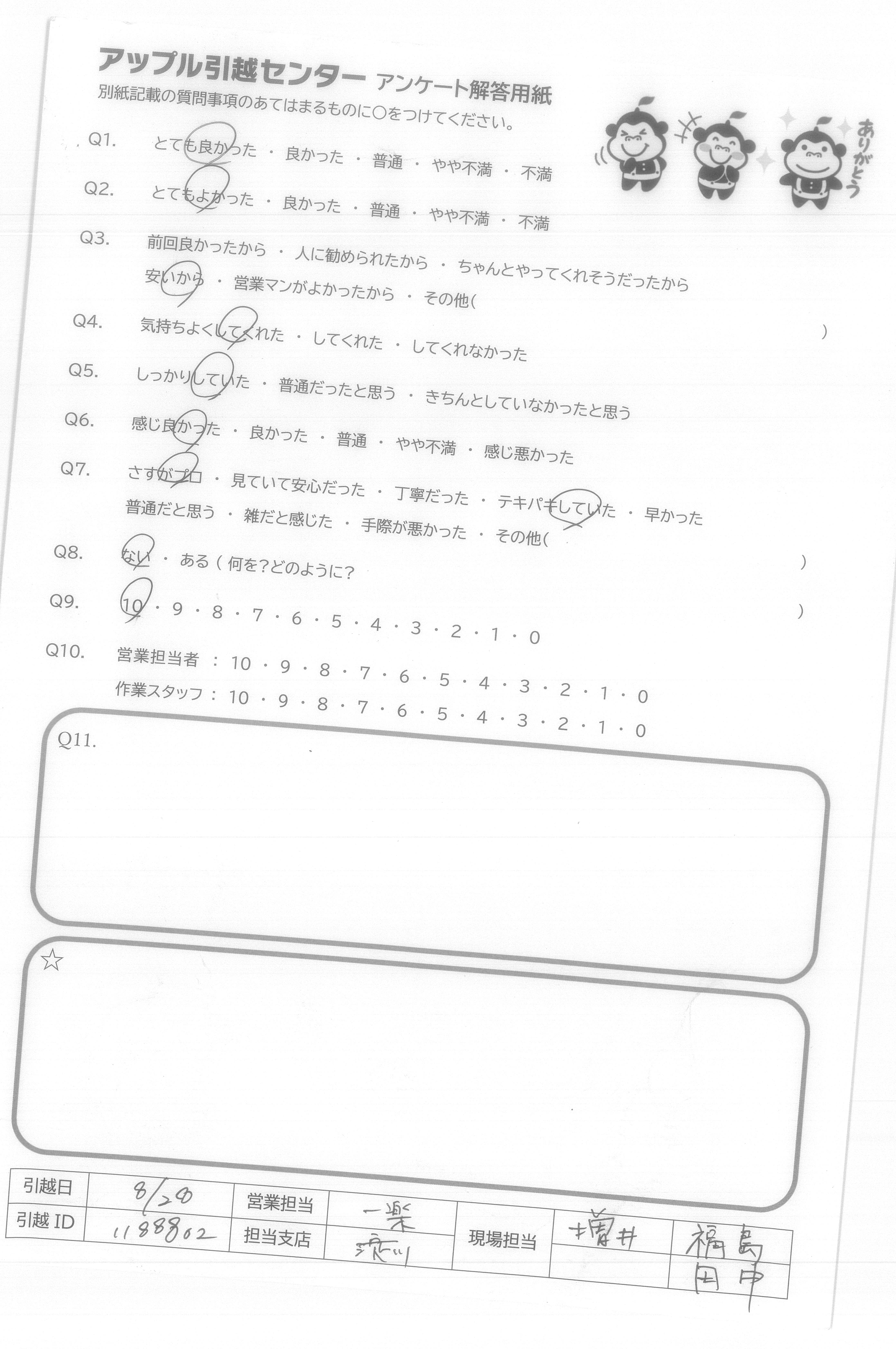 A.Q9:当日の不要品引取や洗タク機台の案内など、柔軟な対応をしてくれたので。 Q10:特に当日作業のお2人は、暑い中、気持ち良くまた手際良く作業をして下さり、デスクの解体組み直しも心良く御対応下さったため。