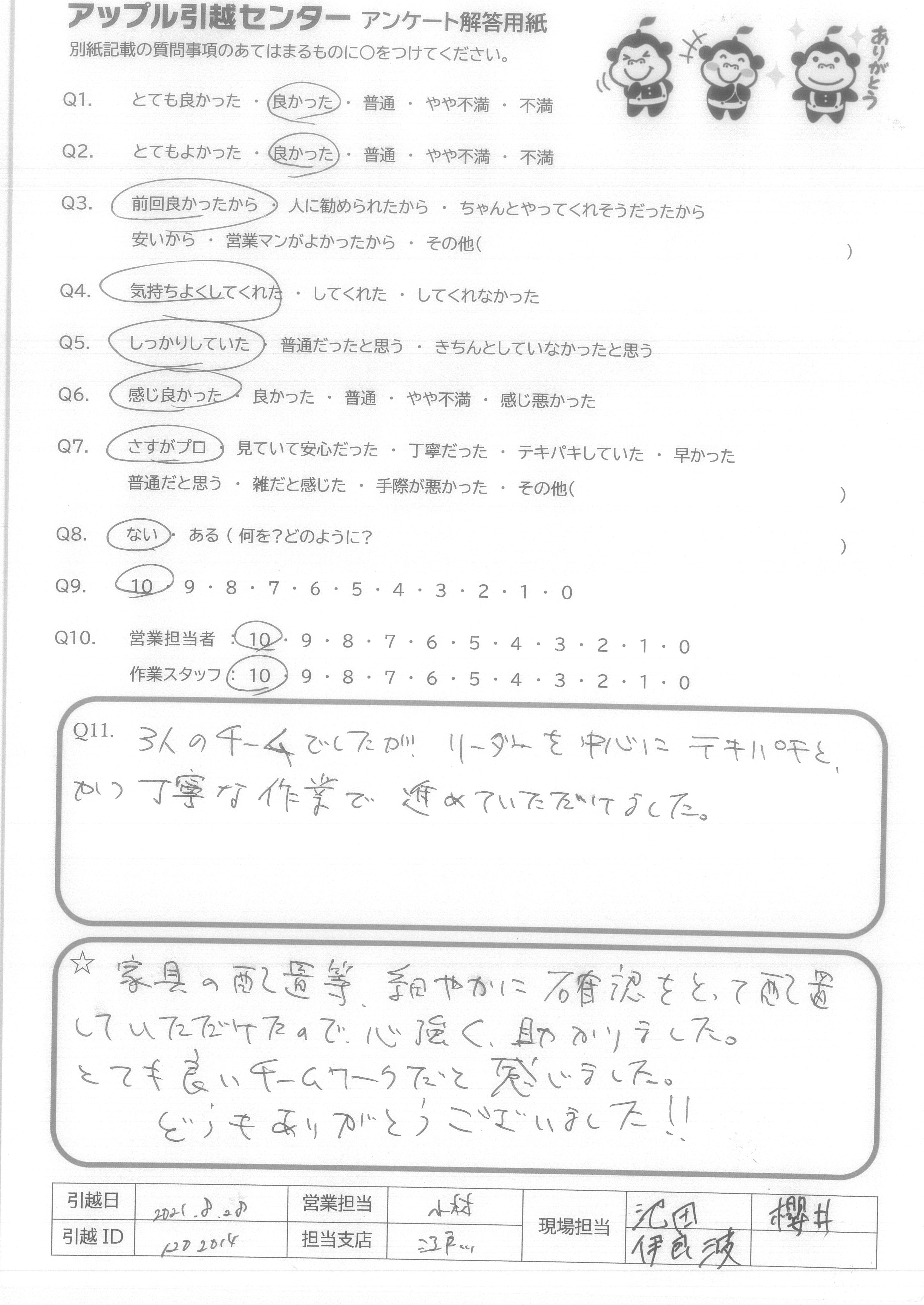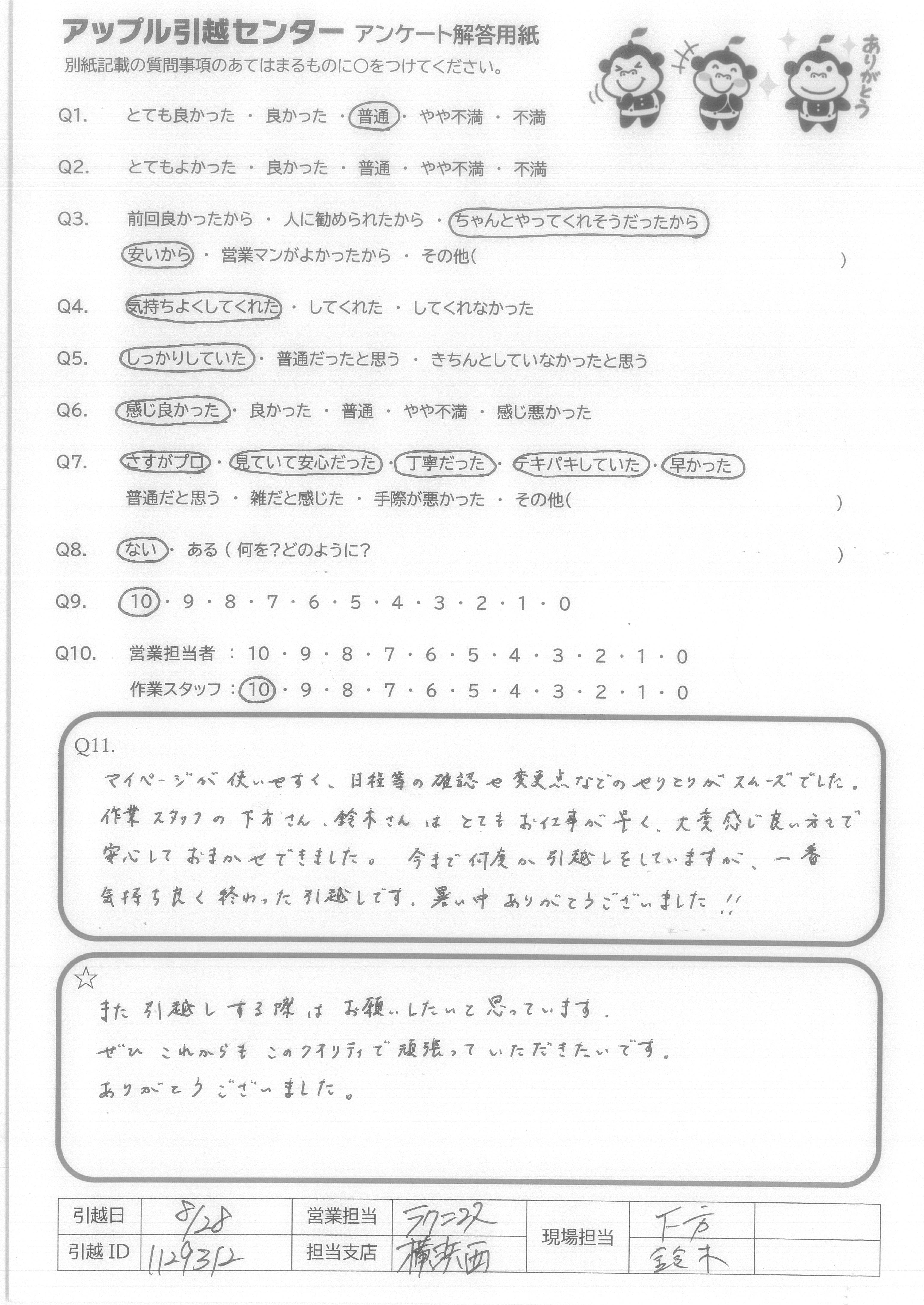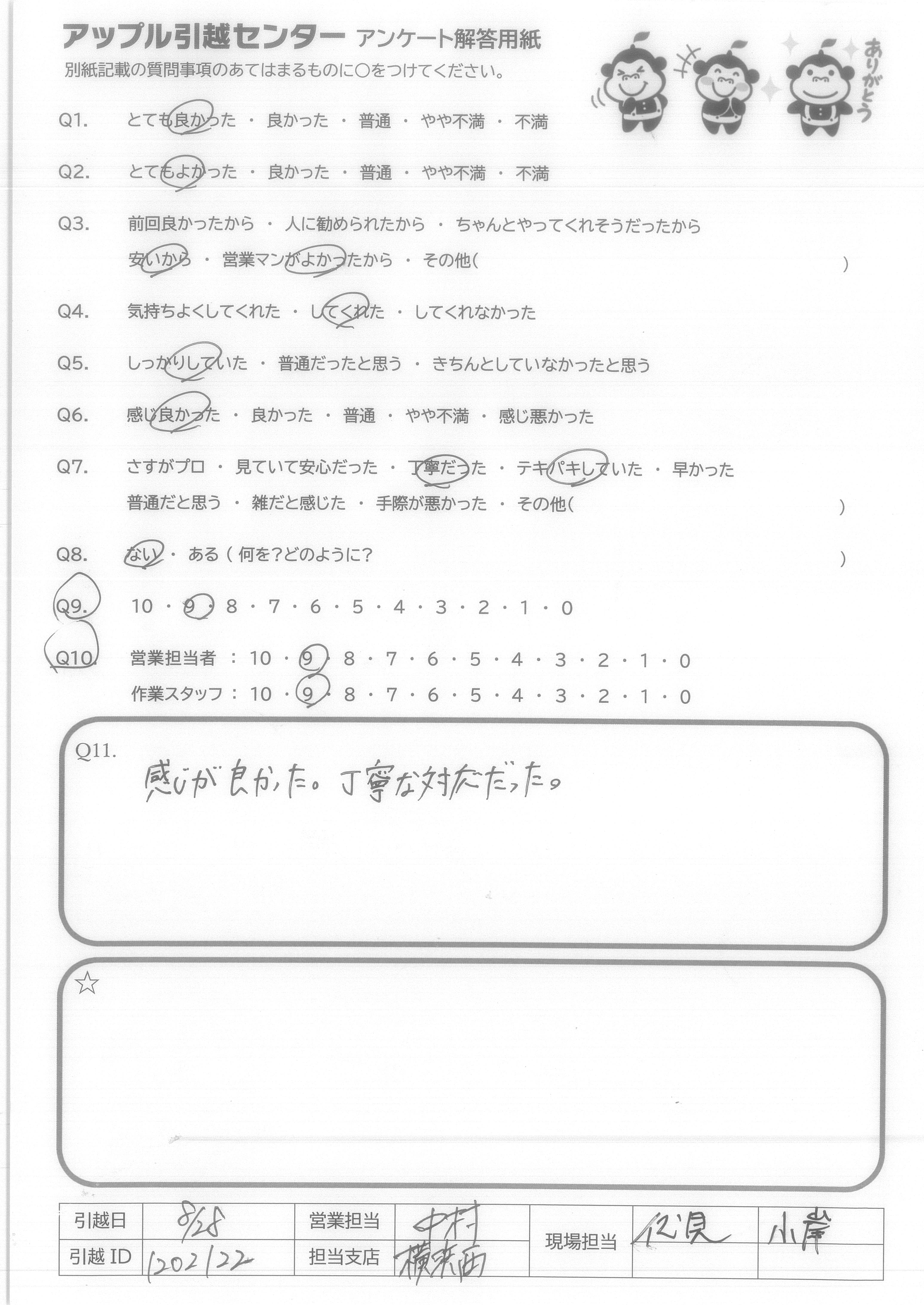 A.Q9:当日の不要品引取や洗タク機台の案内など、柔軟な対応をしてくれたので。 Q10:特に当日作業のお2人は、暑い中、気持ち良くまた手際良く作業をして下さり、デスクの解体組み直しも心良く御対応下さったため。