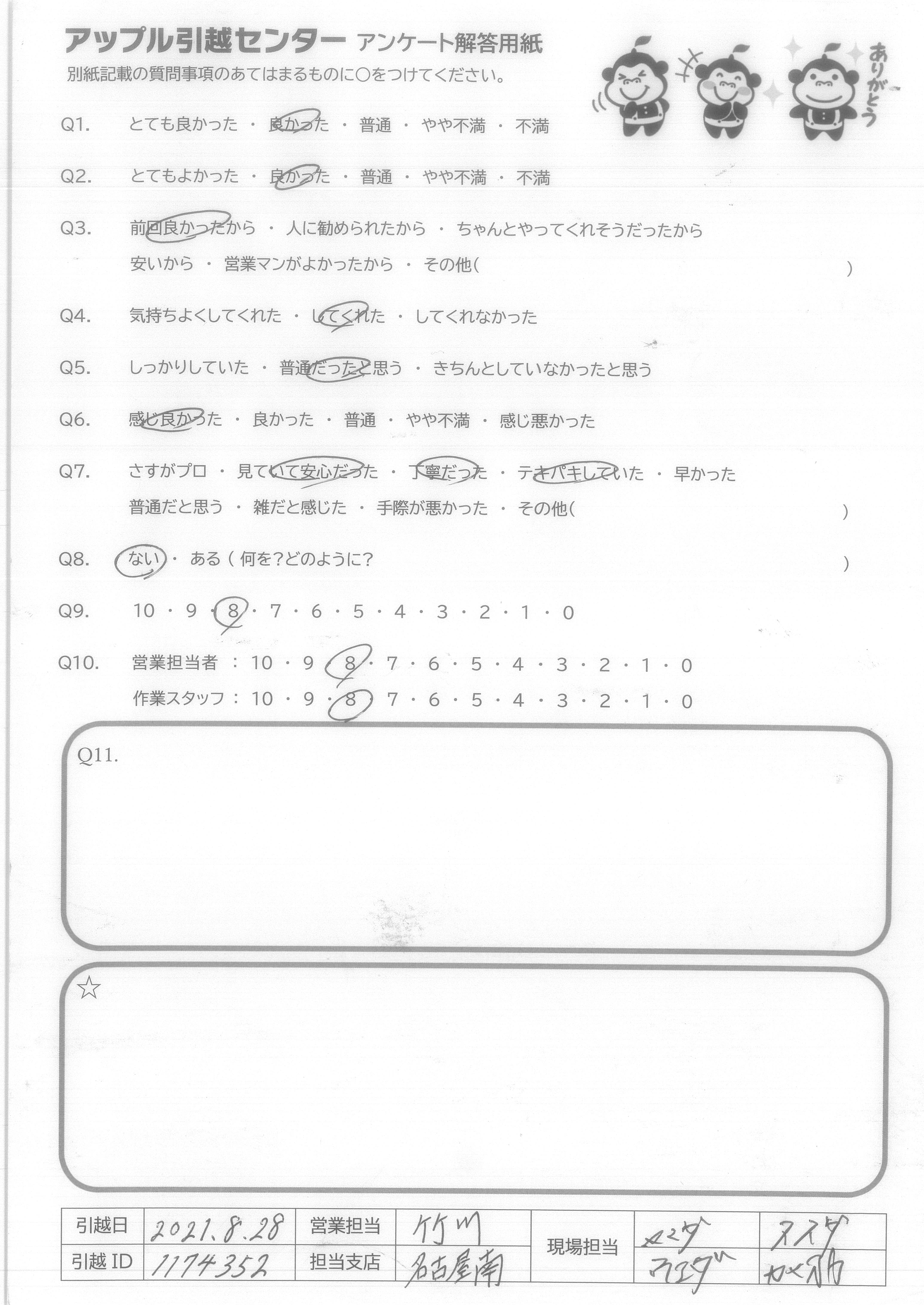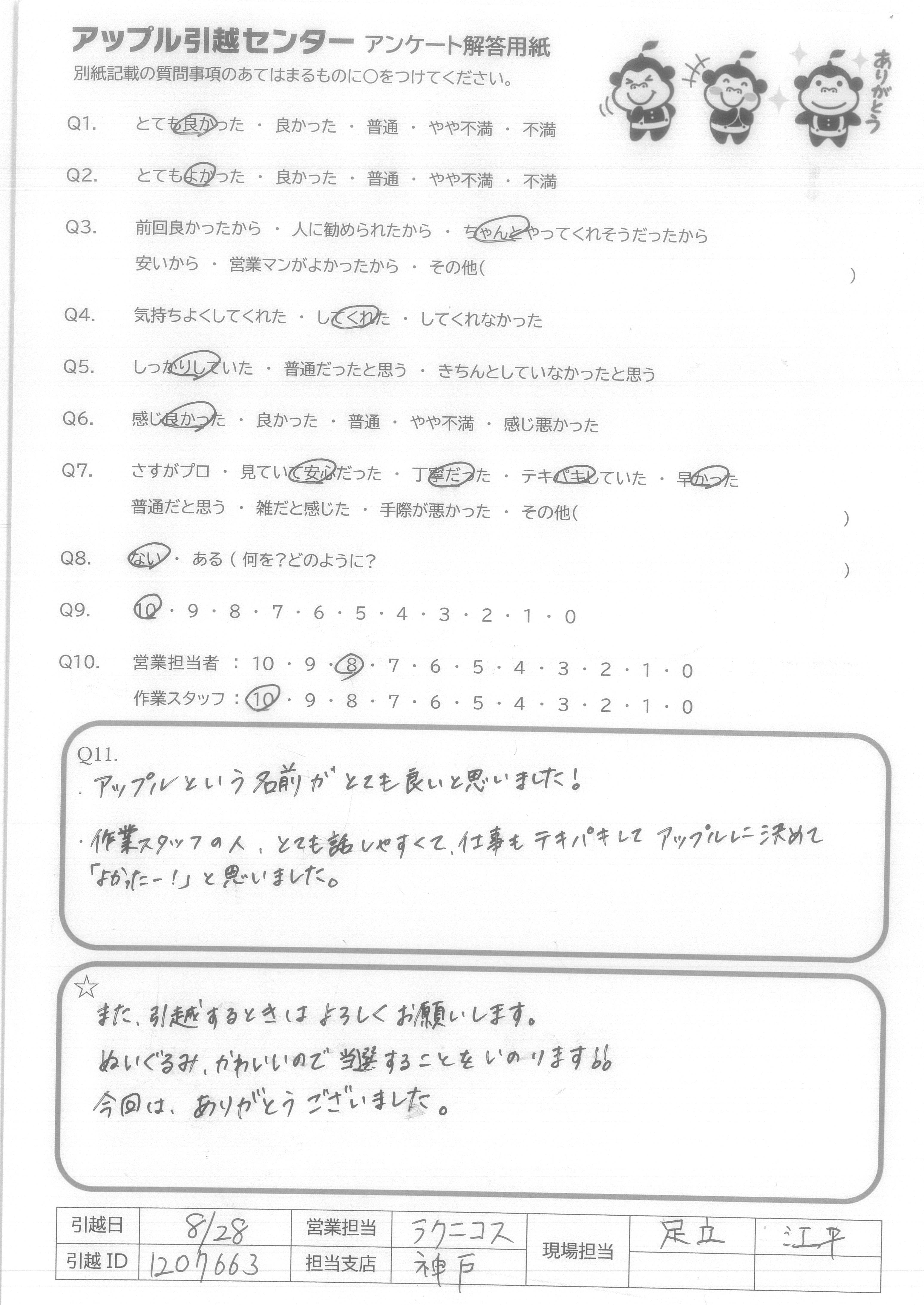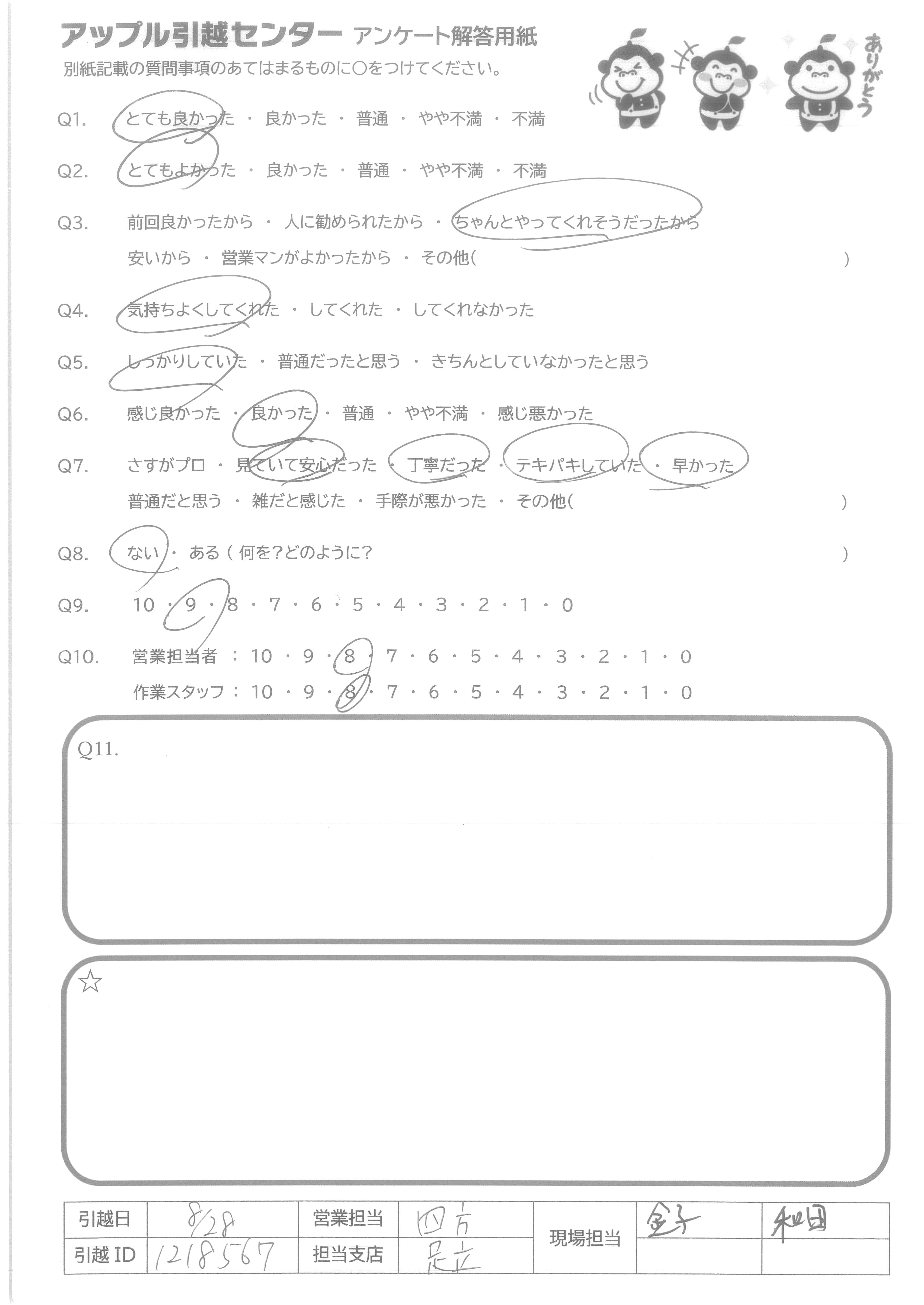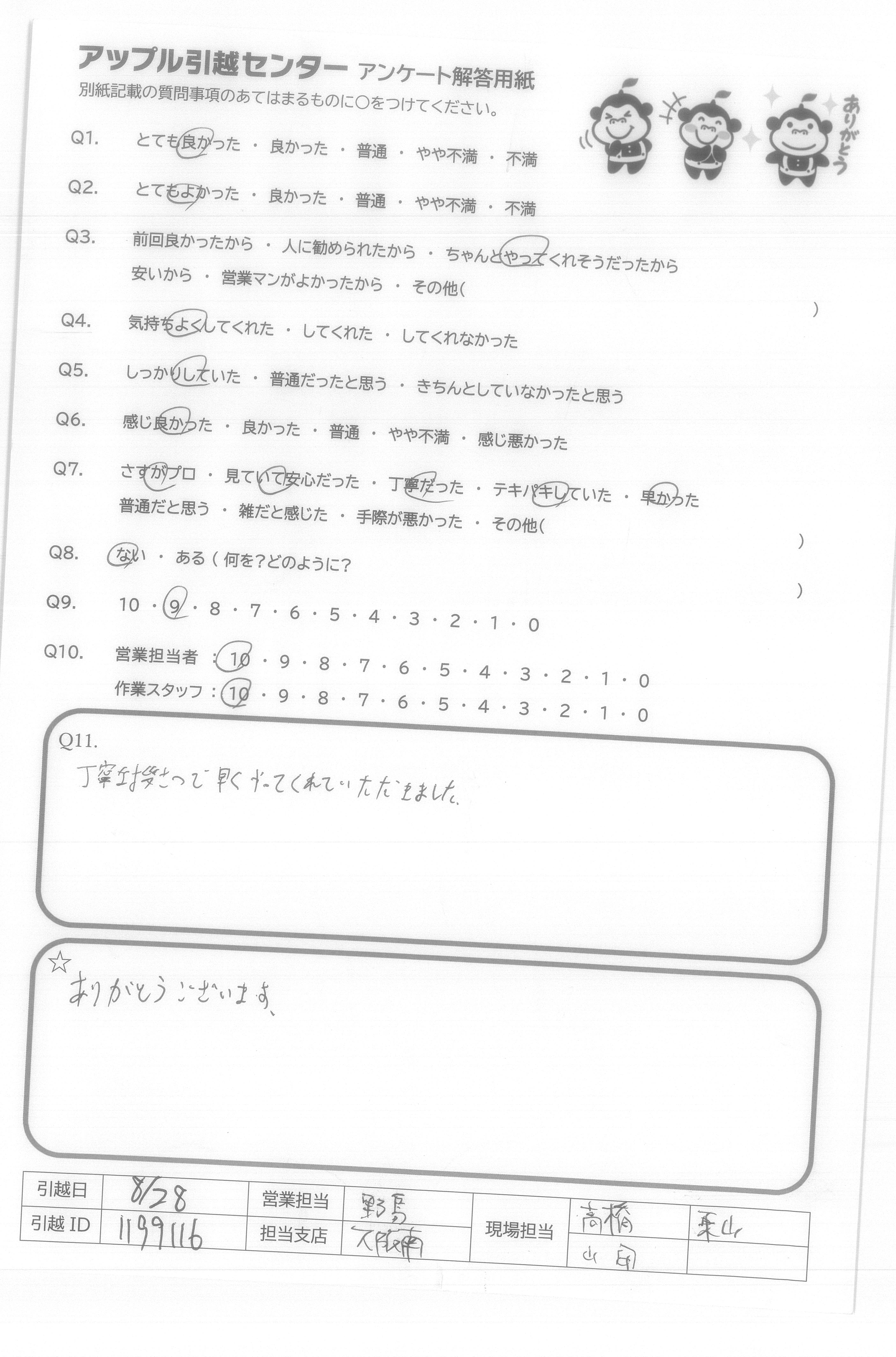 A.Q9:当日の不要品引取や洗タク機台の案内など、柔軟な対応をしてくれたので。 Q10:特に当日作業のお2人は、暑い中、気持ち良くまた手際良く作業をして下さり、デスクの解体組み直しも心良く御対応下さったため。