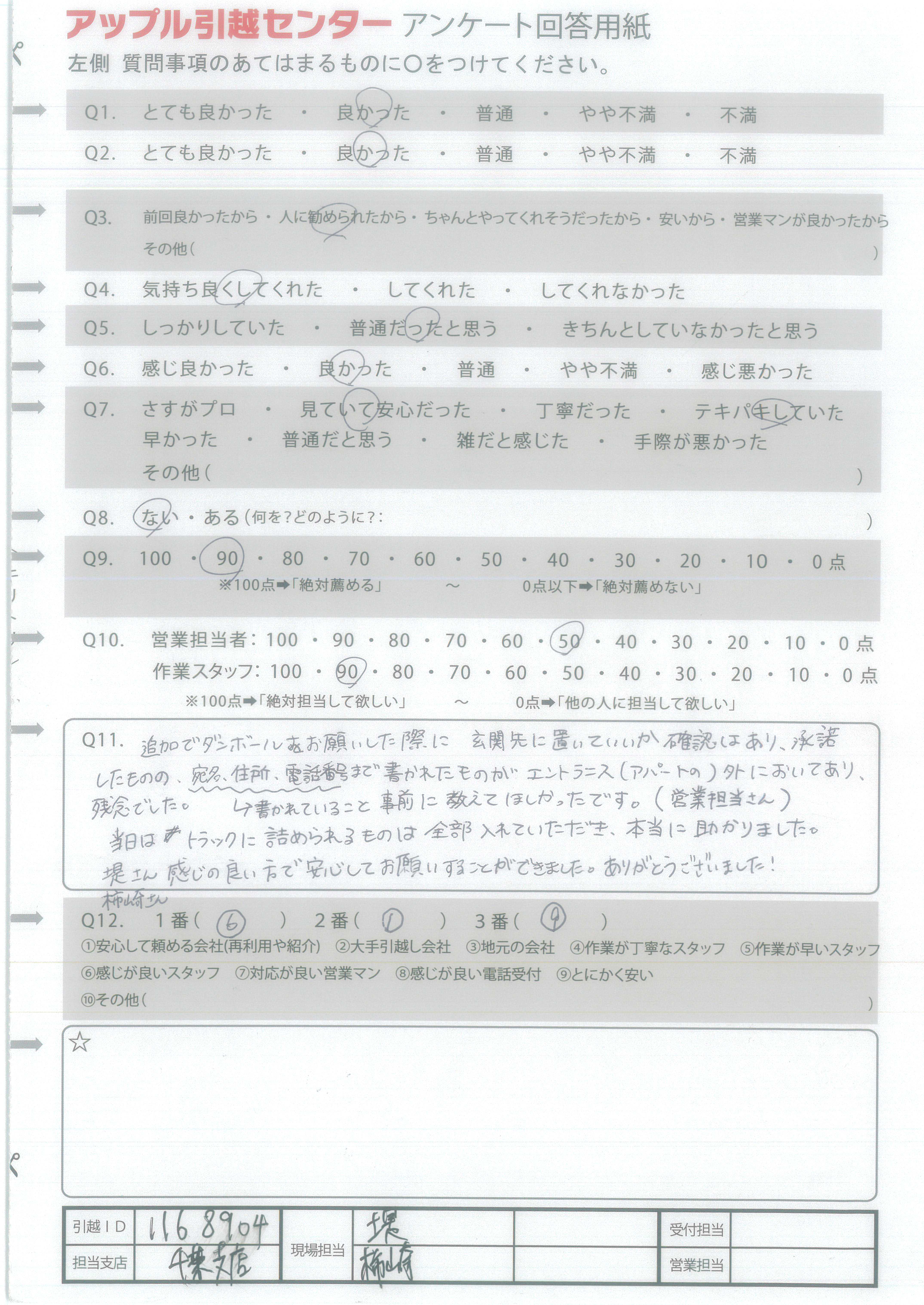 A.追加でダンボールをお願いした際に、玄関先に置いていいか確認はあり、承諾したものの、宛名、住所、電話番号まで書かれたものがエントランス(アパートの)外においてあり、残念でした。書かれていること事前に教えてほしかったです(営業担当さん) 当日はトラックに詰められるものは全部入れていただき、本当に助かりました。堤さん感じの良い方で安心してお願いすることができました。ありがとうございました!