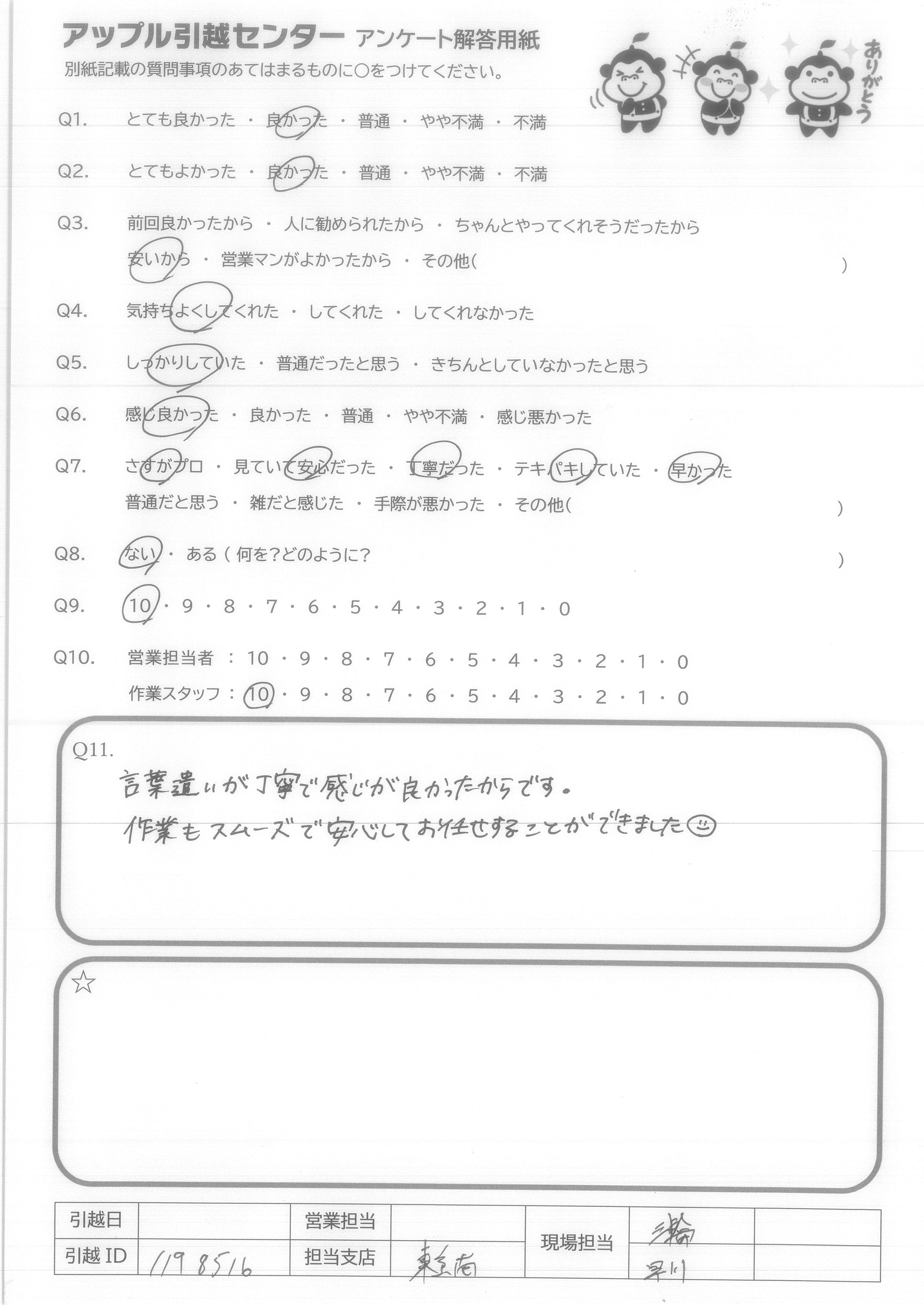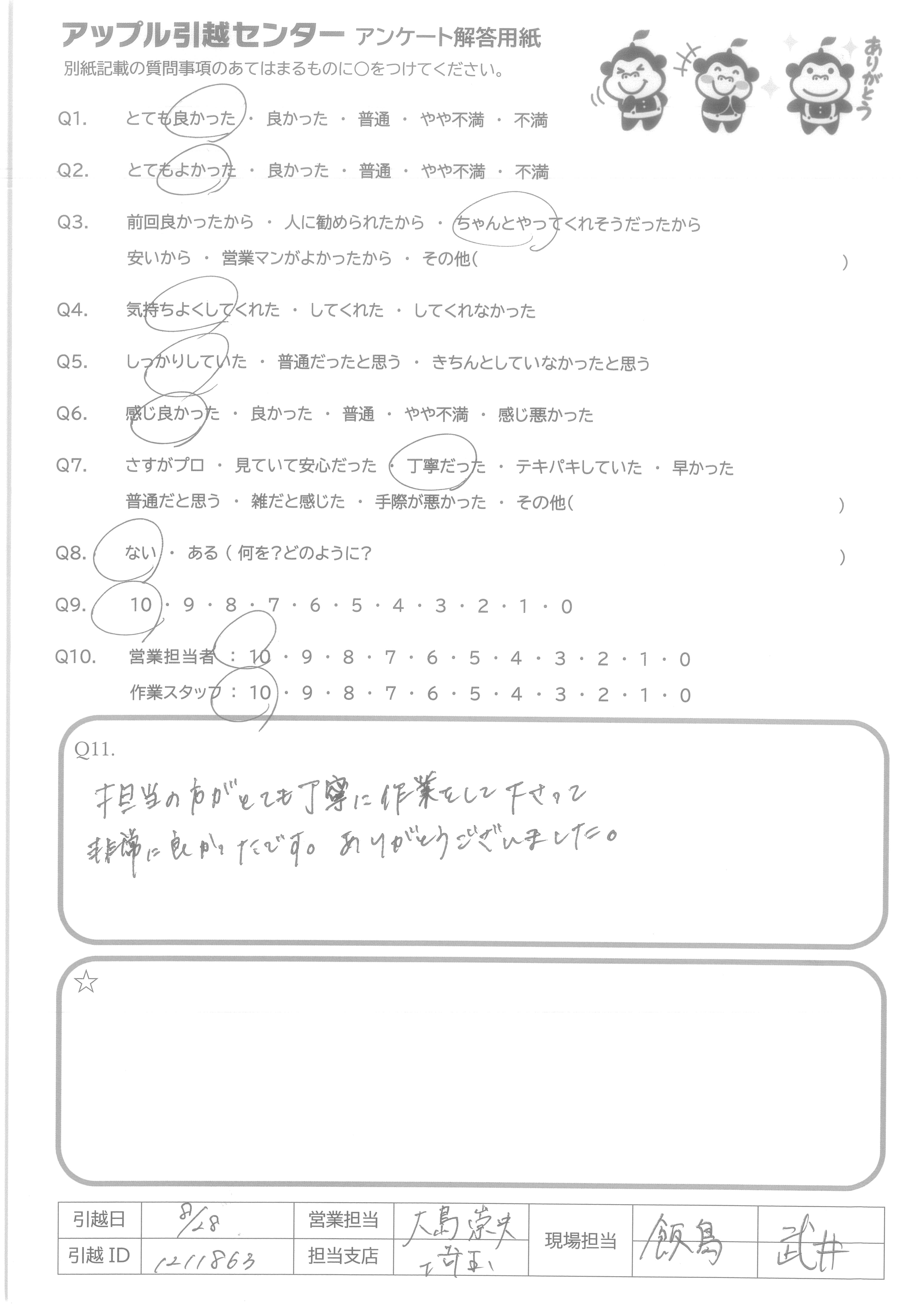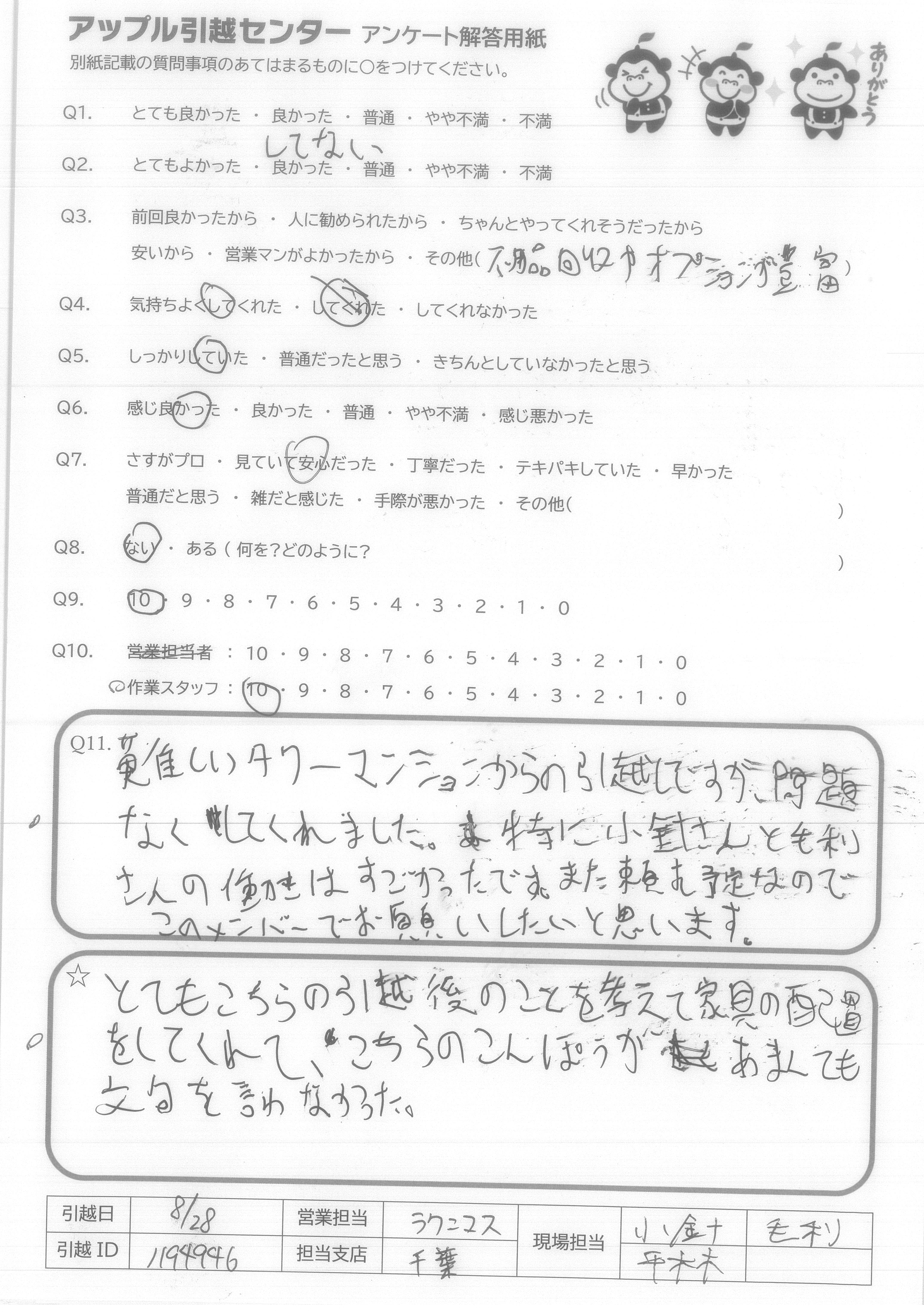 A.難しいタワーマンションからの引越しですが、問題なくしてくれました。特に小針さんと毛利さんの働きはすごかったです。また頼む予定なのでこのメンバーでお願いしたいと思います。