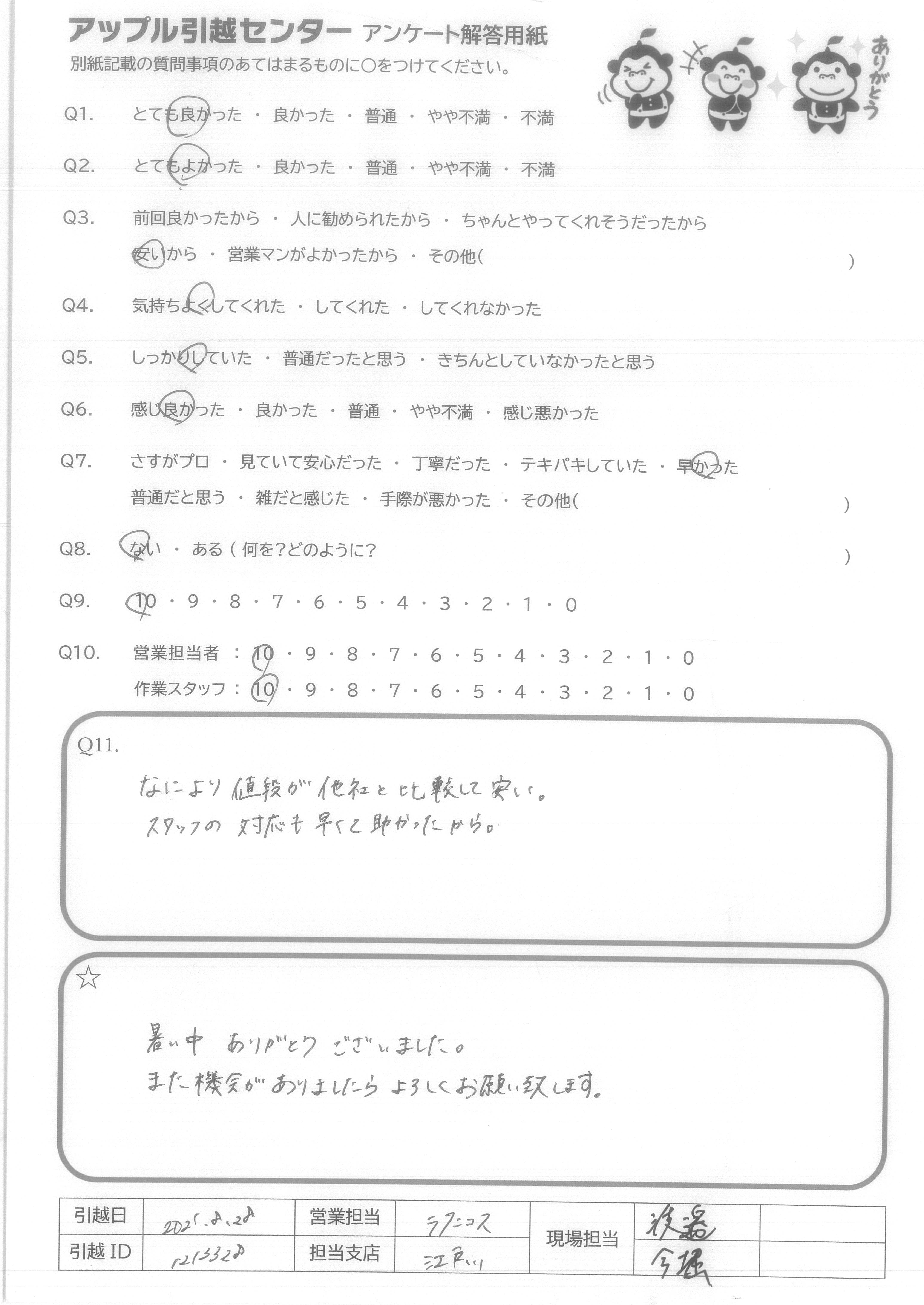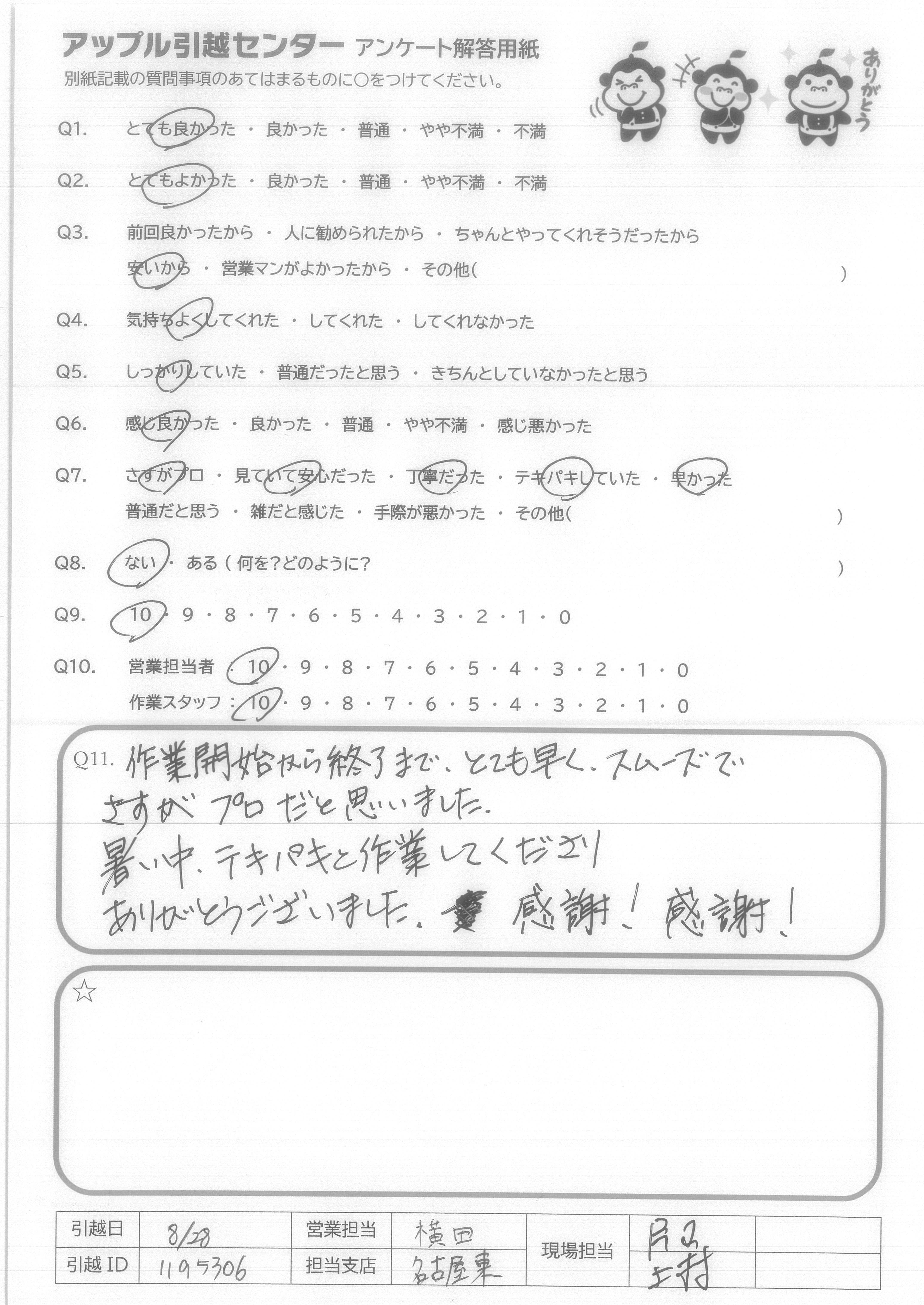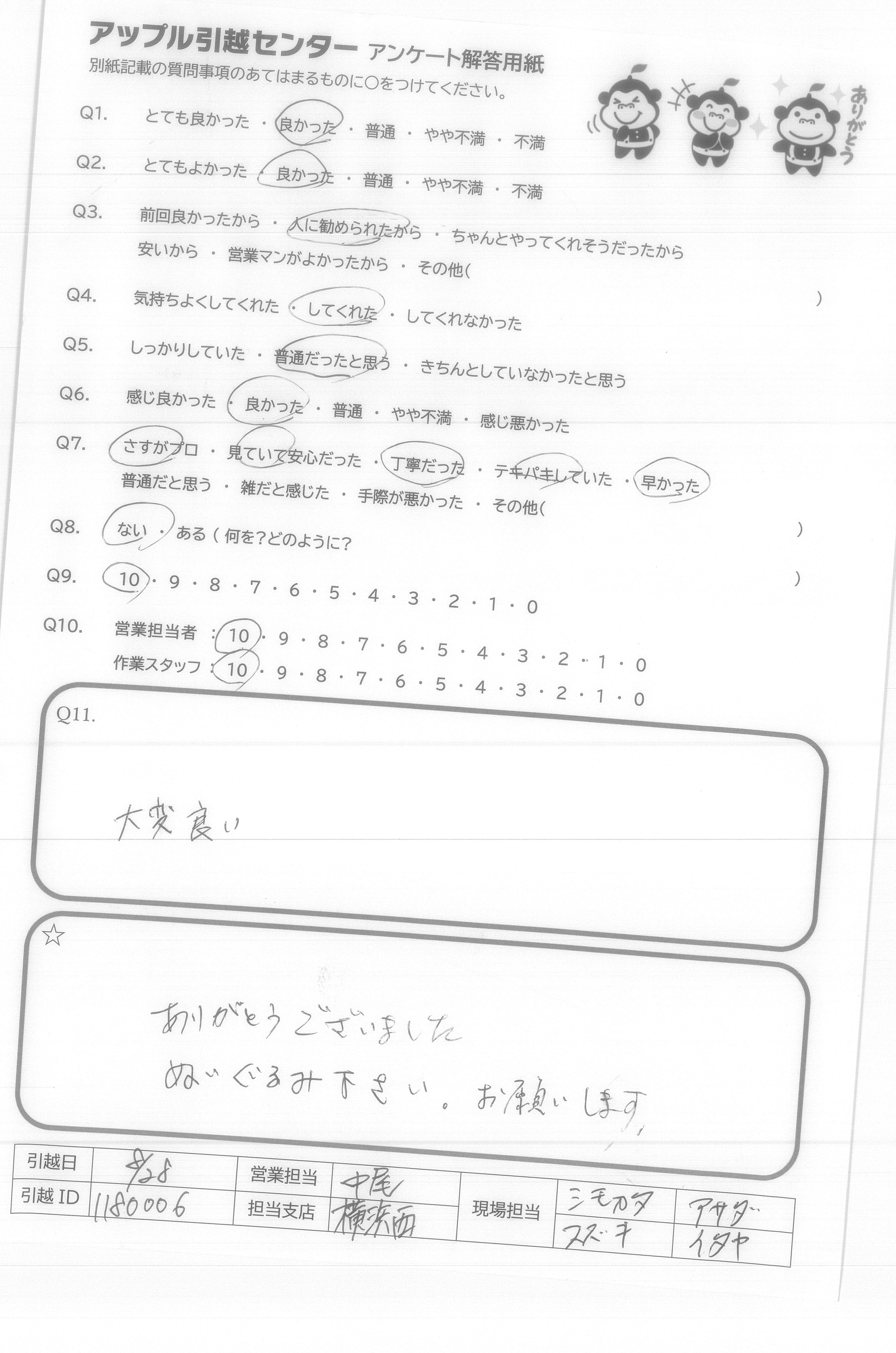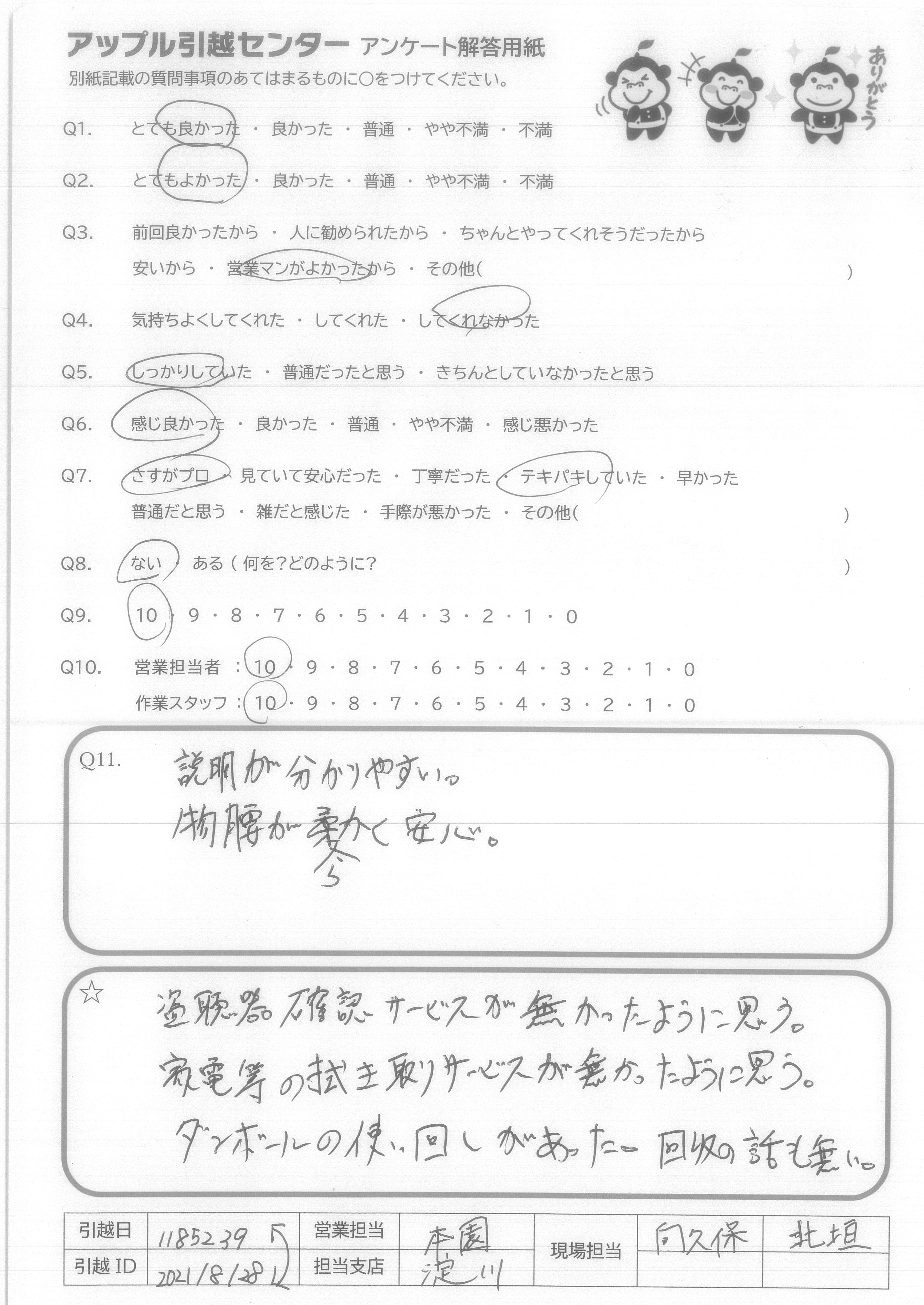 A.難しいタワーマンションからの引越しですが、問題なくしてくれました。特に小針さんと毛利さんの働きはすごかったです。また頼む予定なのでこのメンバーでお願いしたいと思います。