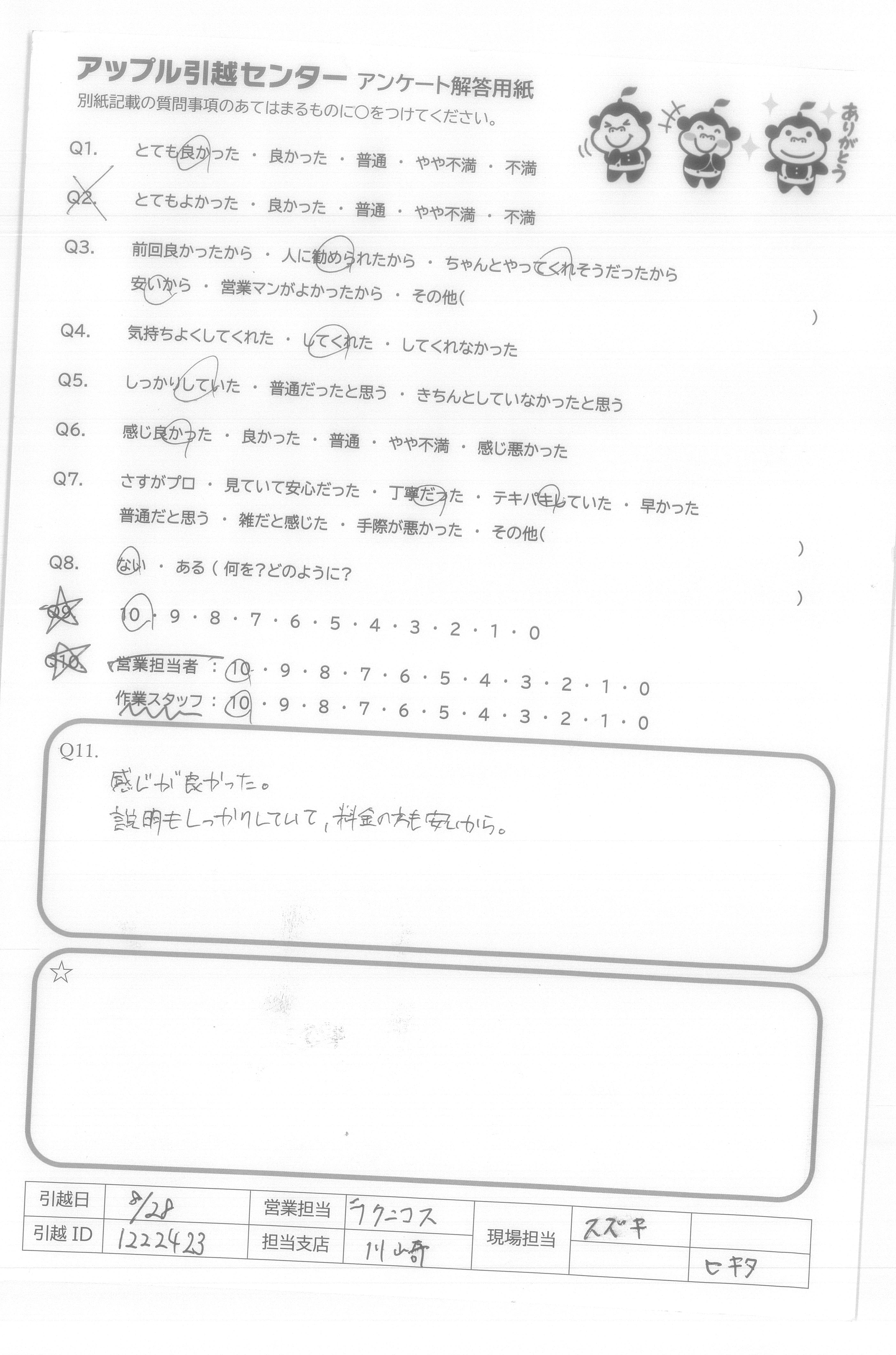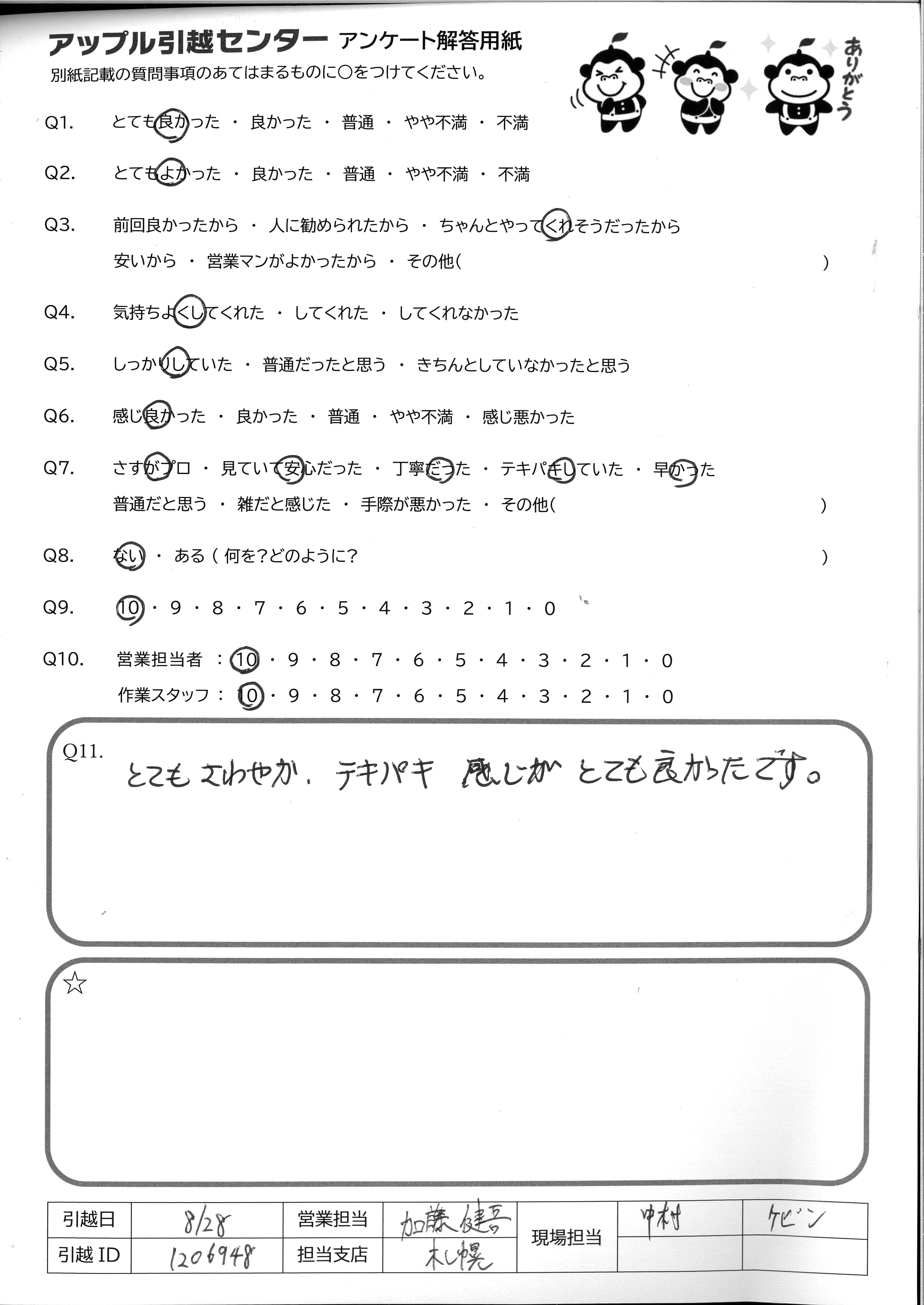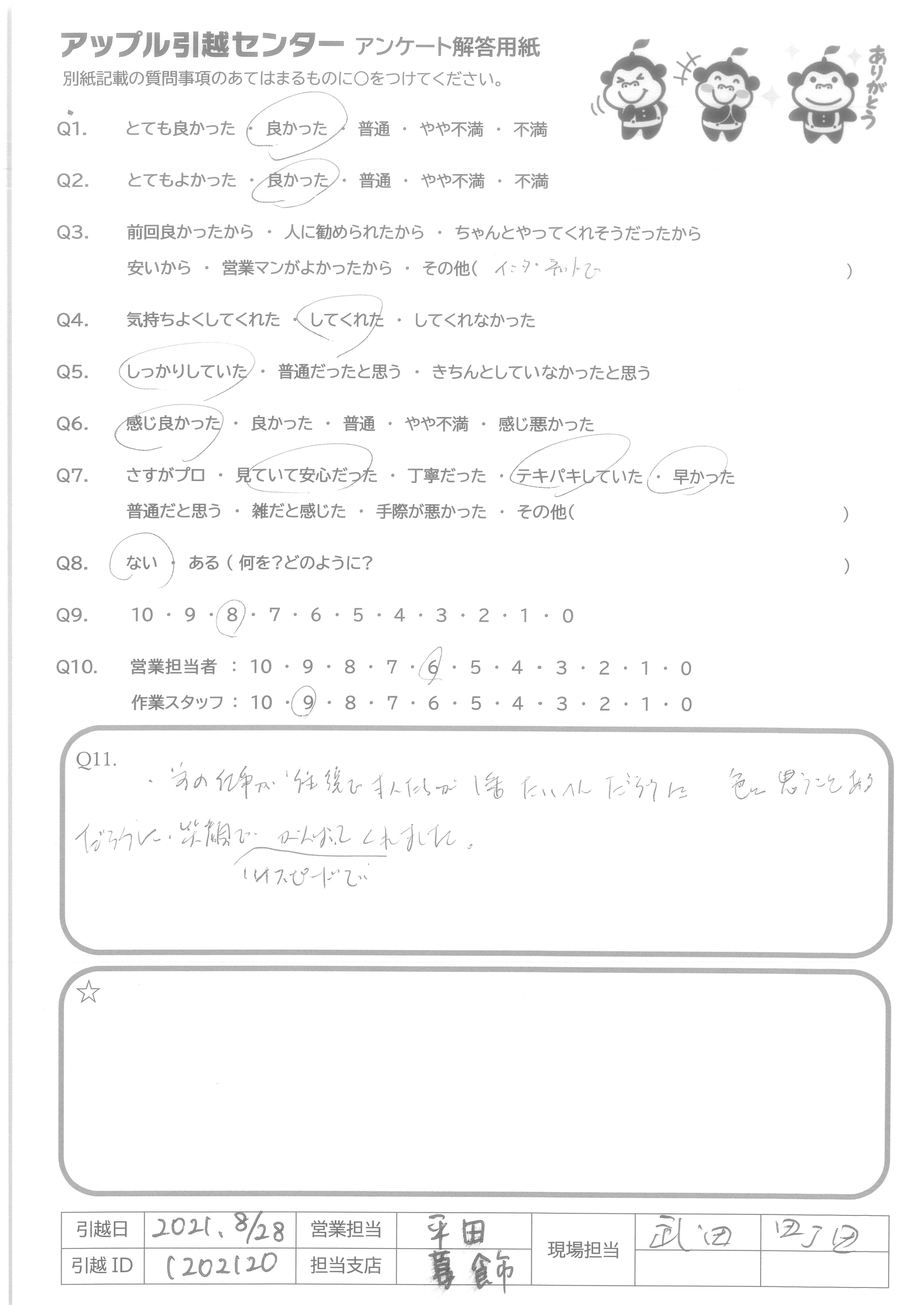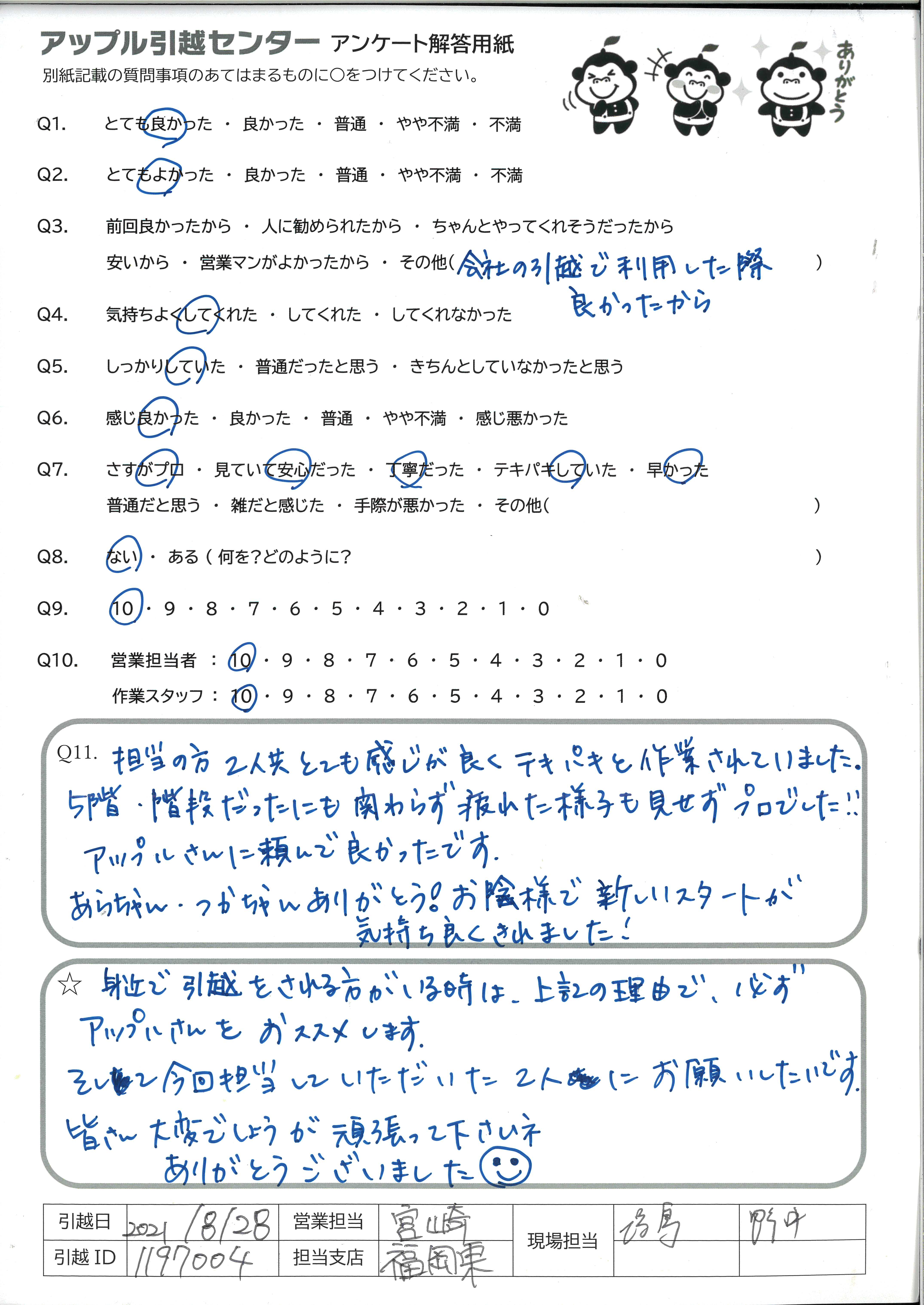 A.担当の方2人共とても感じが良くテキパキと作業されていました。 5階、階段だったにも関わらず、疲れた様子も見せずプロでした!!アップルさんに頼んで良かったです。 あらちゃん、つかちゃんありがとう!お陰様で新しいスタートが気持ち良くきれました!