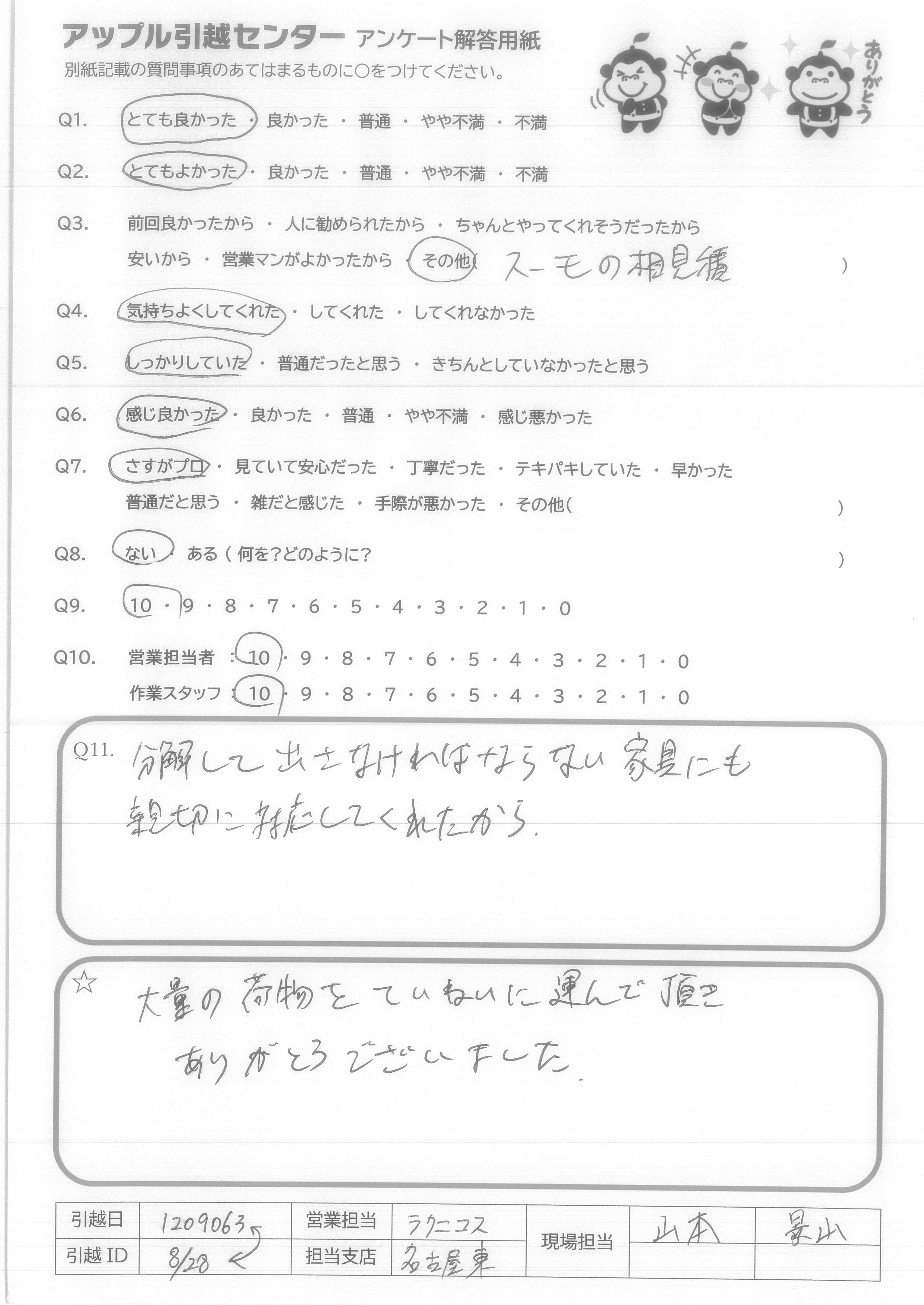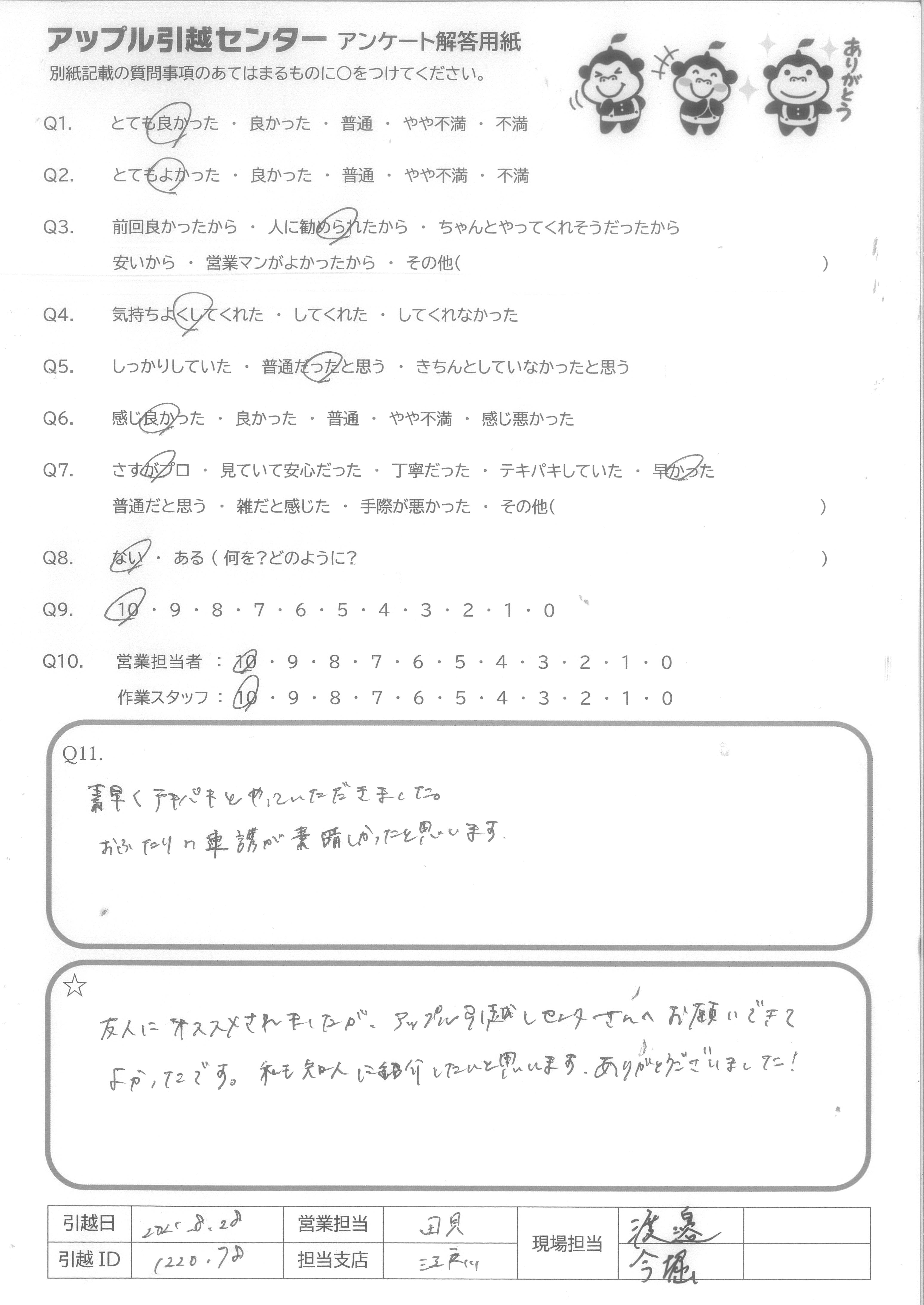A.友人にオススメされましたが、アップル引越しセンターさんへお願いできてよかったです。私も知人に紹介したいと思います。ありがとうございました!