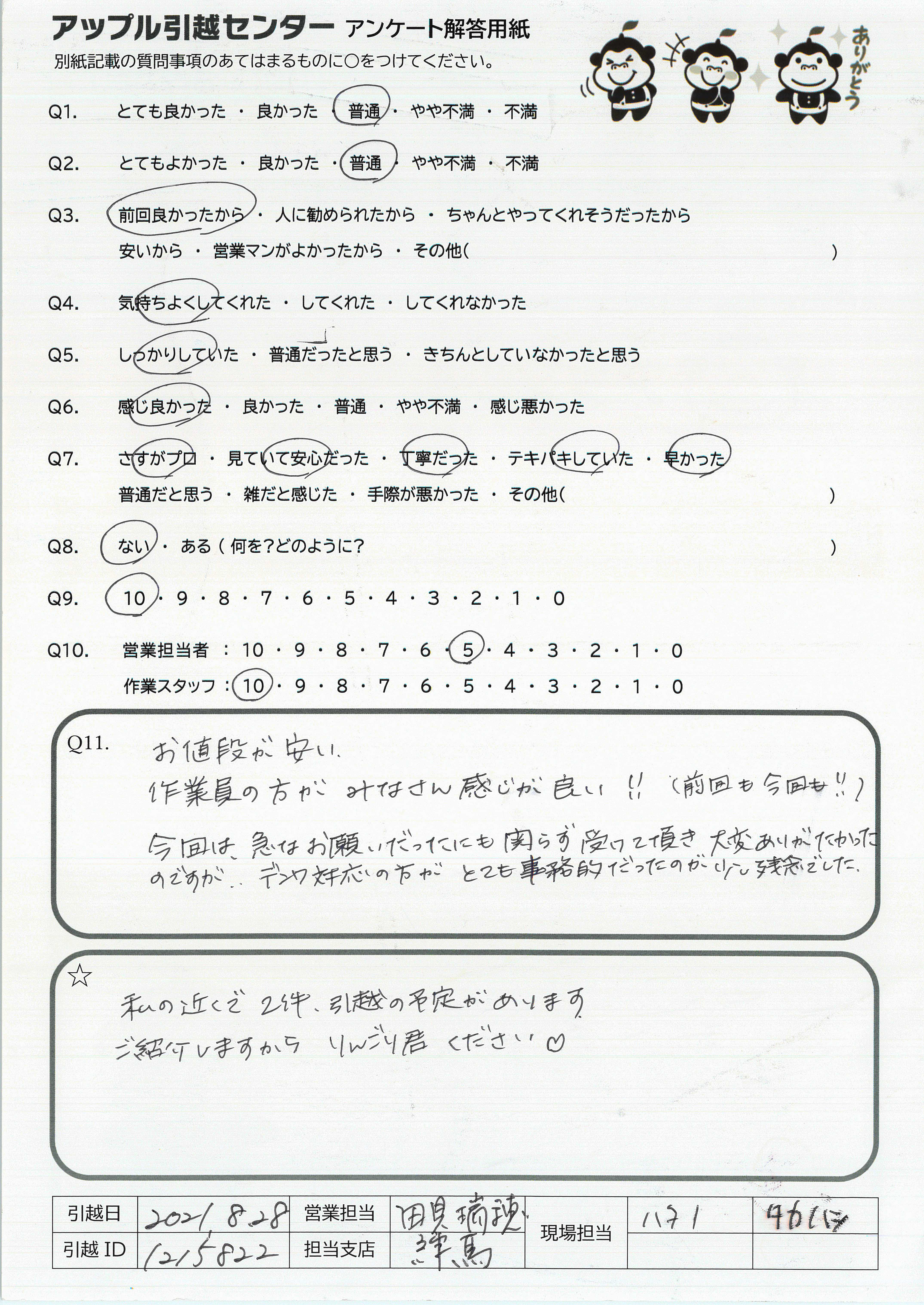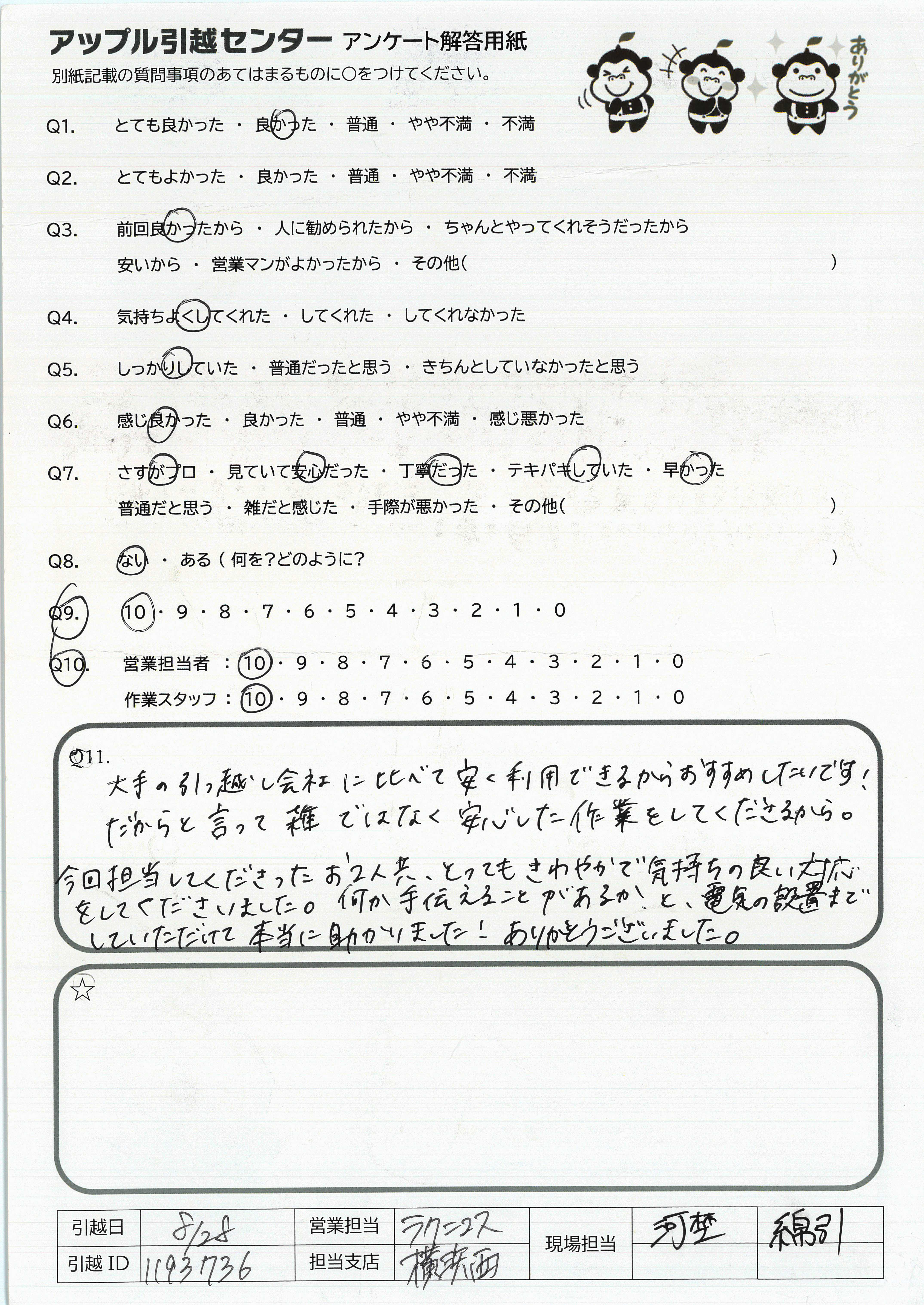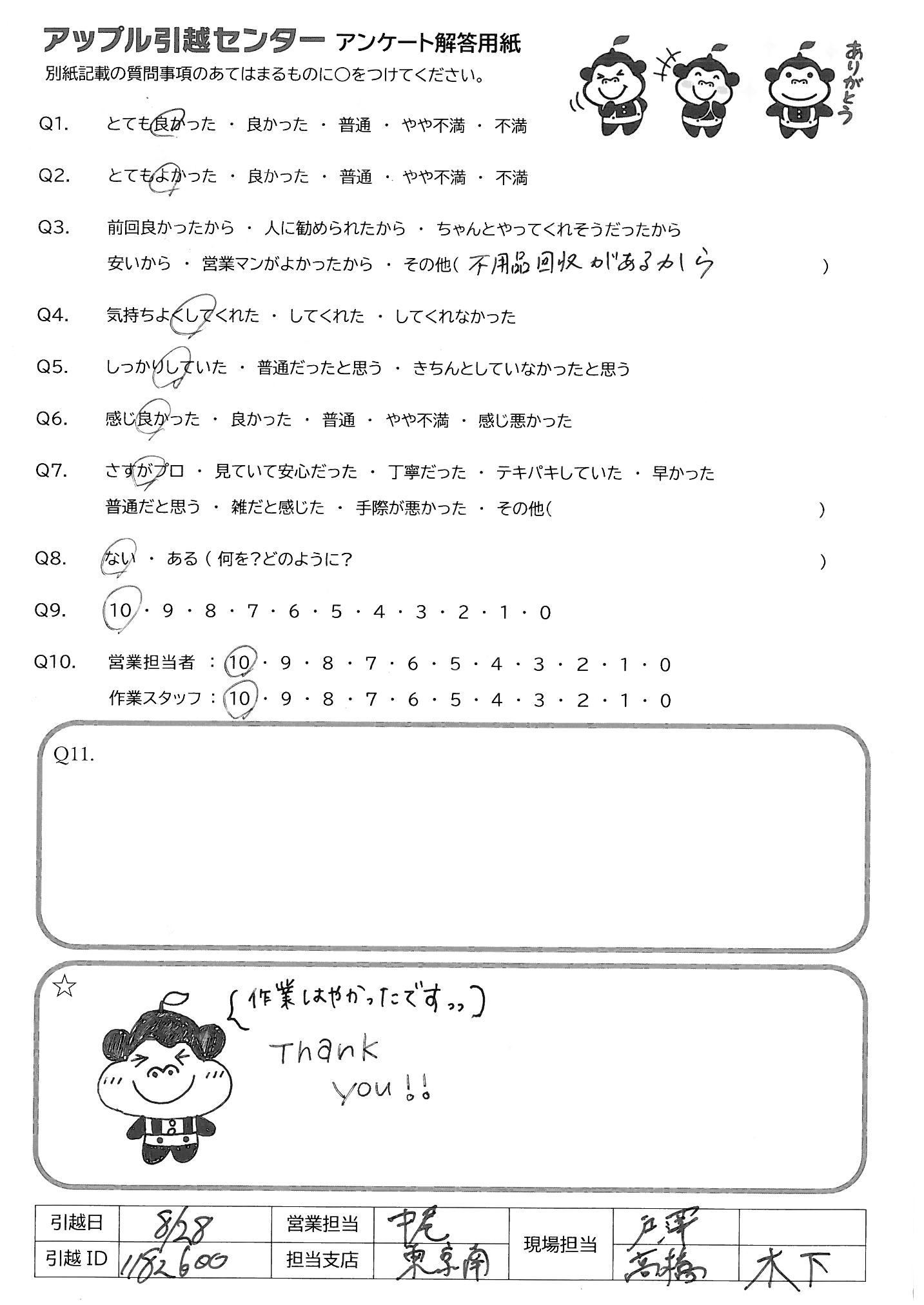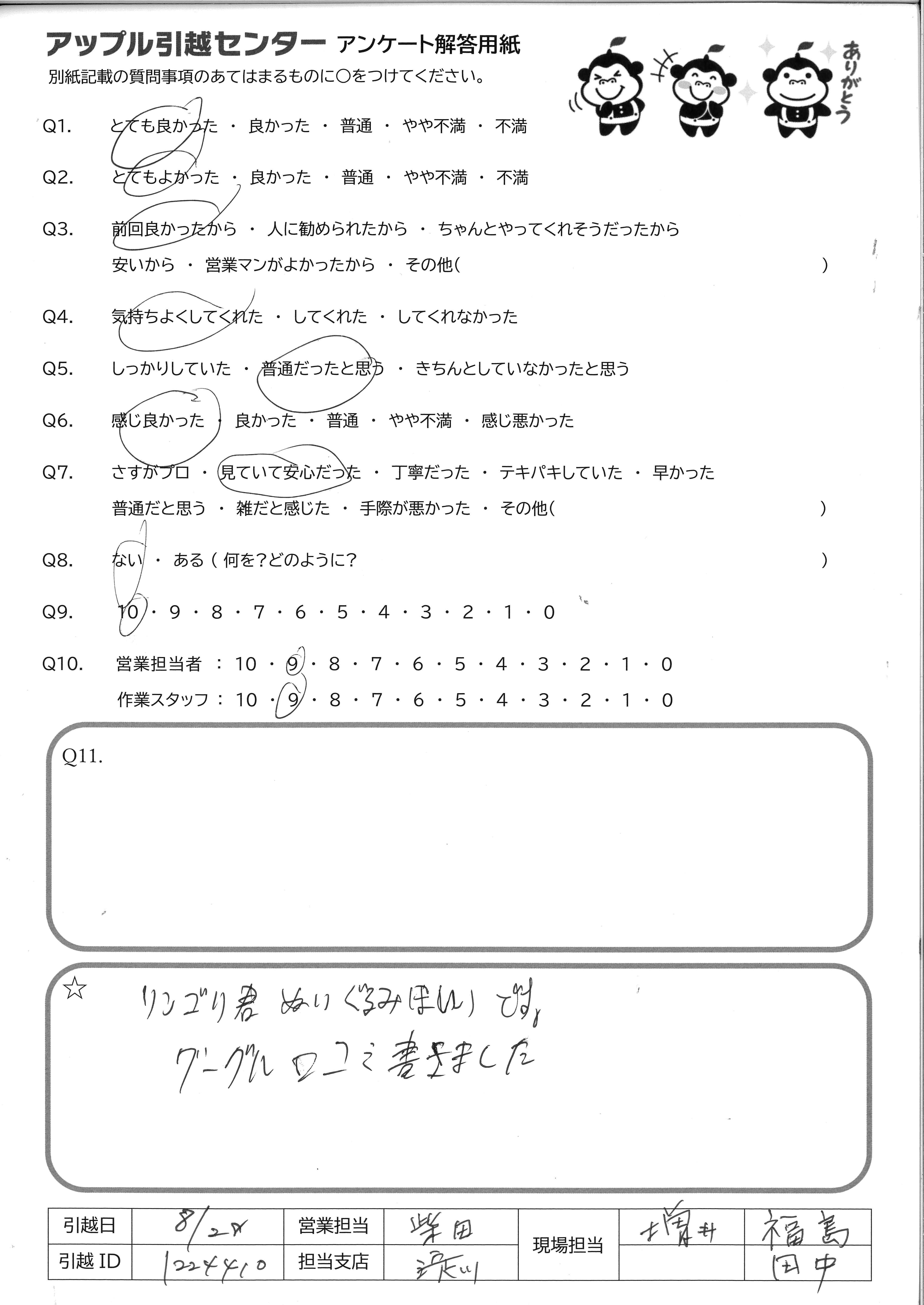 A.1 年前にアップルさんに初めてお願いしてみて、それまでお願いしていた大手(A 社、 S 社)などと比べて、対応に信頼が置けると思いました。今回担当頂いた方々もやはり同じであり、アップルさんは全社的にとても良い会社なのだと感じました。 こちらの至らなかった点としては、残暑の厳しい時期の引っ越しだったにもかかわらず、担当頂いた方の汗を拭くためのタオルを用意していなかったことです。暑い中、ありがとうございました。