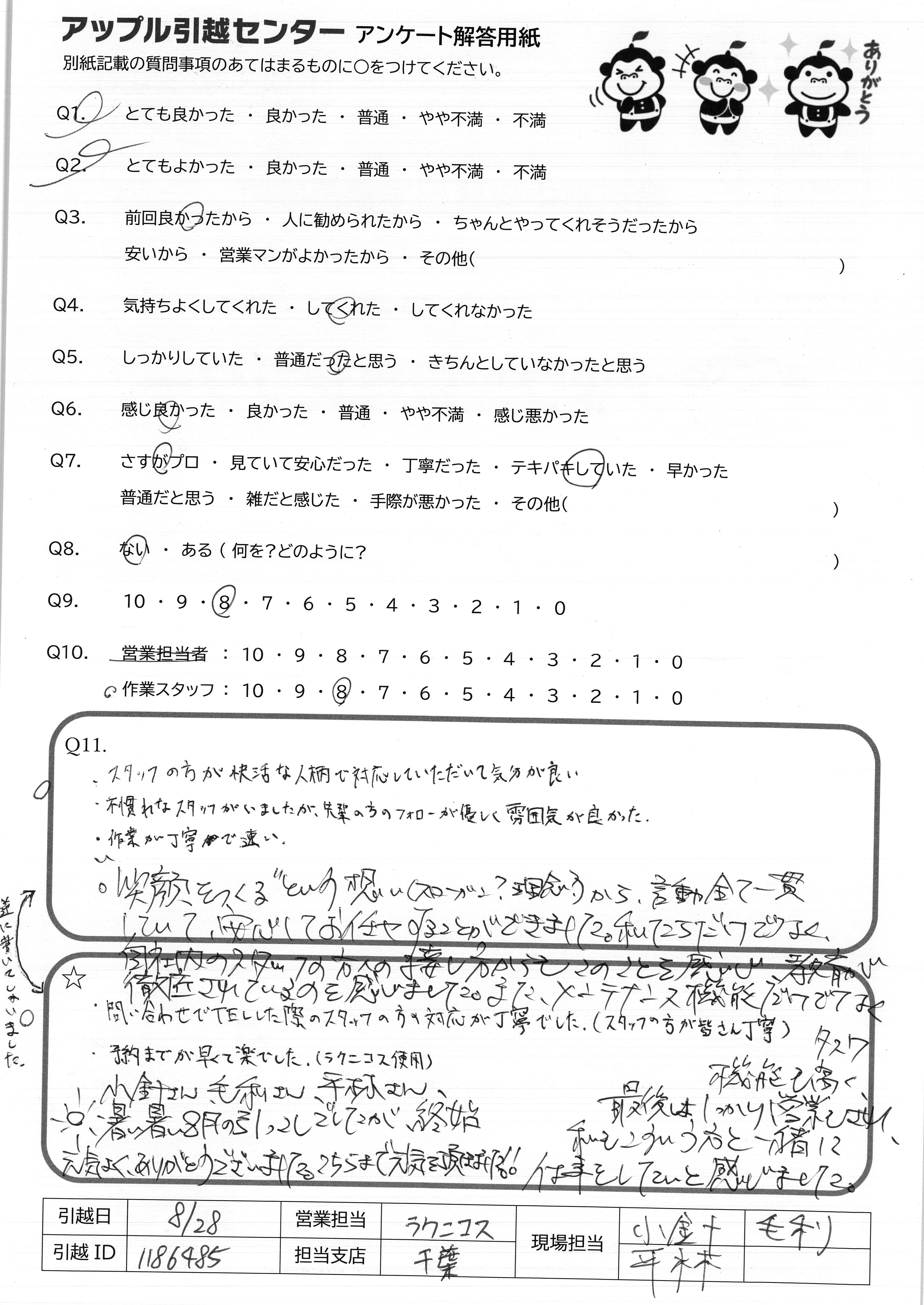 A.・問い合わせでTELした際のスタッフの方の対応が丁寧でした。(スタッフの方が皆さん丁寧) ・予約までが早く楽でした。(ラクニコス使用) 小針さん、毛利さん、平林さん、 暑い暑い8月の引っこしでしたが終始元気よく、ありがとうございました。こちらまで元気を頂きました!!