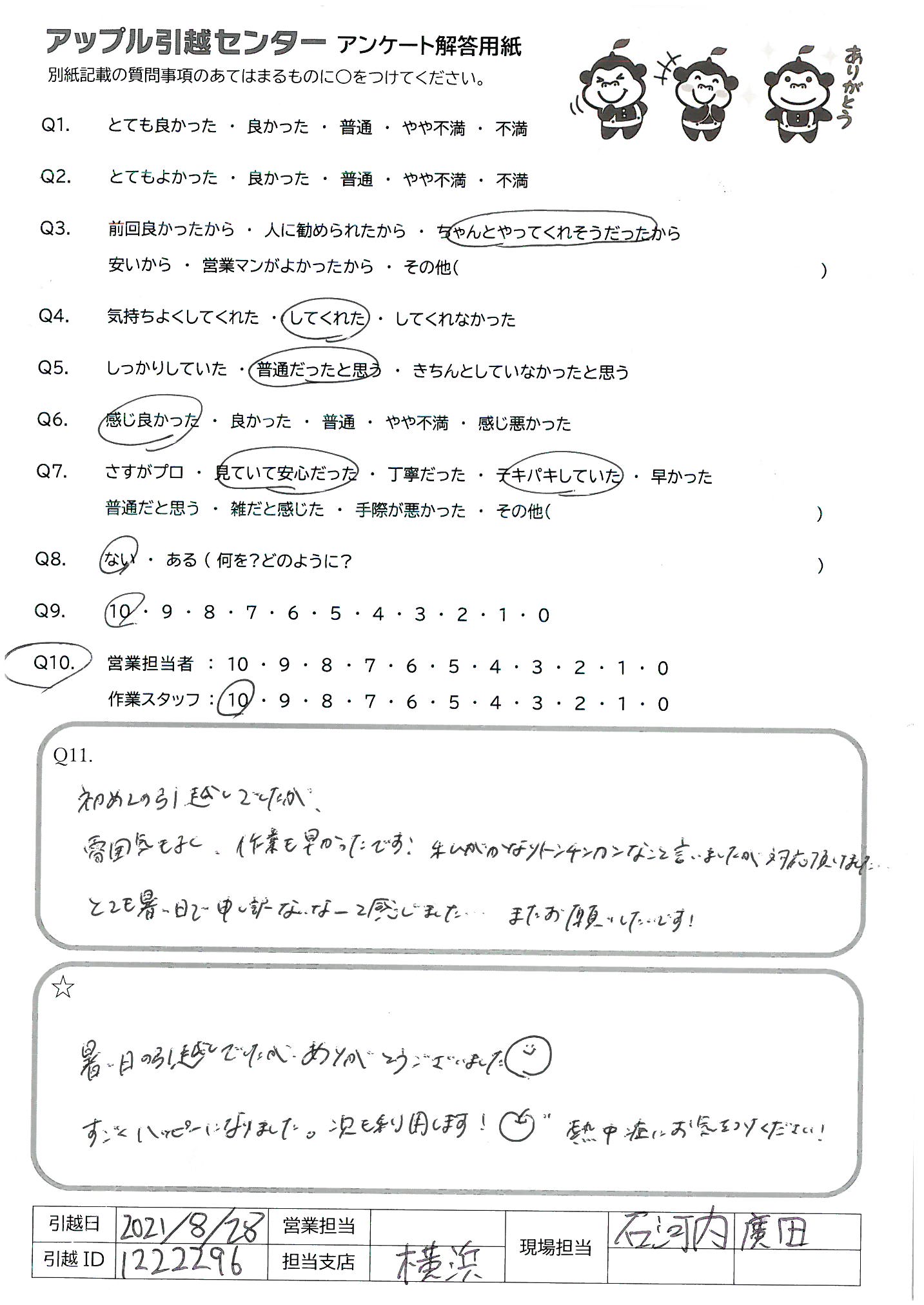 引越し日:2021年08月28日 エリア:神奈川県横浜市港北区