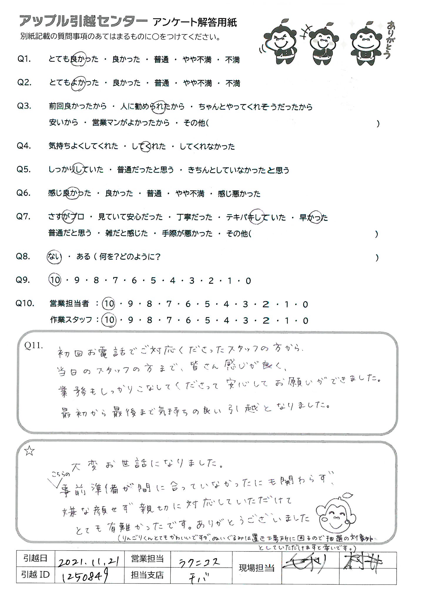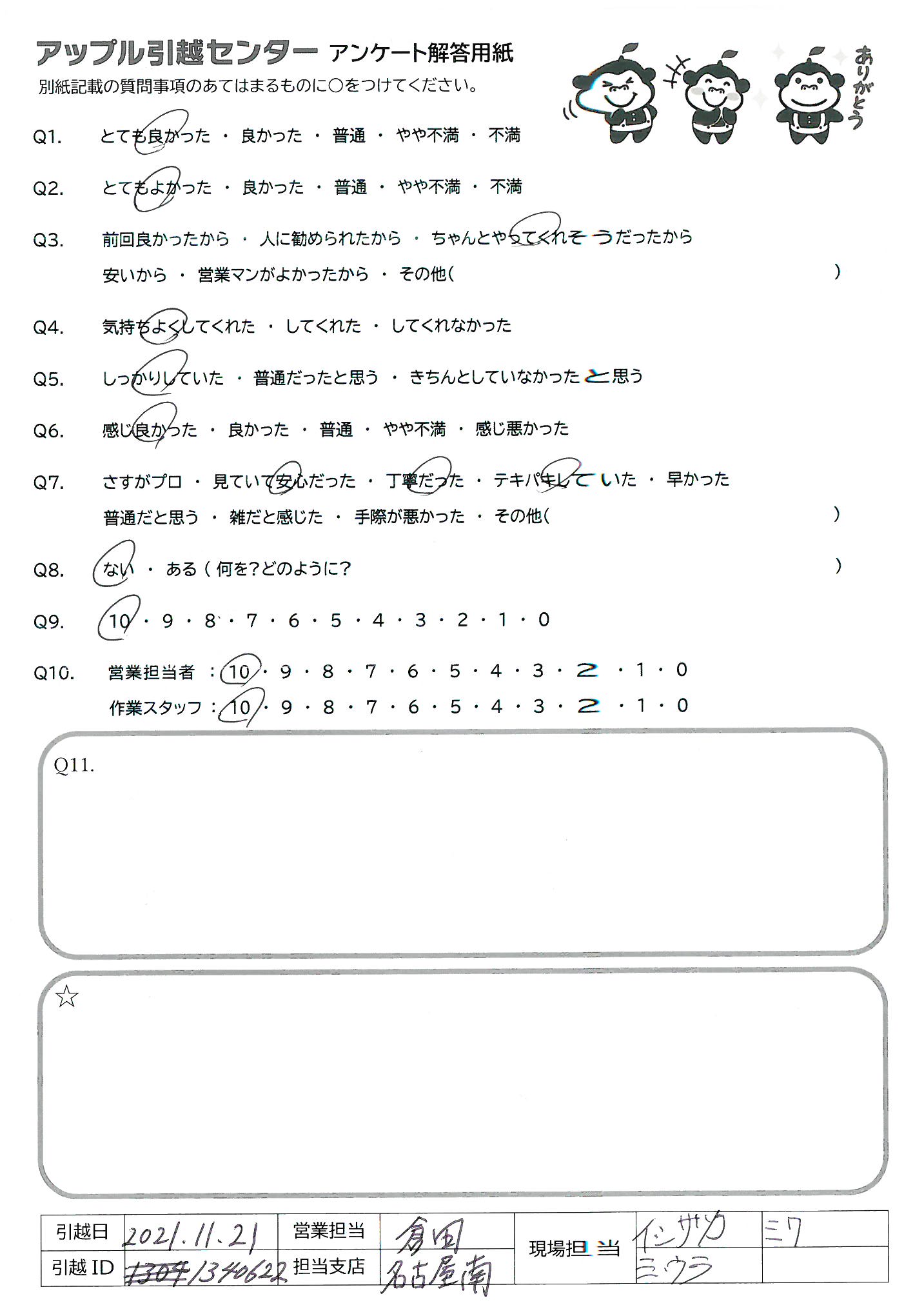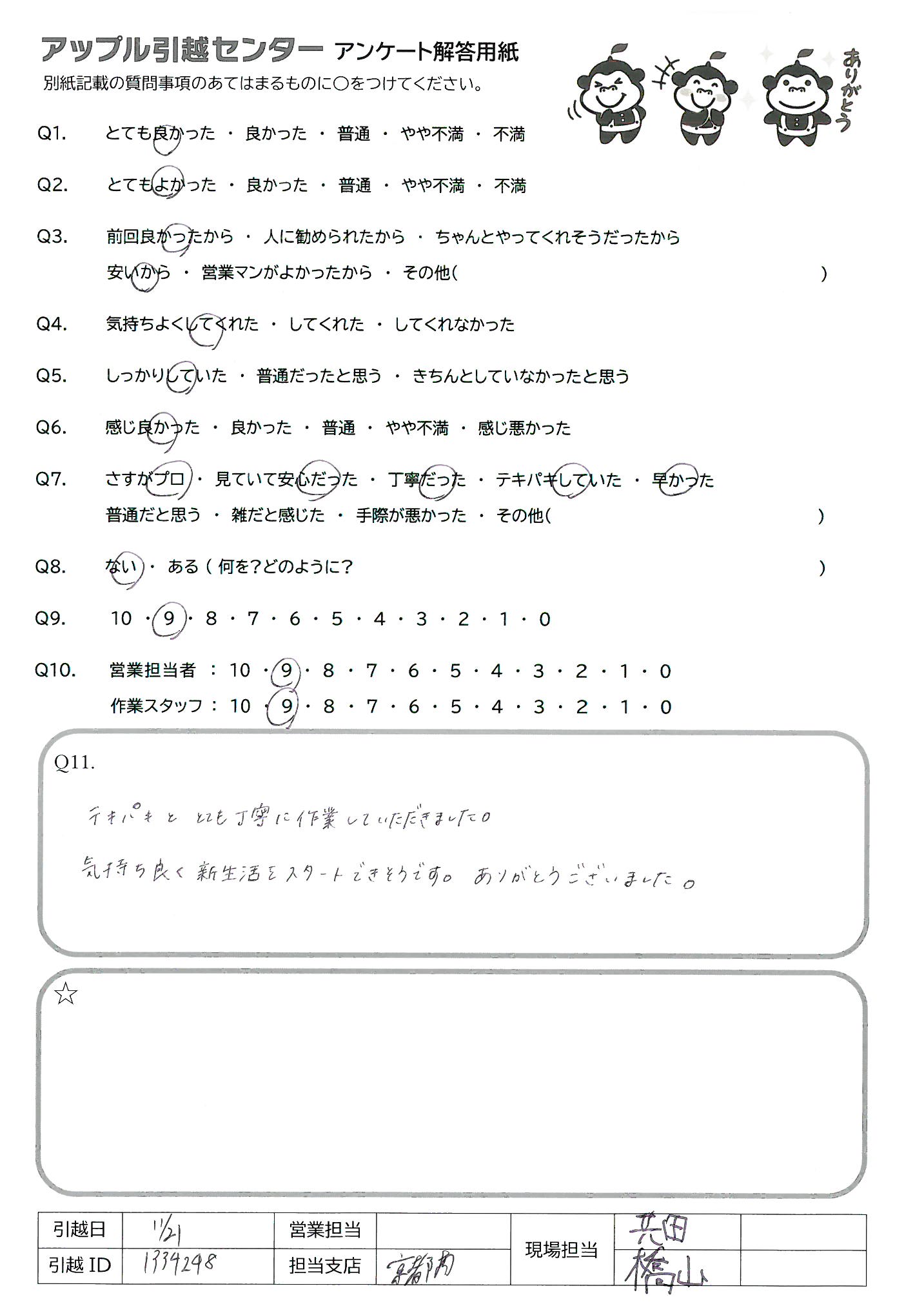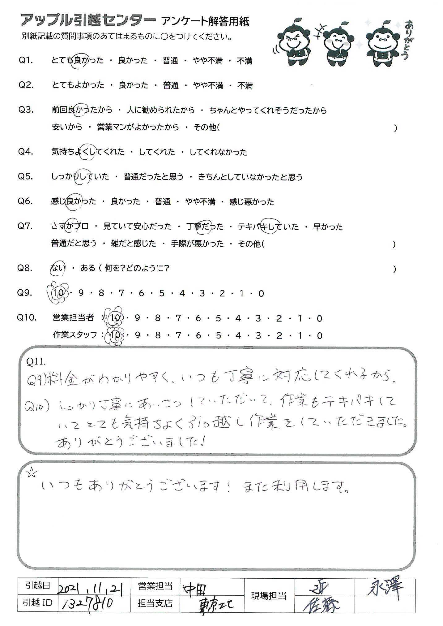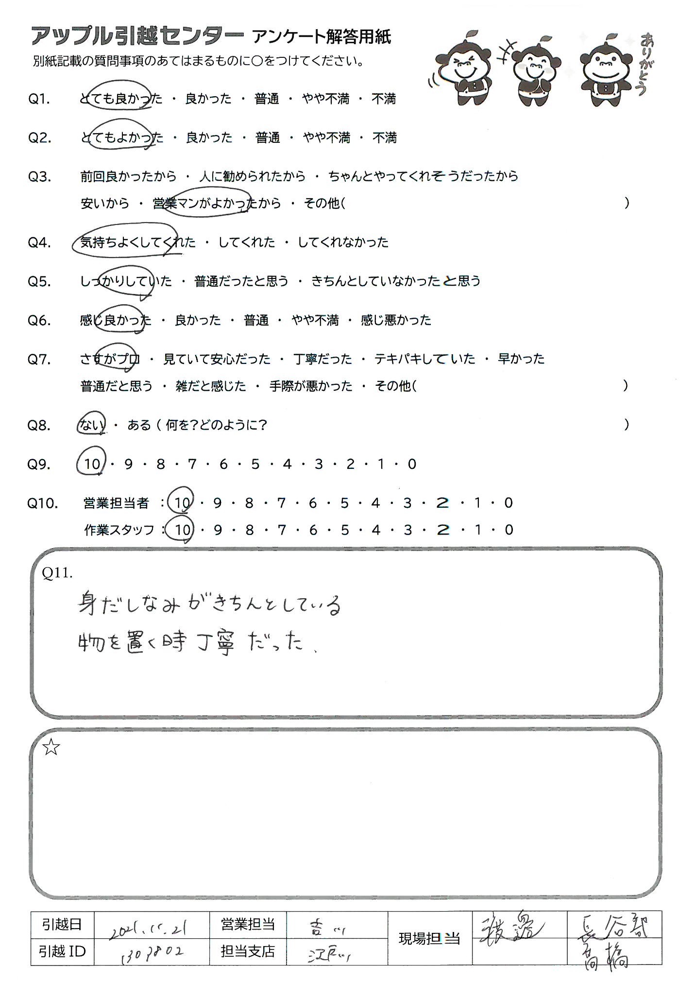 A.Q9)料金がわかりやすく、いつも丁寧に対応してくれるから。 Q10)しっかり丁寧にあいさつしていただいて、作業もテキパキしていてとても気持ちよく引っ越し作業をしていただきました。ありがとうございました!