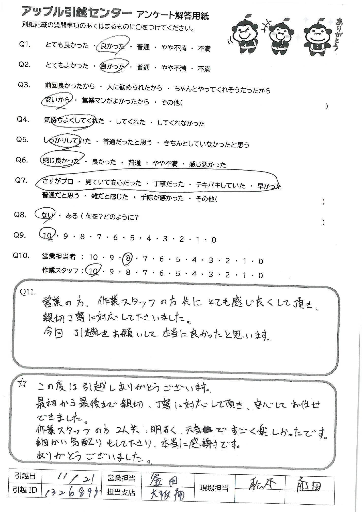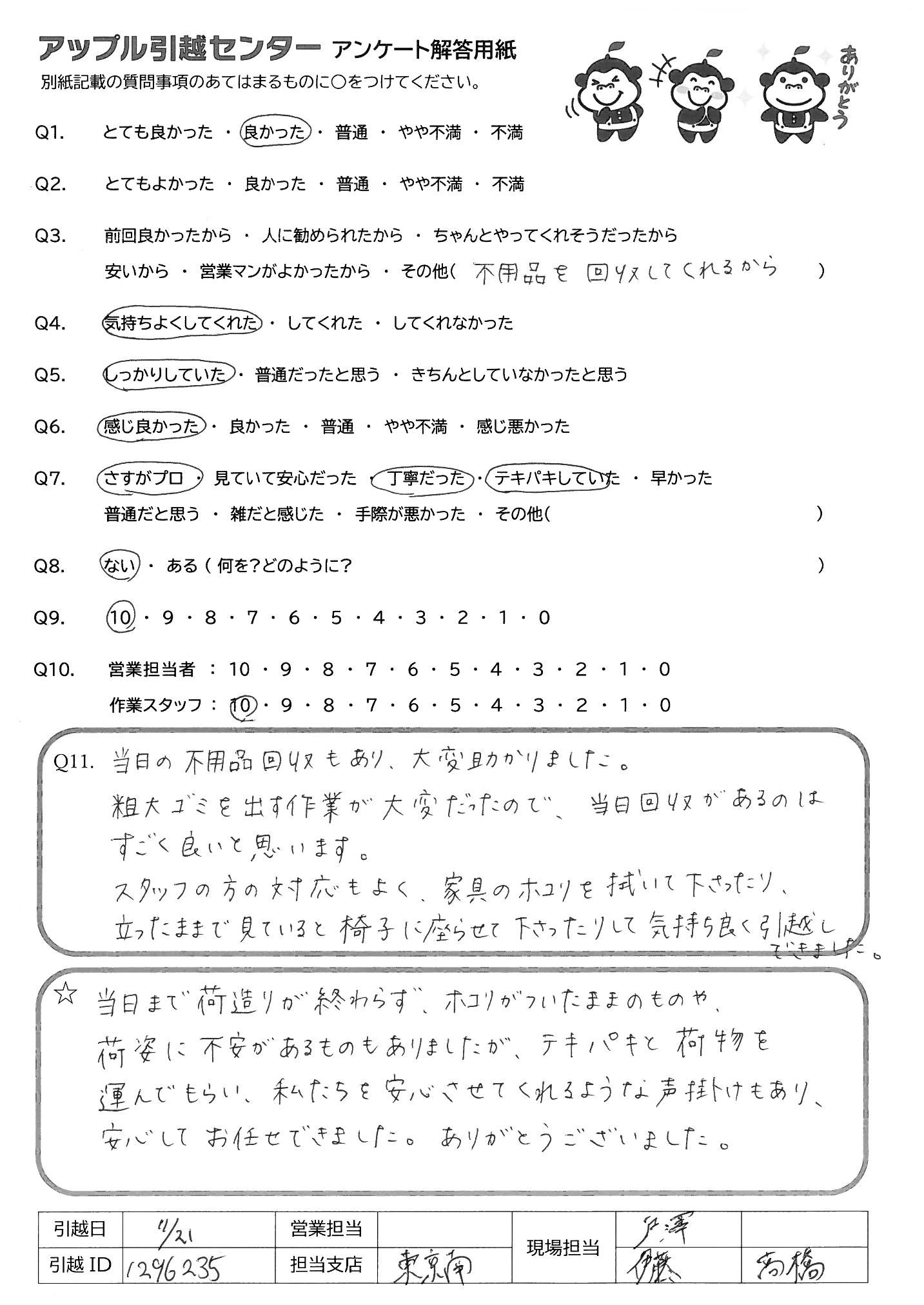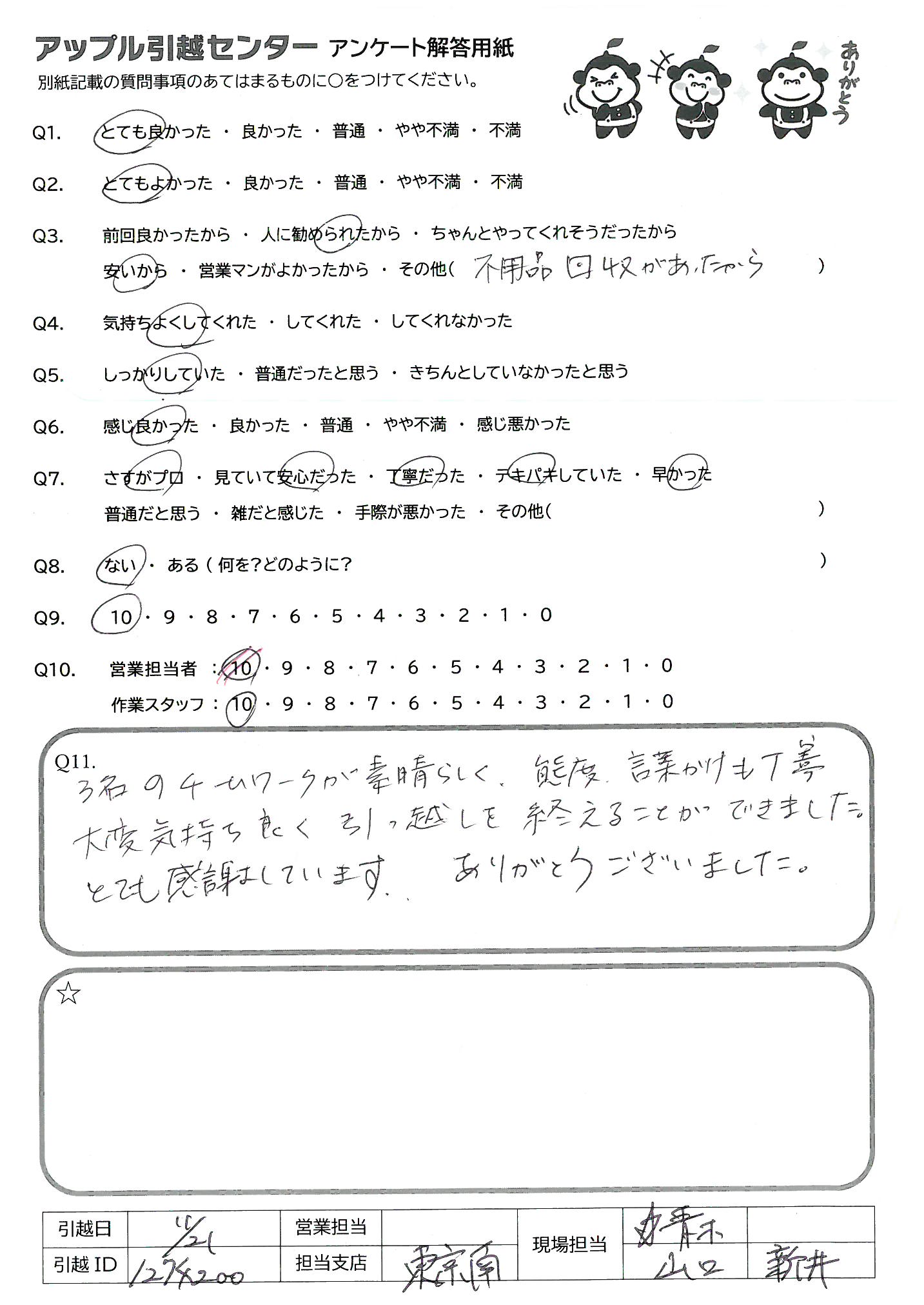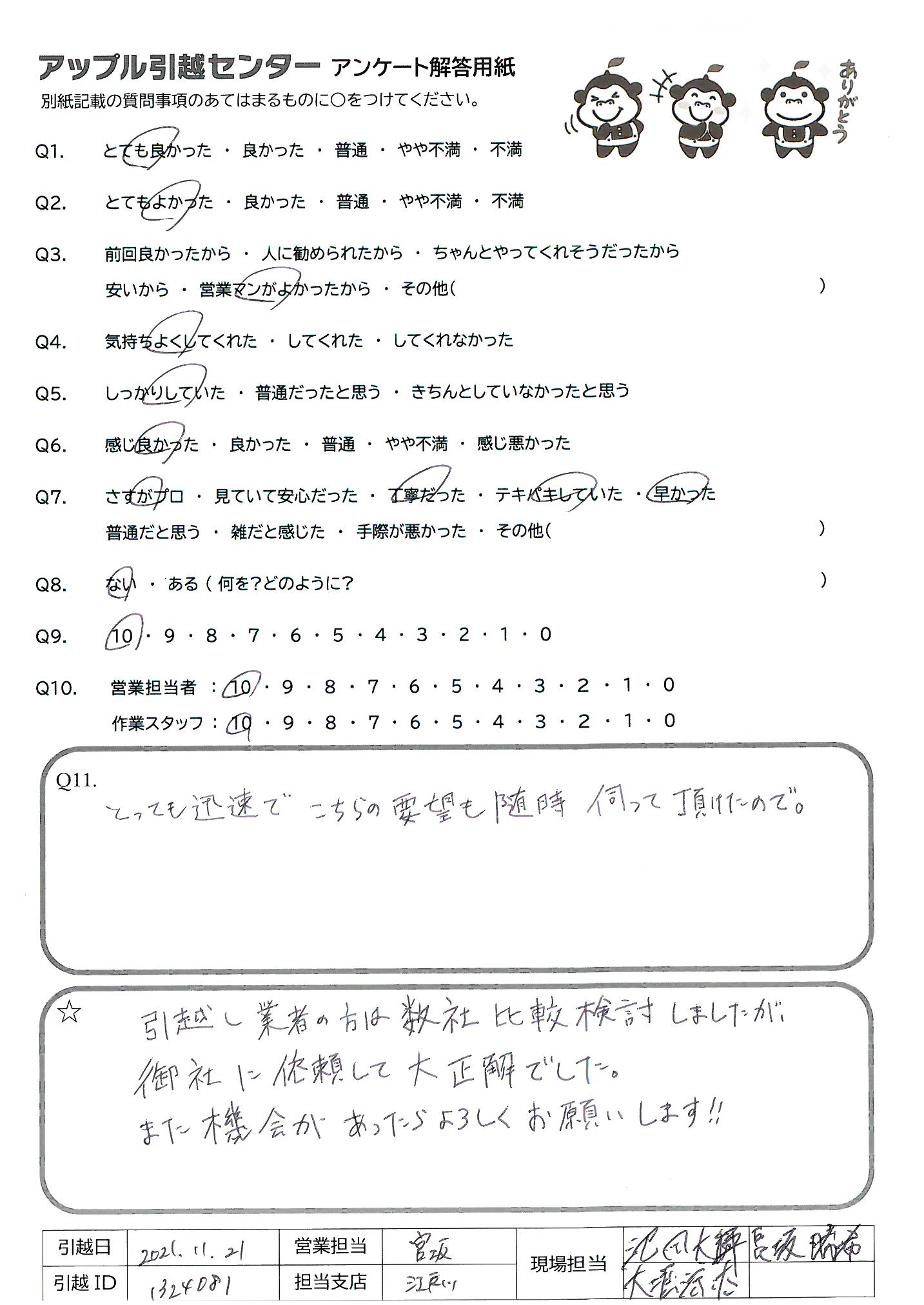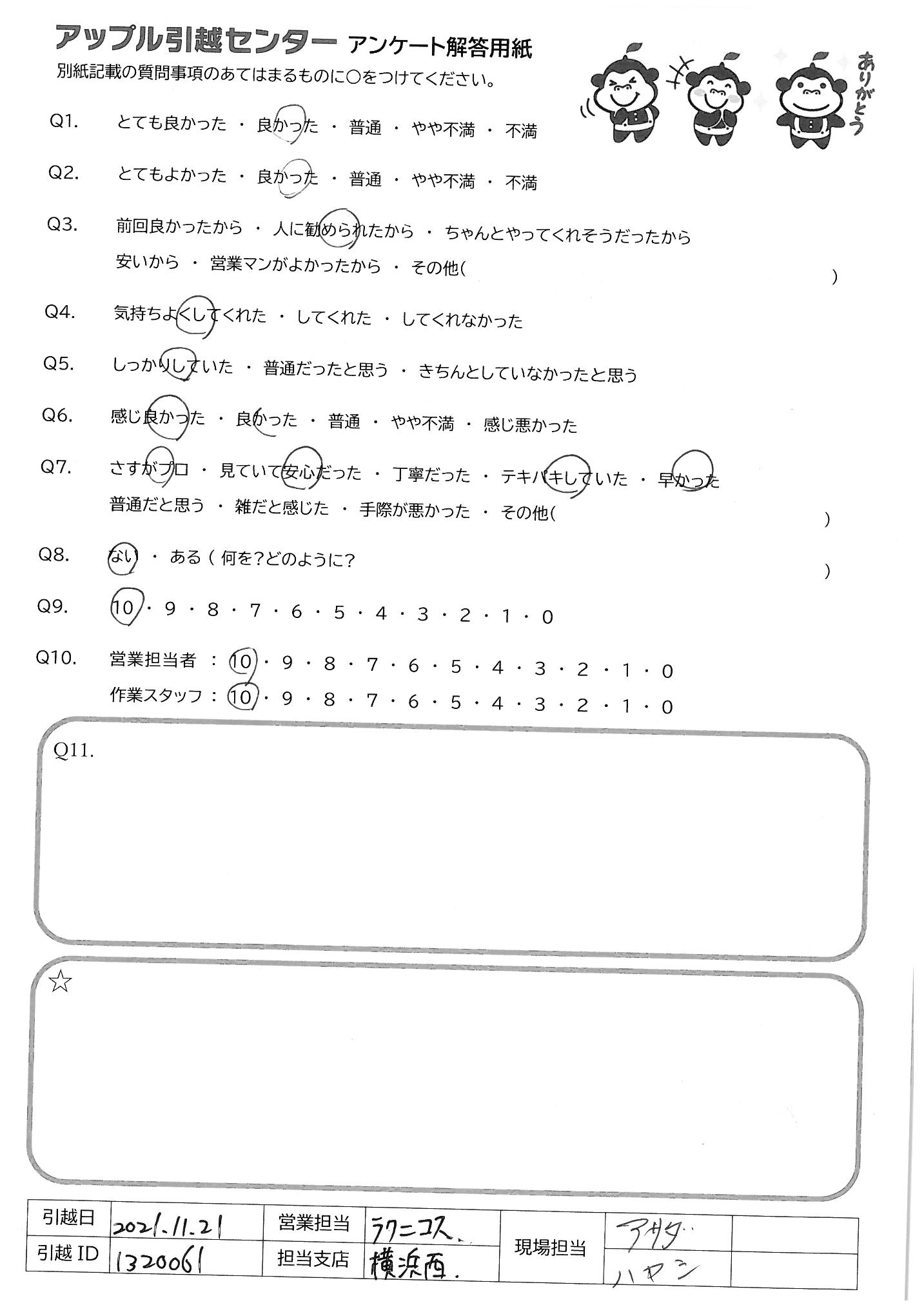 A.Q9)料金がわかりやすく、いつも丁寧に対応してくれるから。 Q10)しっかり丁寧にあいさつしていただいて、作業もテキパキしていてとても気持ちよく引っ越し作業をしていただきました。ありがとうございました!