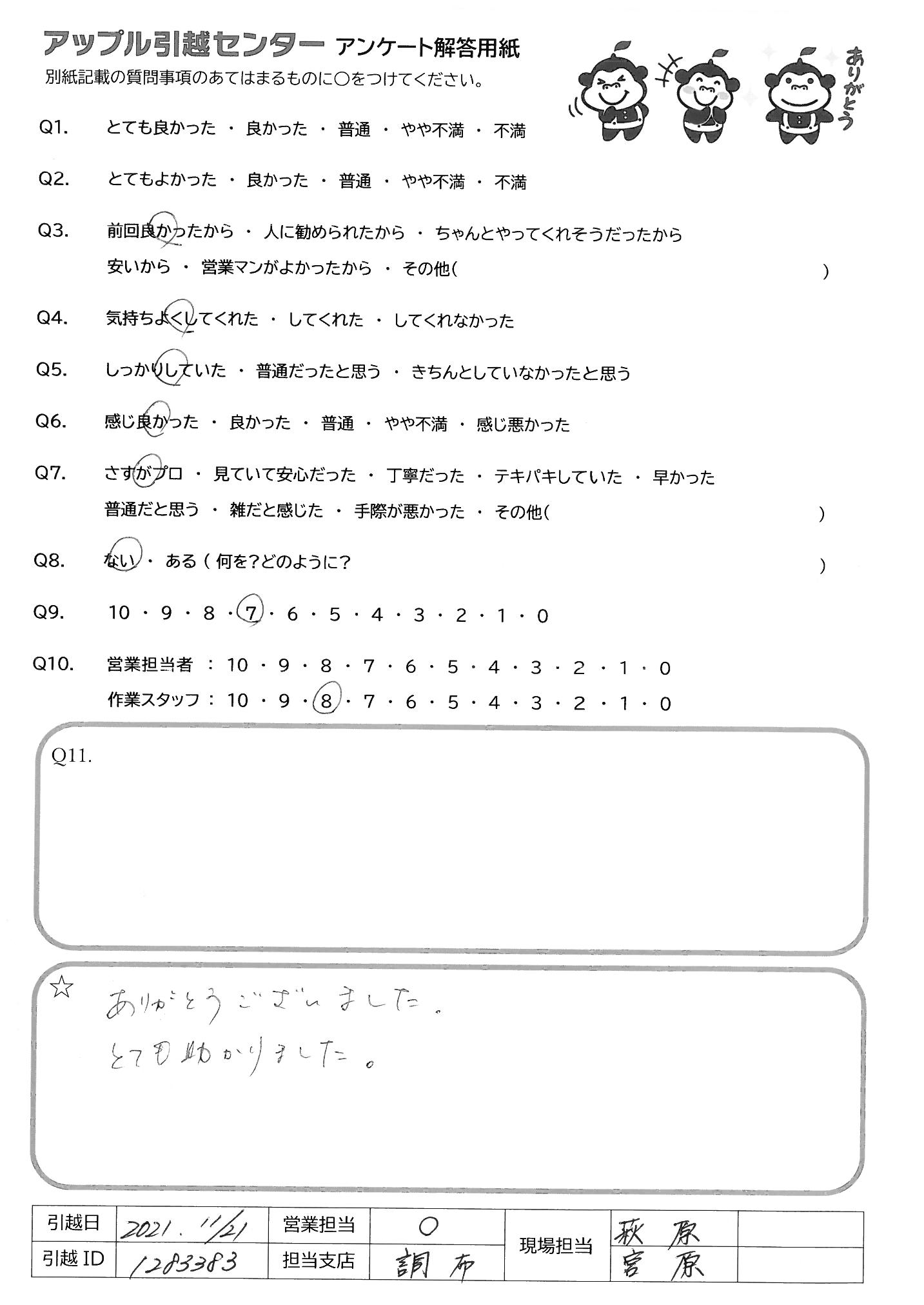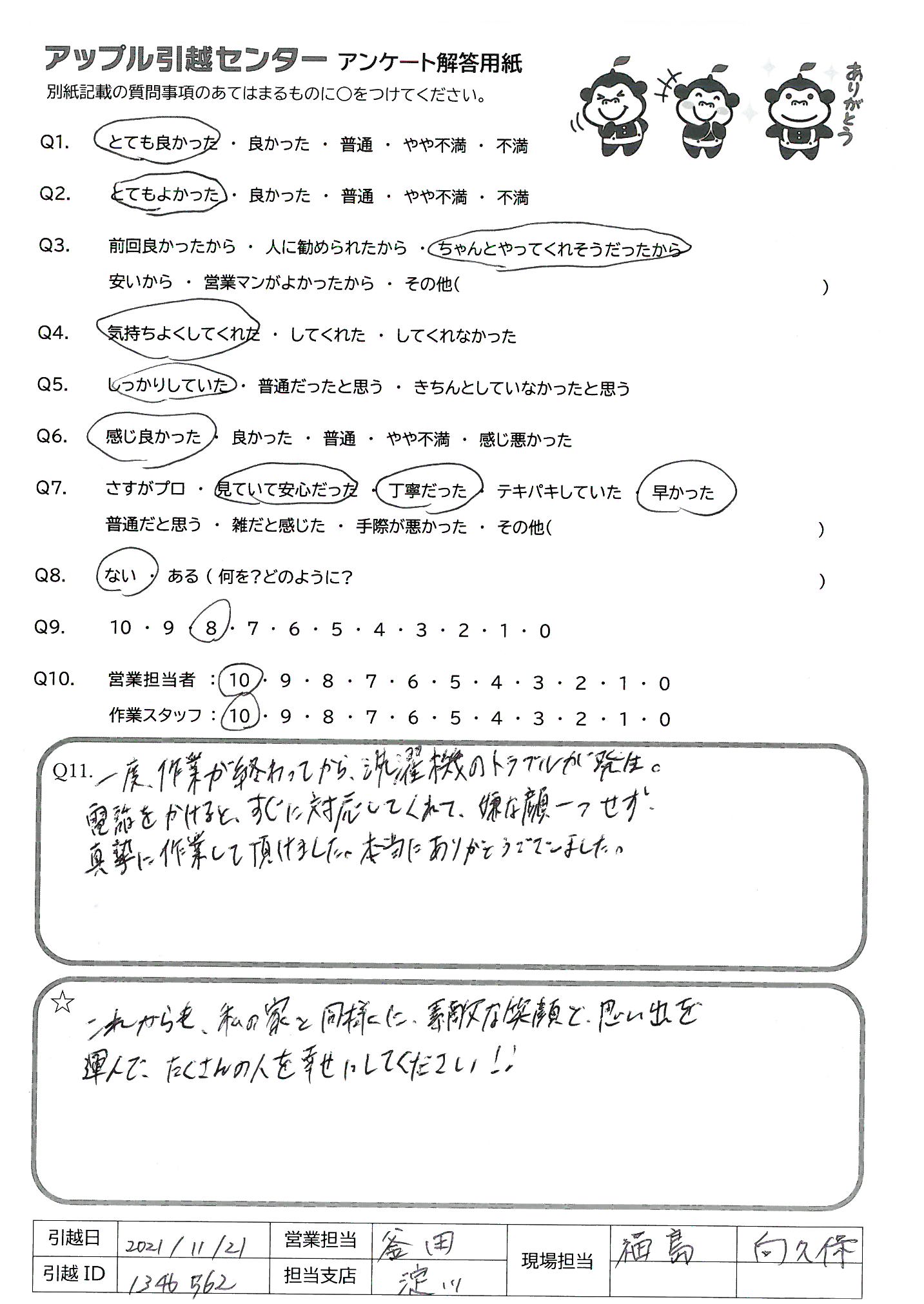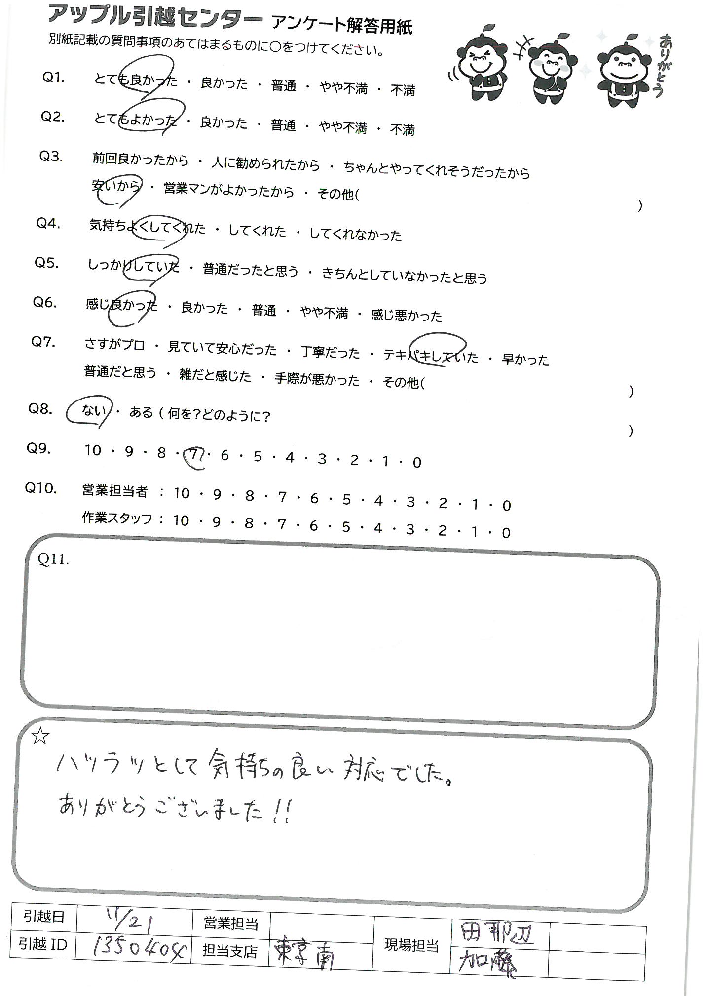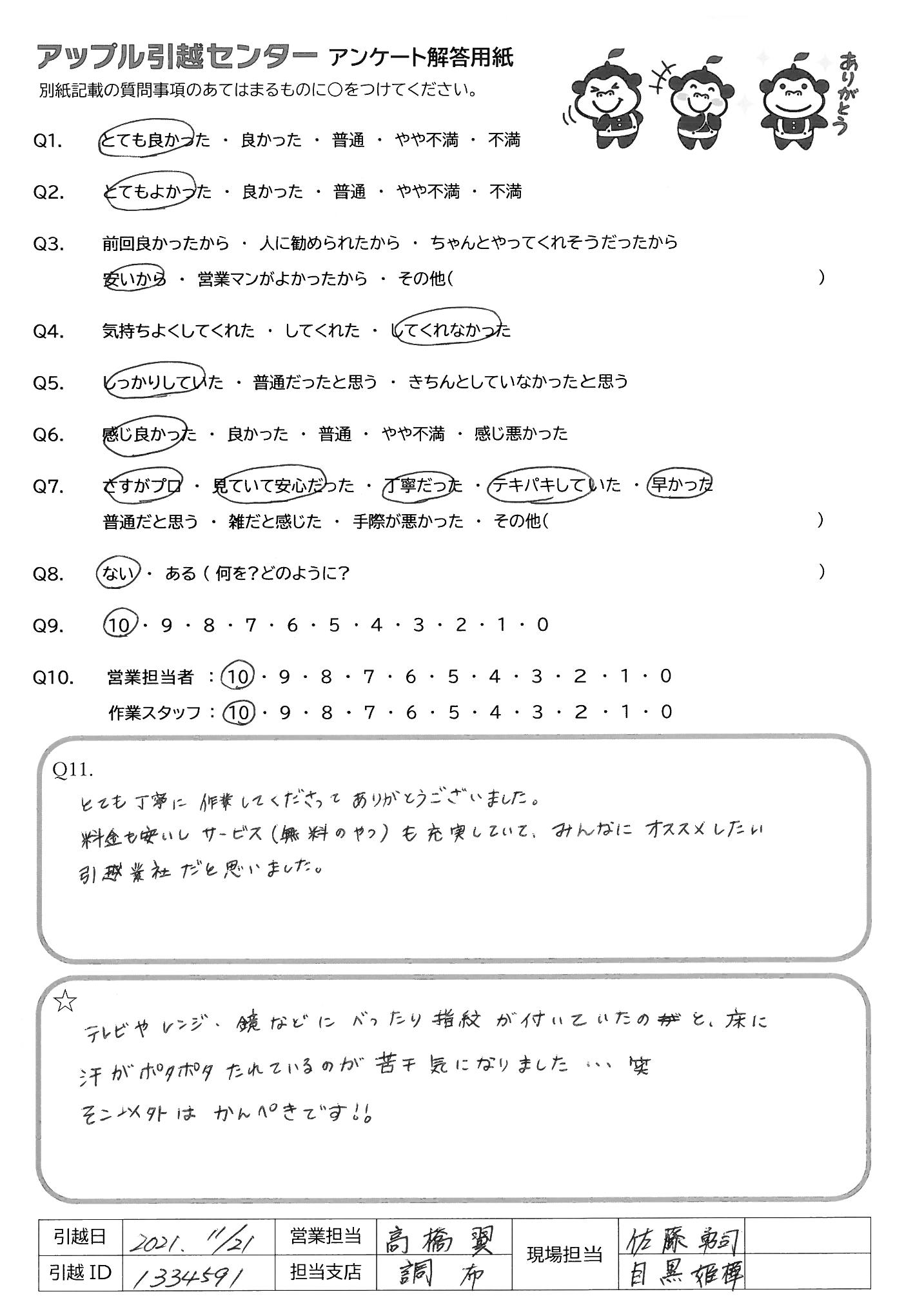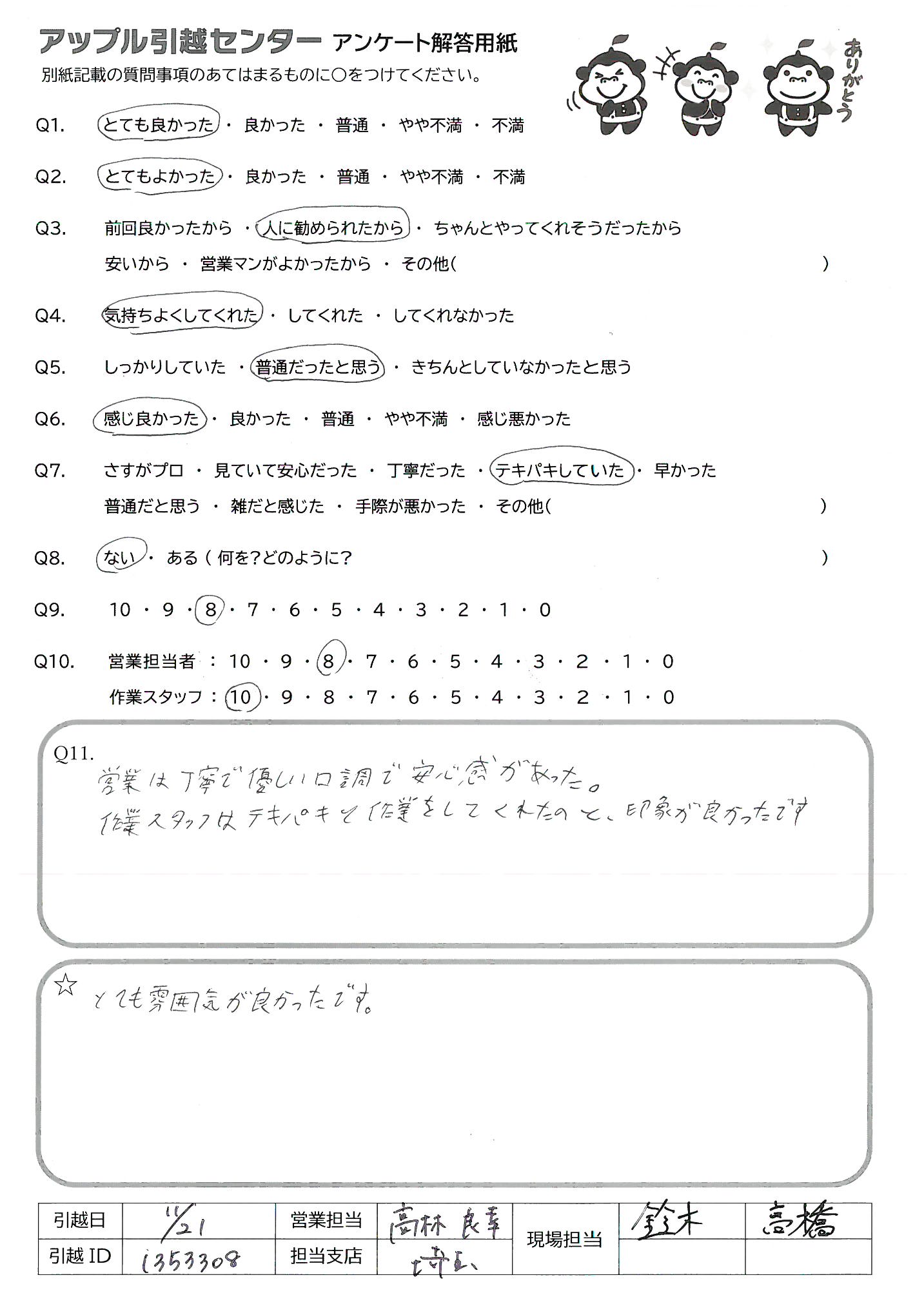 A.Q9)料金がわかりやすく、いつも丁寧に対応してくれるから。 Q10)しっかり丁寧にあいさつしていただいて、作業もテキパキしていてとても気持ちよく引っ越し作業をしていただきました。ありがとうございました!