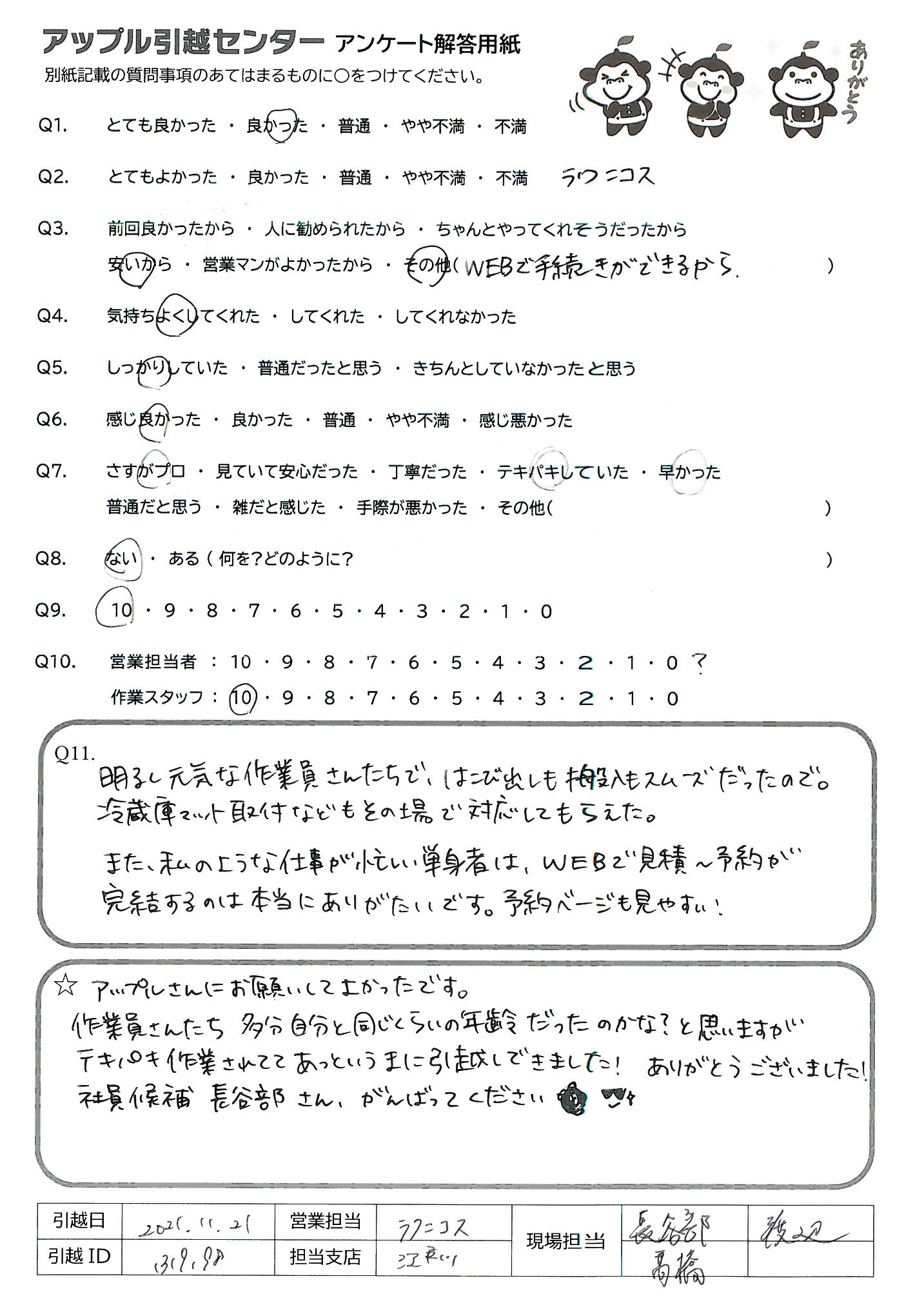A.アップルさんにお願いしてよかったです。 作業員さんたちたぶん自分と同じくらいの年齢だったのかな?と思いますが テキパキ作業されててあっというまに引越しできました!ありがとうございました! 社員候補長谷部さん、がんばってください
